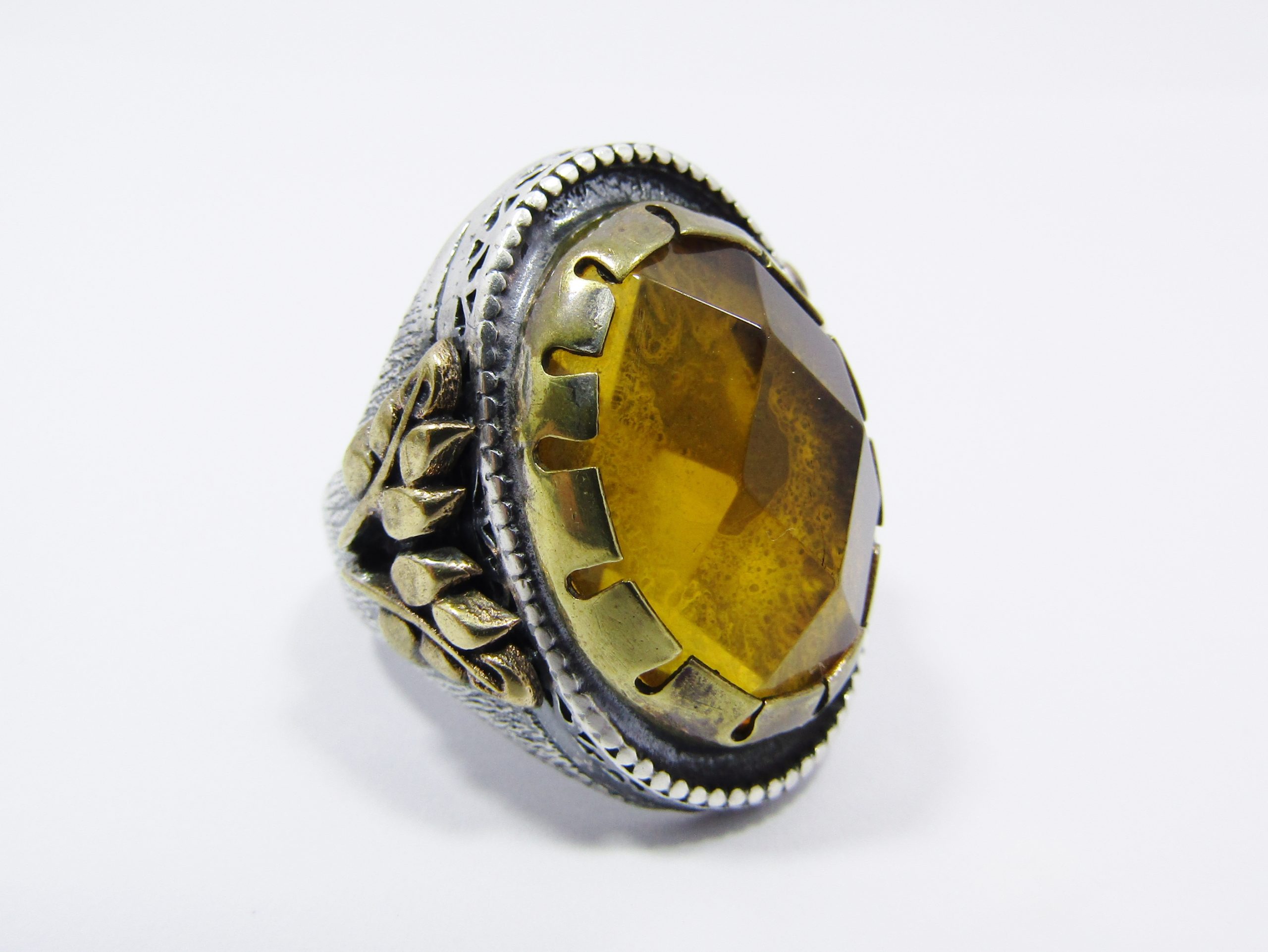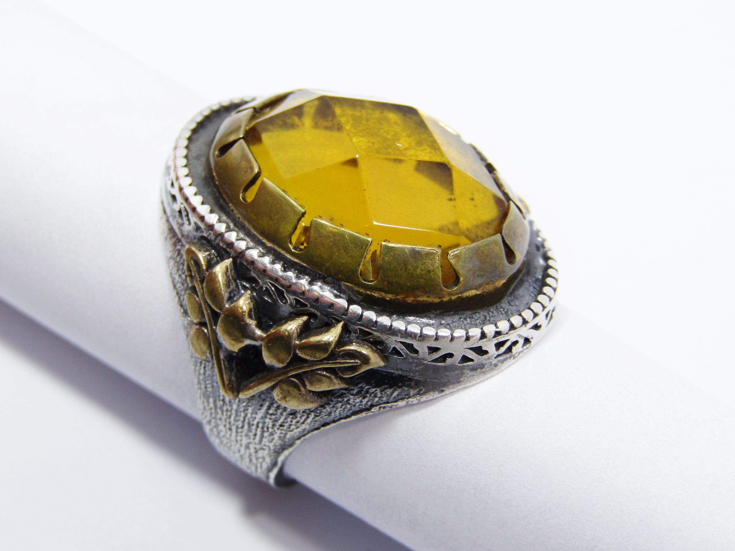 A Beautiful Chunky Two Tone Ring with a Large Yellow paste Stone in Sterling Silver -See photos showing you more detail and design on this amazing Piece -marked accordingly 925 Sterling Silver-made from Sterling Silver Over Brass for detail