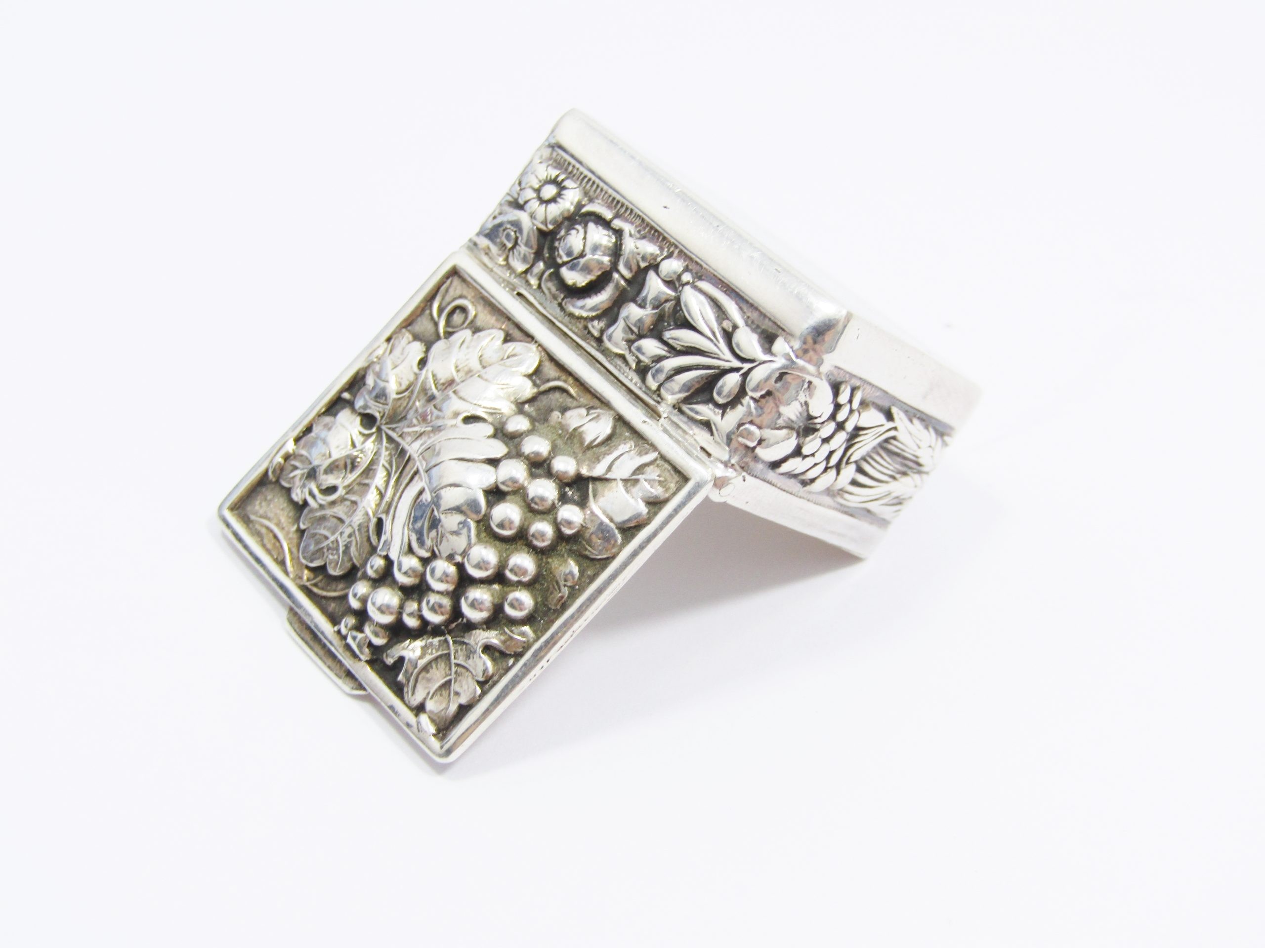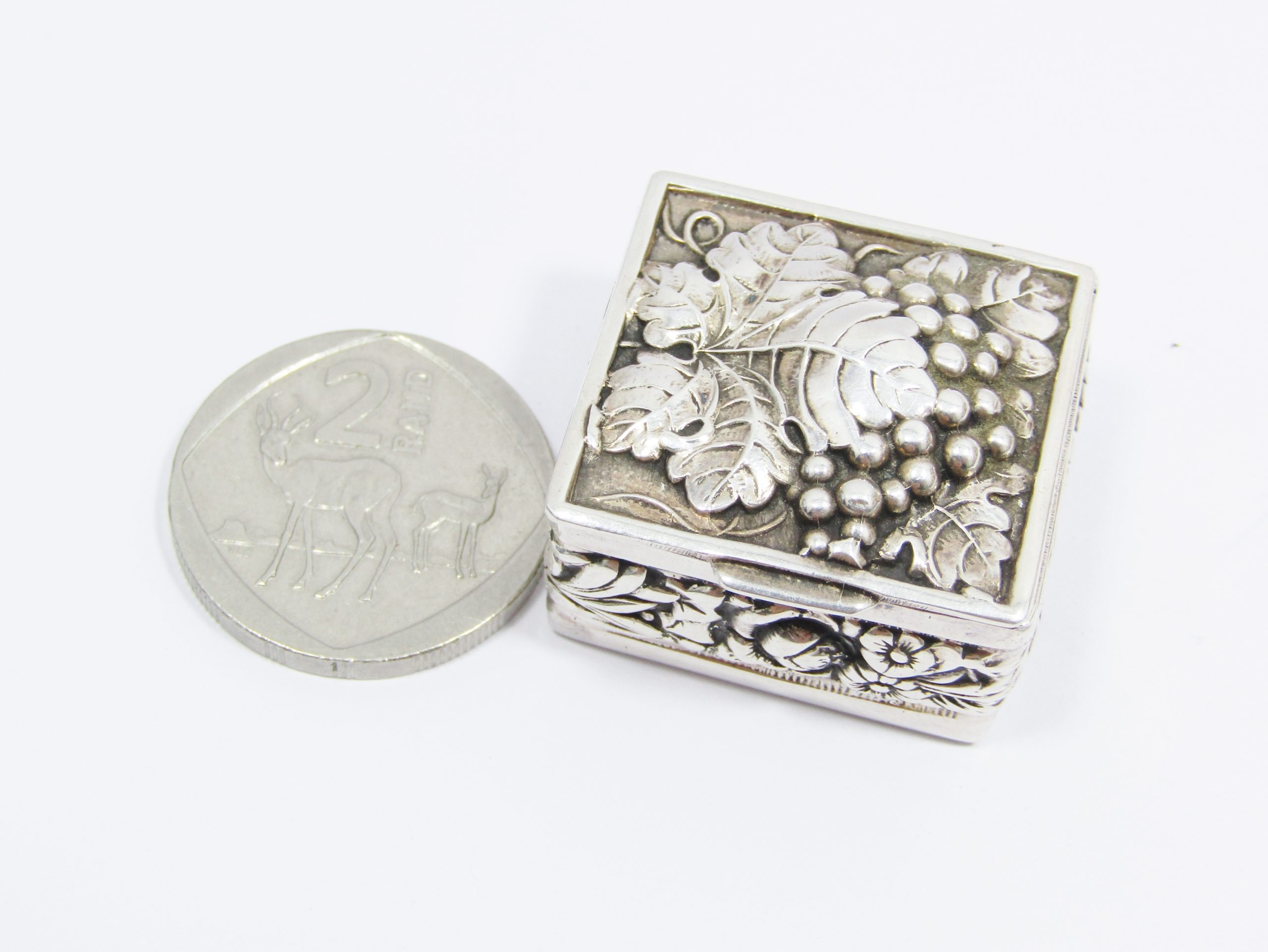 A Beautiful Decorative Pill Box in Sterling Silver -See photos showing us more detail and design on this lovely piece-not marked but tested and verified its Sterling Silver
