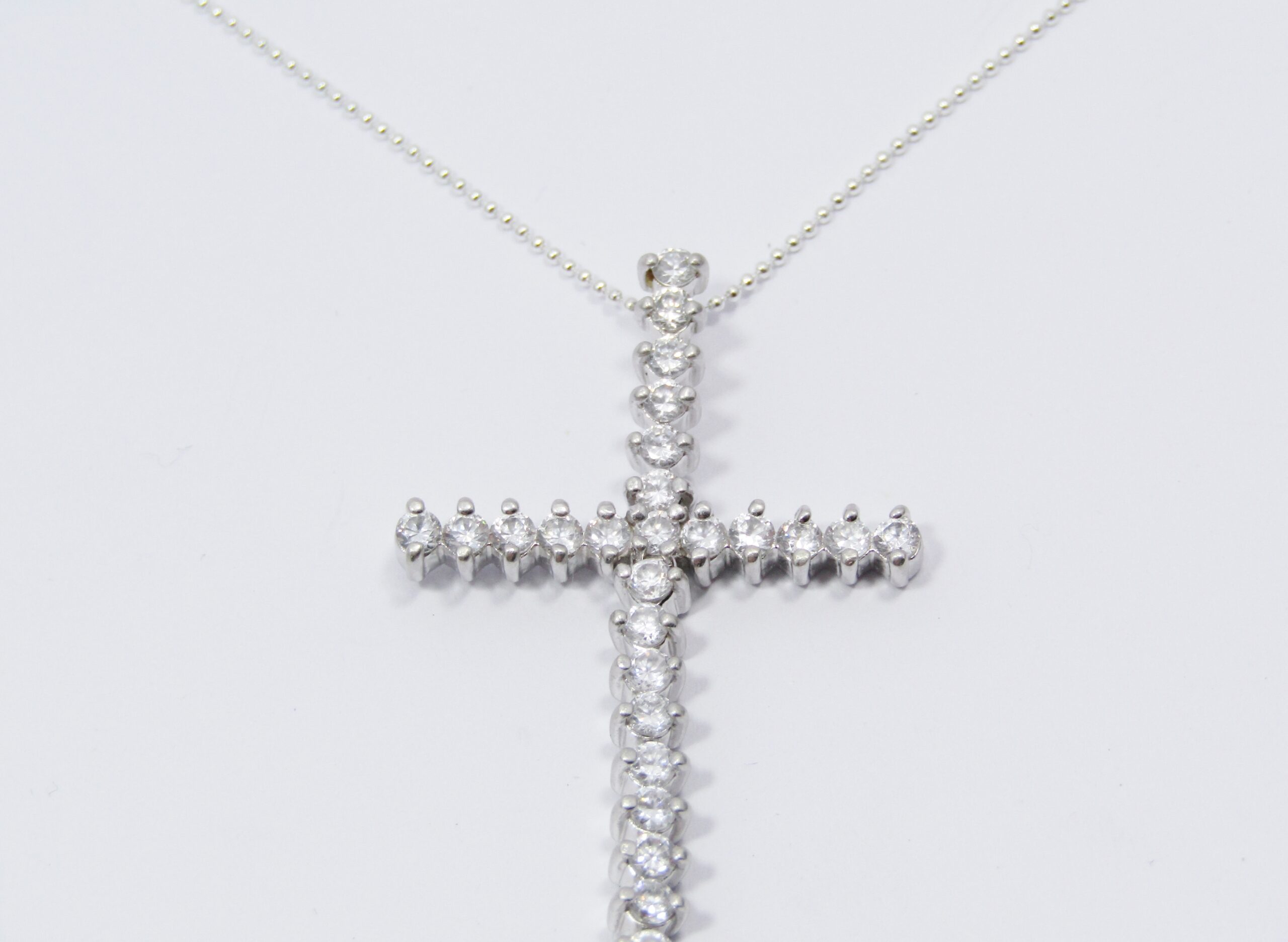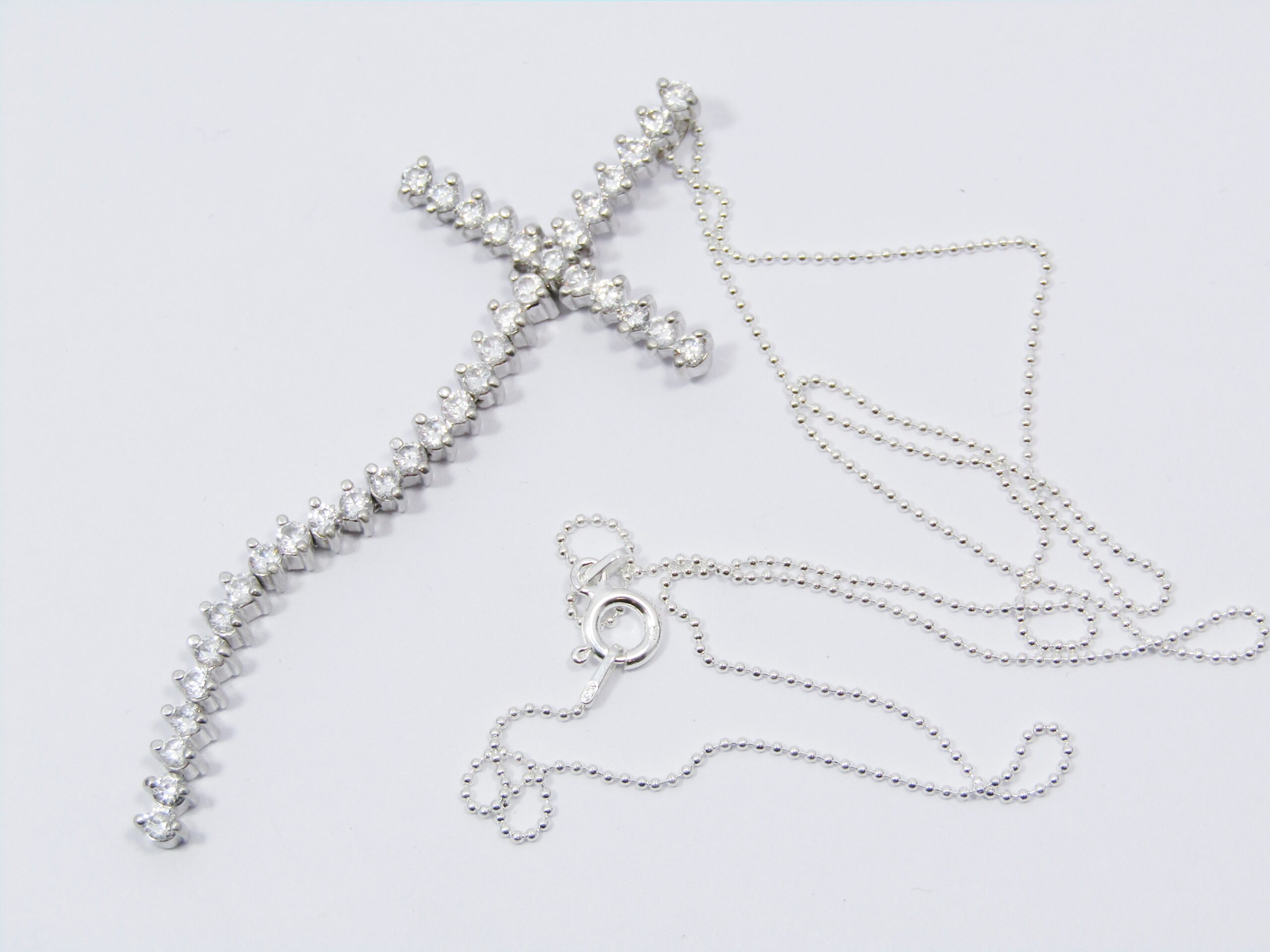 A Beautiful Long Zirconia Cross On Chain in Sterling Silver-See photos showing you more detail and design on this lovely piece where the bottom part of the cross is long and it Dangles -marked accordingly 925 Sterling Silver.