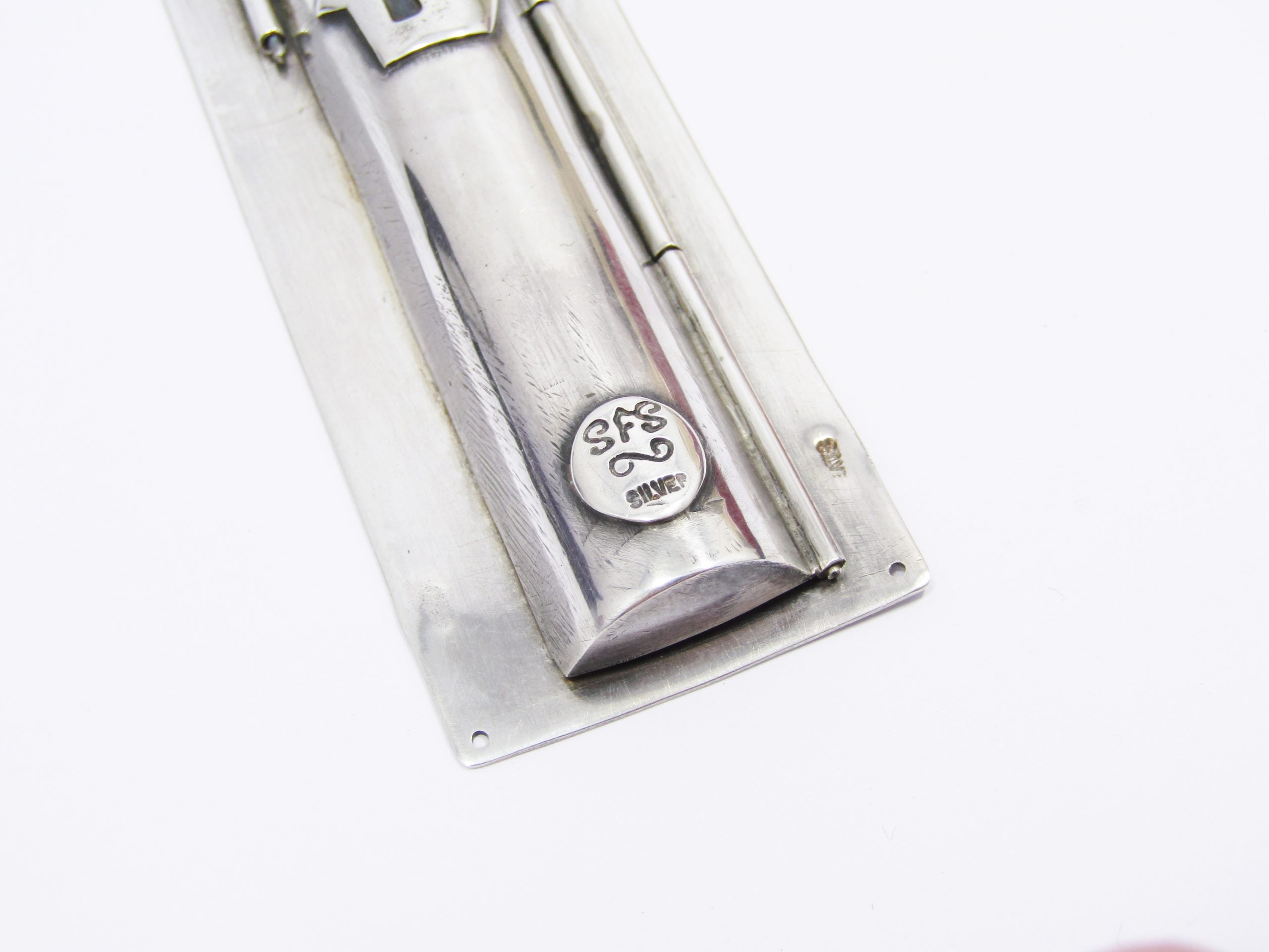 A Beautiful Mezuzah Prayer holder in Sterling Silver See photos showing you more detail and design on this amazing Piece -A mezuzah on a door signifies a Jewish home, serving as a visible reminder of faith, God's presence, and Jewish identity-Unfortunately there is not a scroll prayer inside but can be purchased at any Jewish Religious stores- Marked accordingly SILVE and the Makers Mark for Silver