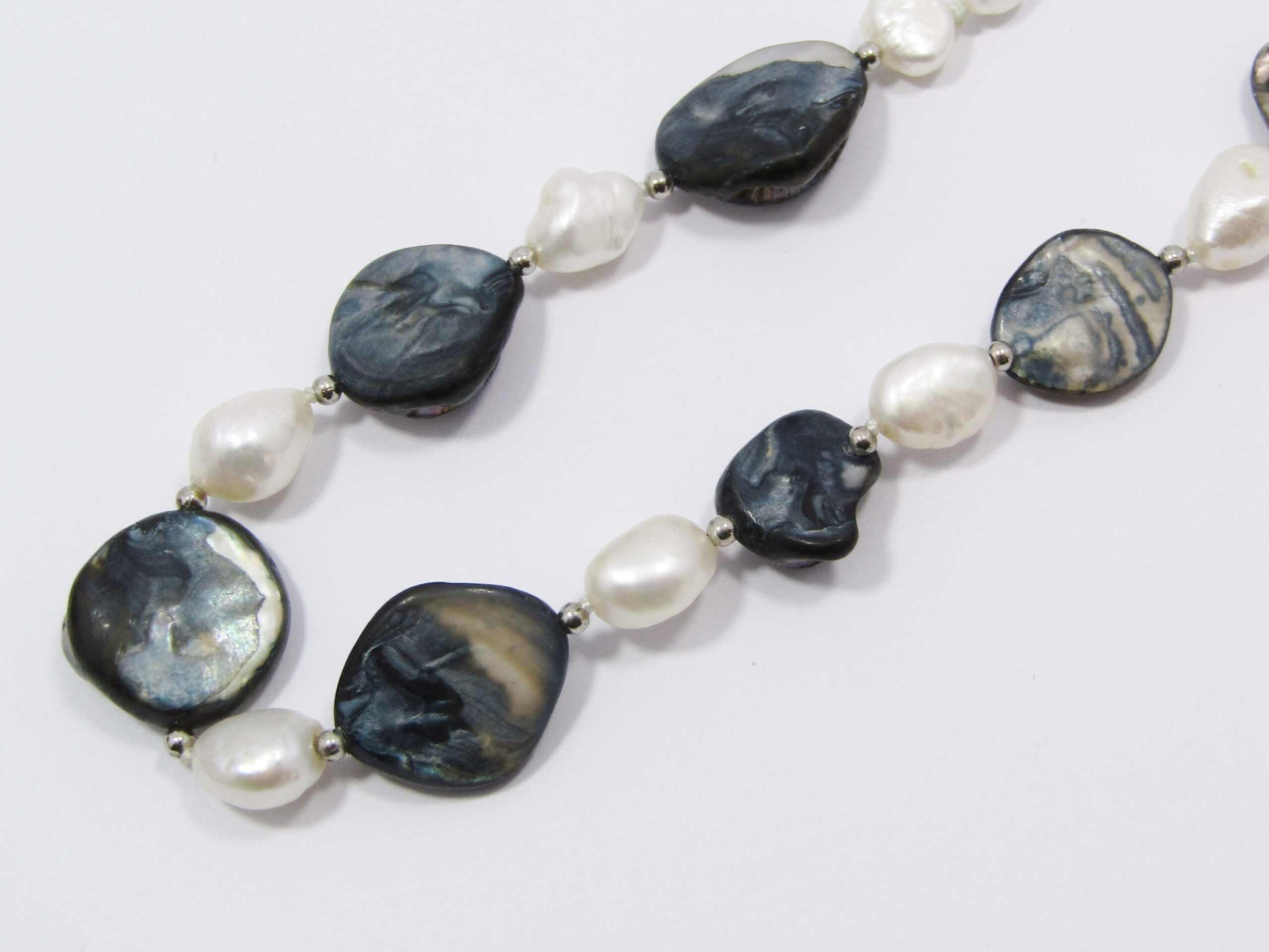 A Gorgeous Baroque Pearls And Mother of Pearl Necklace With a Sterling Silver Clasp-See photos showing you more detail and design on this amazing necklace