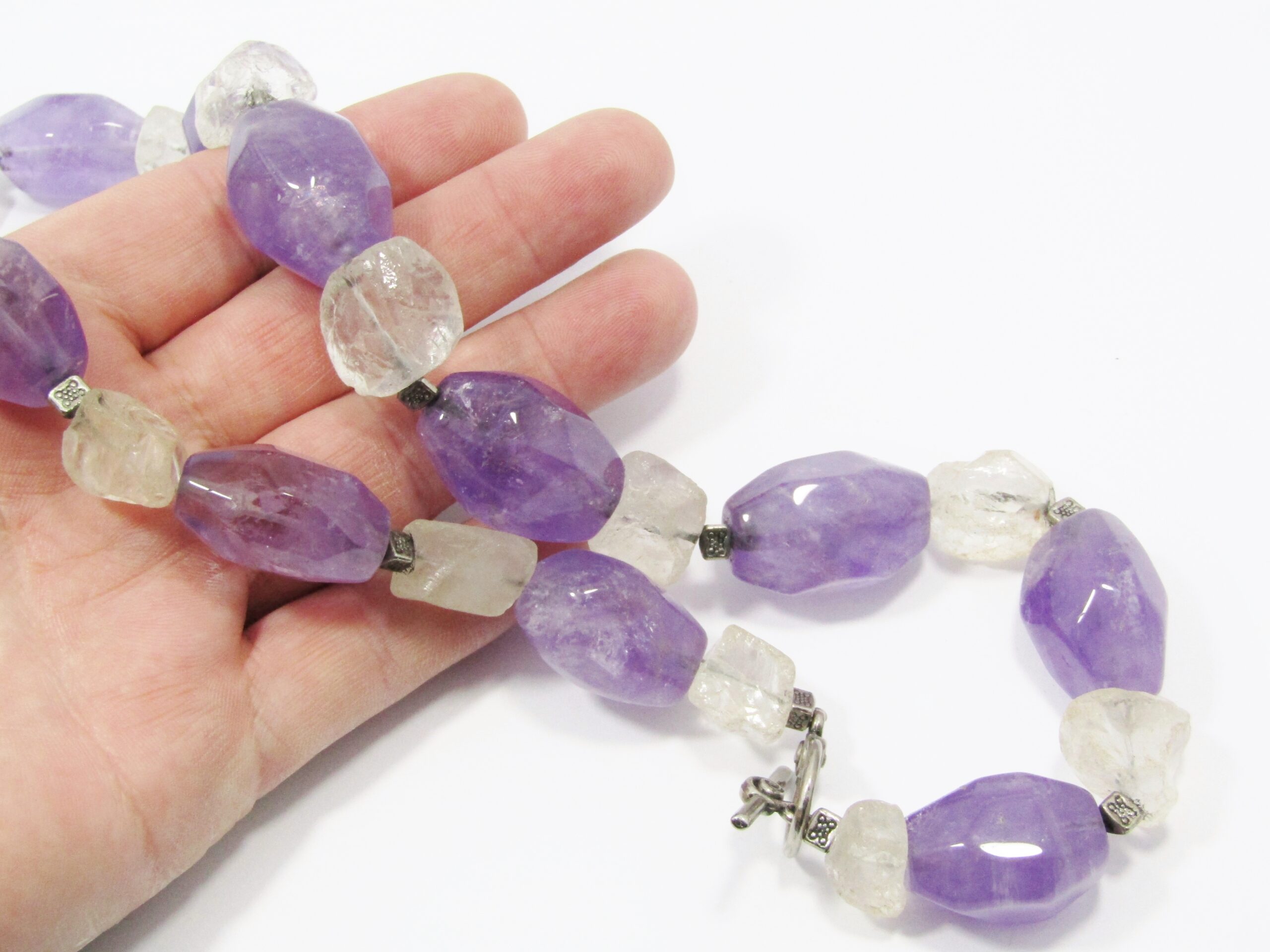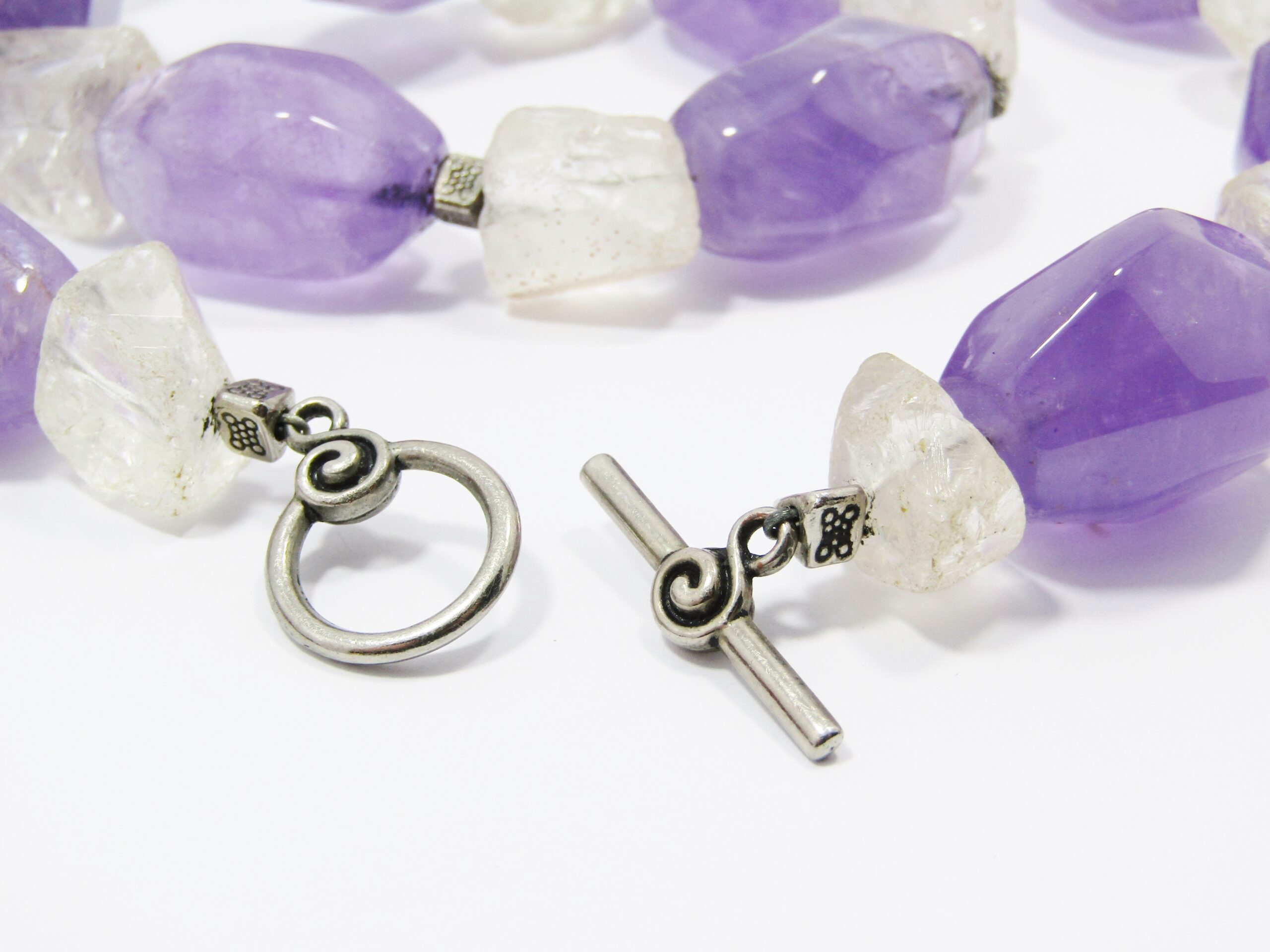 A Gorgeous Chunky Amethyst And Clear Rock Crystal Necklace -See photos showing you more detail and design on this amazing piece-the clasp is a Silver tone T bar clasp made from a none precious metal