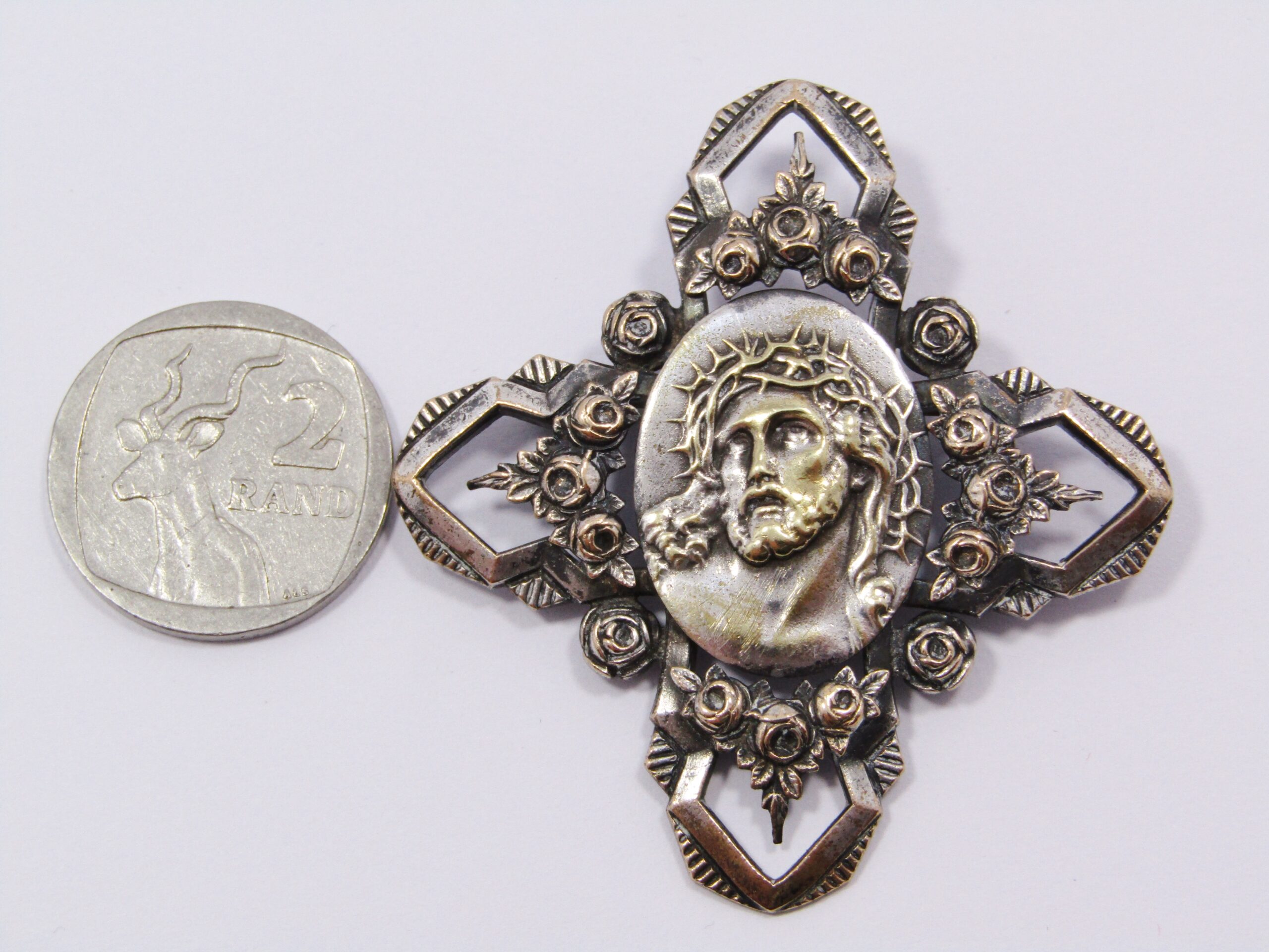 A Gorgeous Detailed Religious Two tone Brooch-See photos showing you more detail and design on this amazing piece -made from a Silver none precious metal and a brass tone