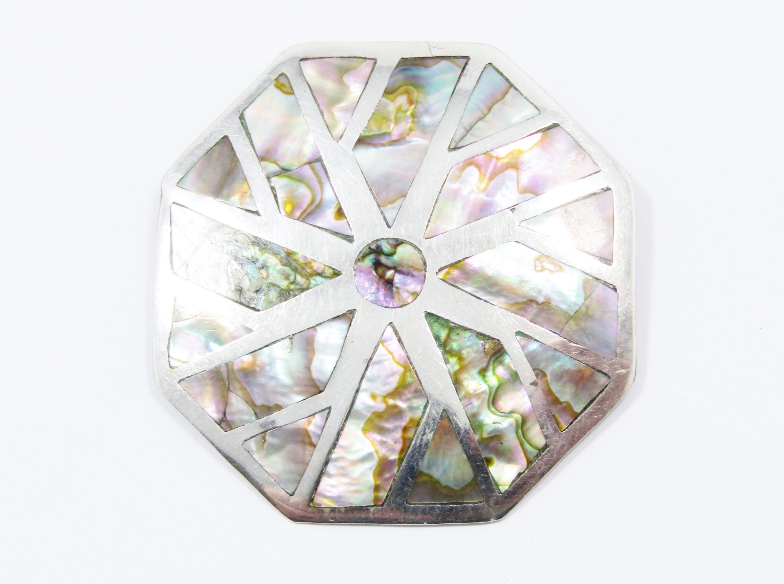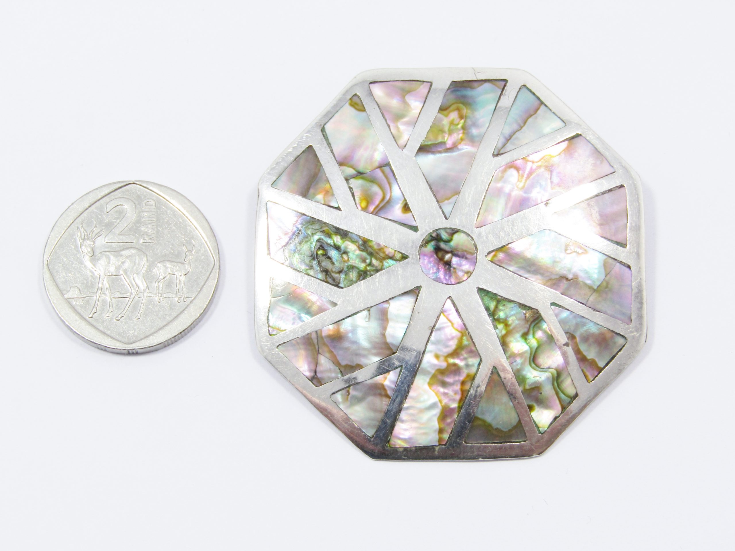 A Gorgeous Huge Abalone Shell inlay Pendant/ Brooch in Sterling Silver-See photos showing you more detail and design on this amazing piece -marked accordingly 925 MEXICO