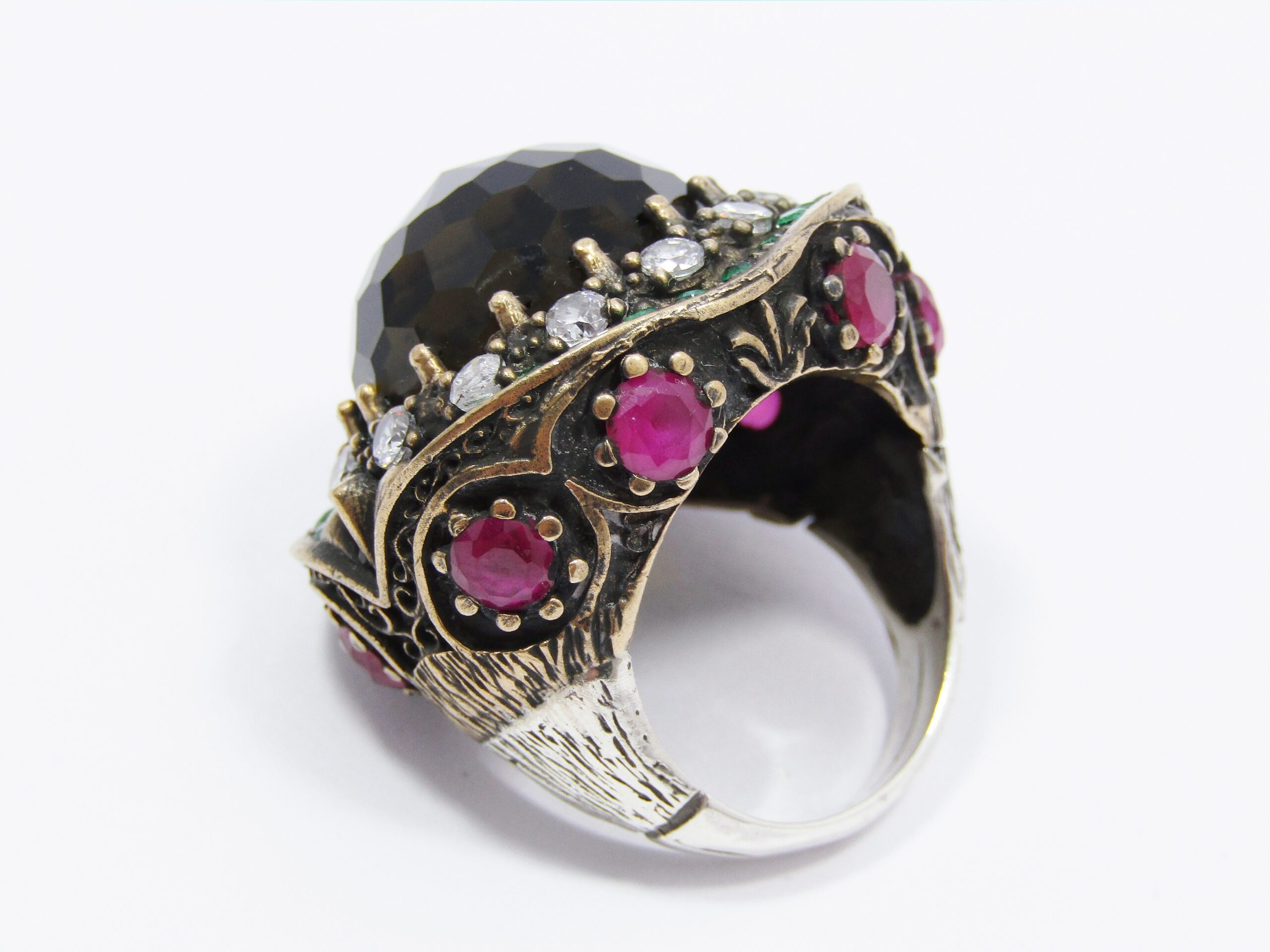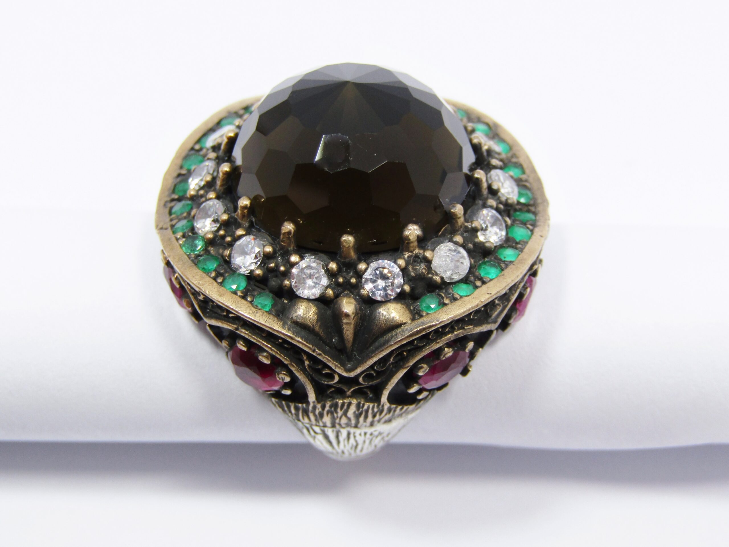 A Gorgeous Huge Facetted Smokey Color Crystal Surrounded With Pink Green and Clear Crystals in Sterling Silver-See photos showing you more detail and design on this Amazing Piece -made up in a two tone Copper over Sterling Silver.