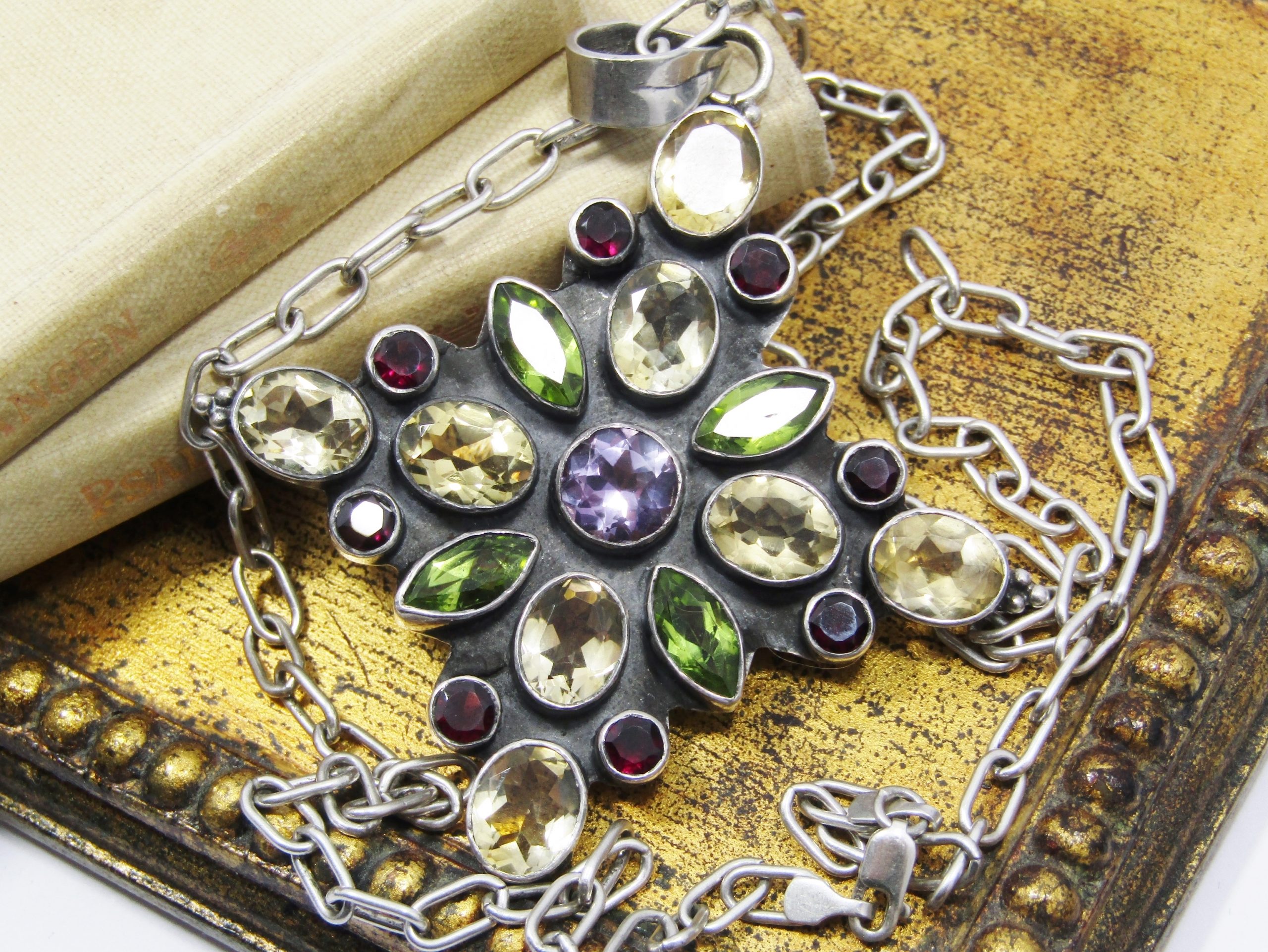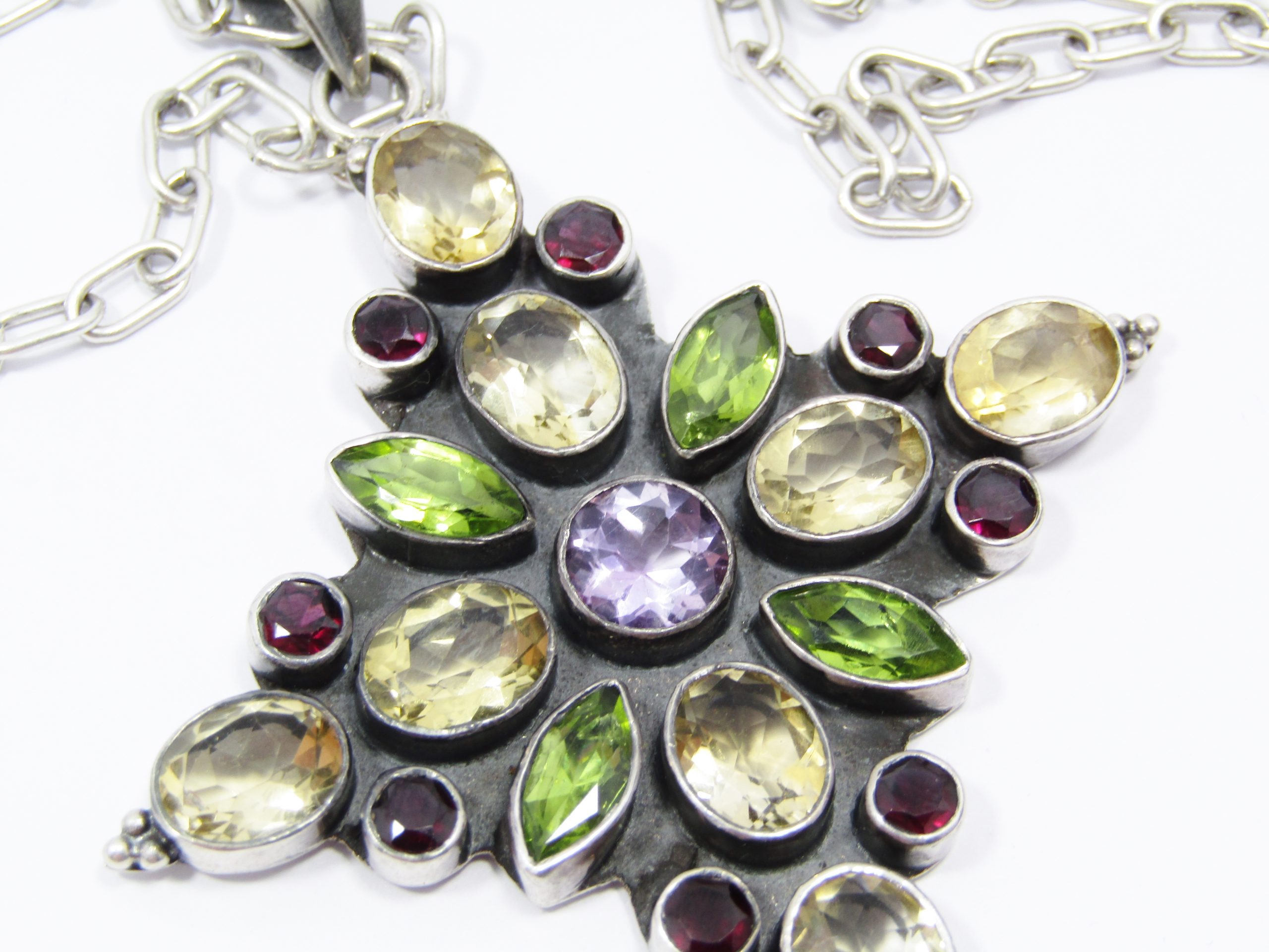 A Gorgeous Huge Gemstone Pendant on Chain in Sterling Silver -See photos showing you more detail and design on this Beautiful Piece -marked accordingly 925 Sterling Silver-The Pendant is set with Citrines, Garnets, Peridots and Amethysts