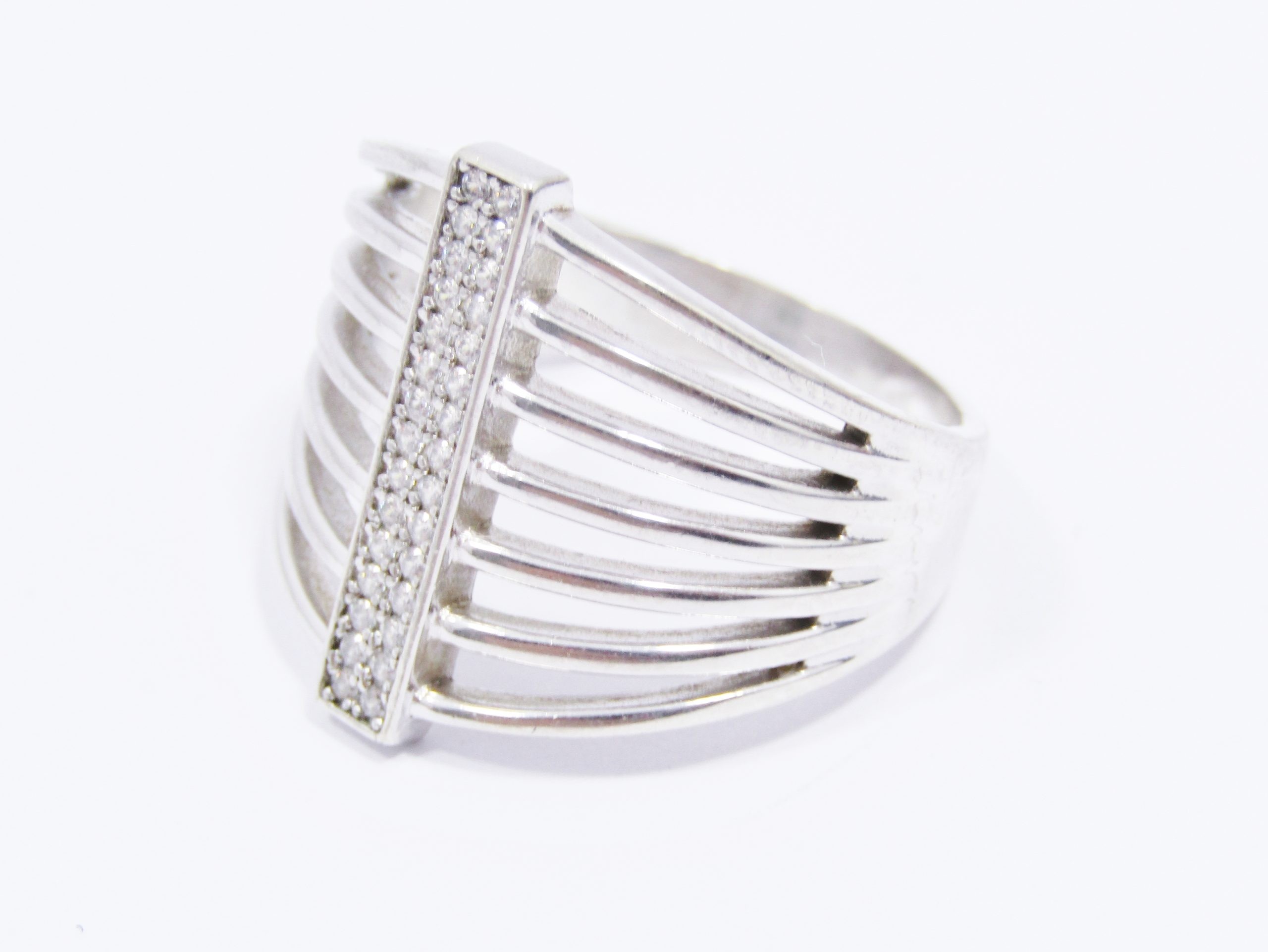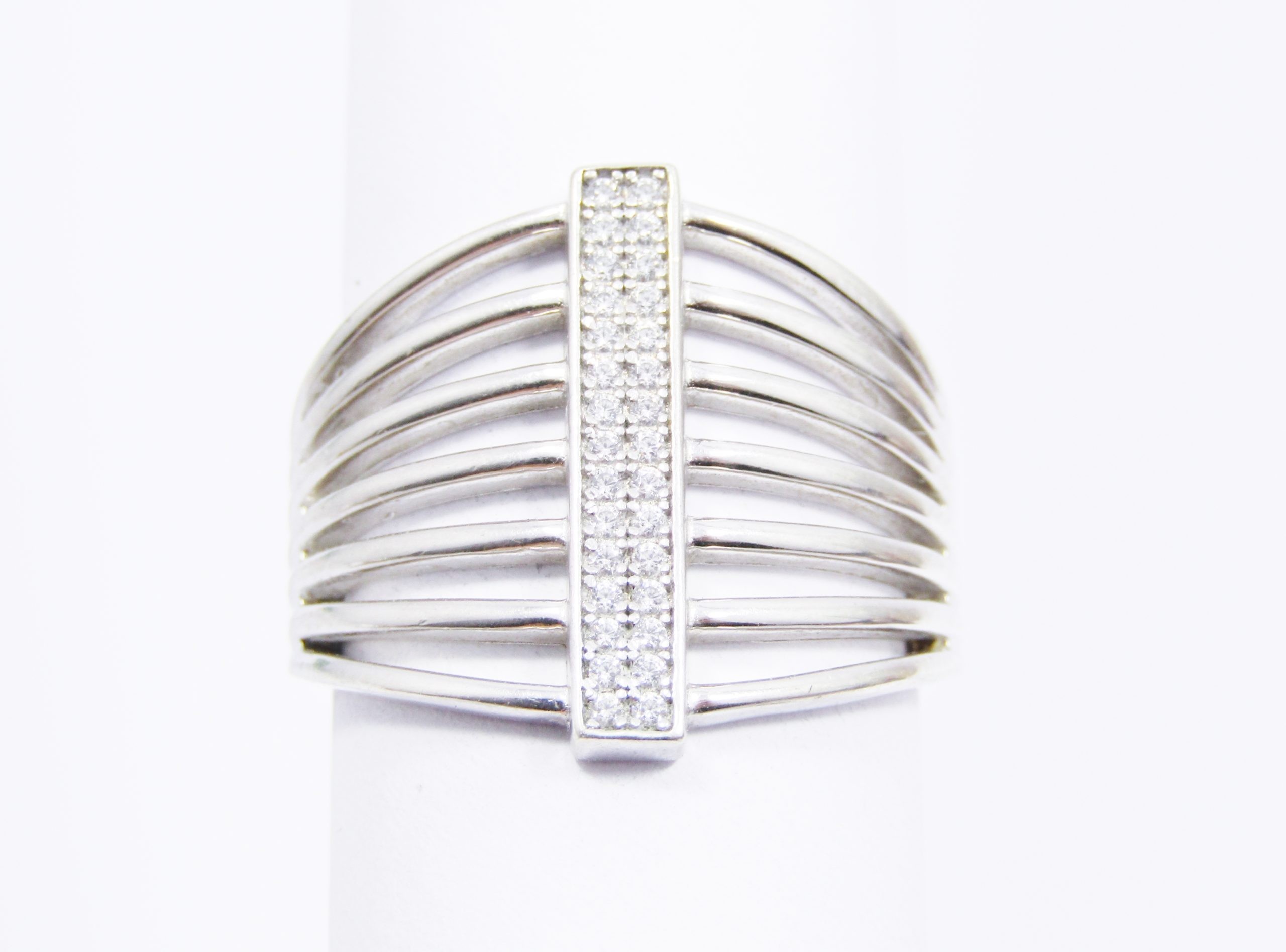 A Gorgeous Multi Band into One in Sterling Silver -See photos showing you more detail and design on this amazing piece -whit multi bands into one with a row of zirconia's down the center
