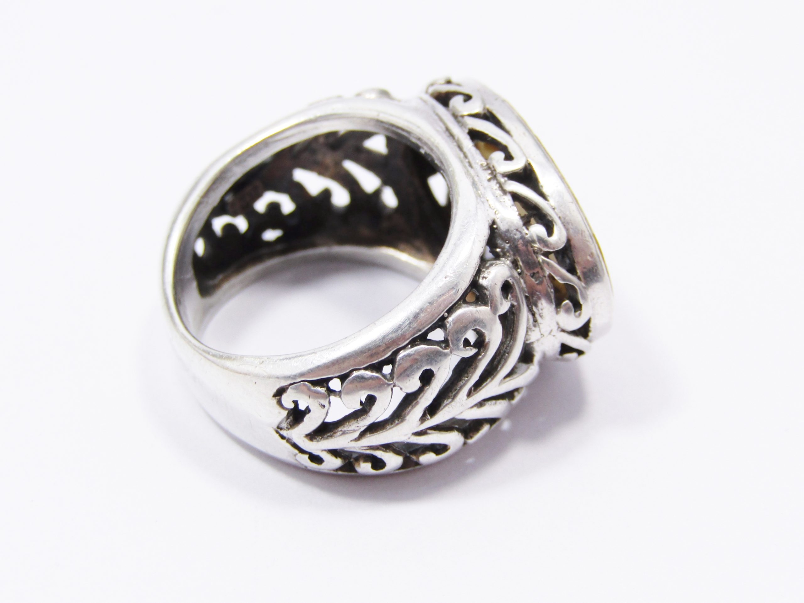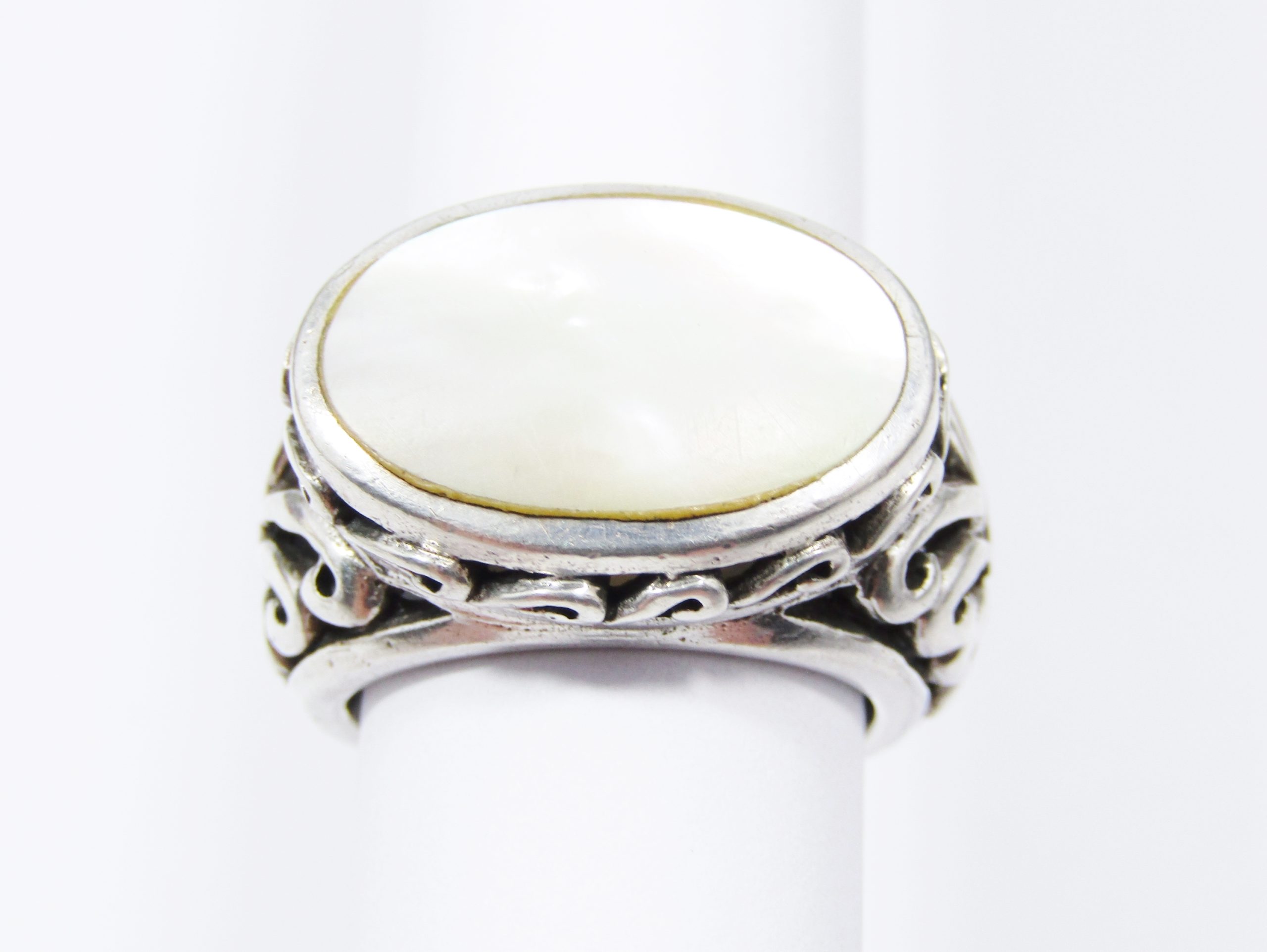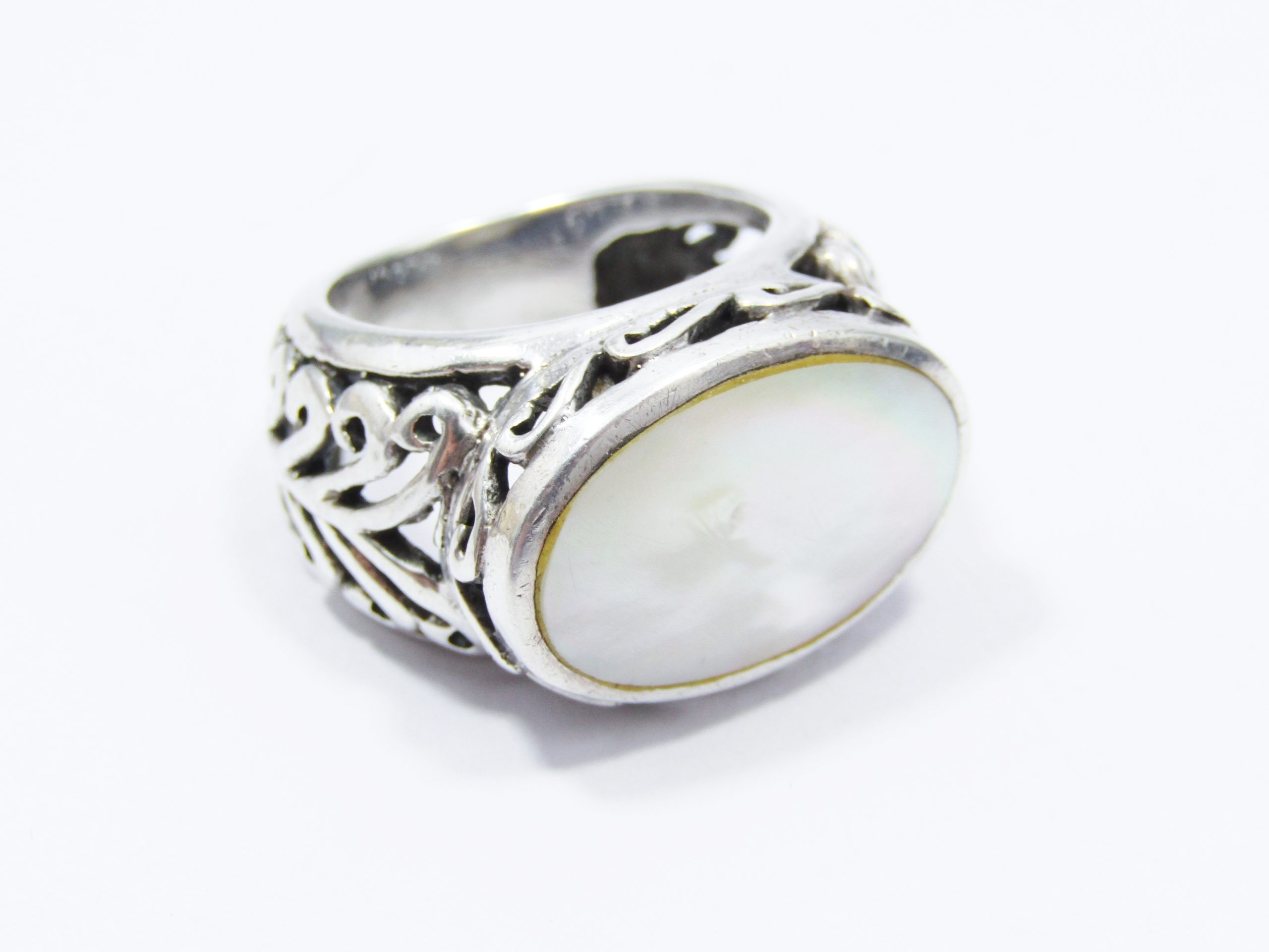 A Gorgeous Oval Mother of Pearl Ring in Sterling Silver-See photos showing you more detail and design on this amazing piece -marked accordingly 925 Sterling Silver