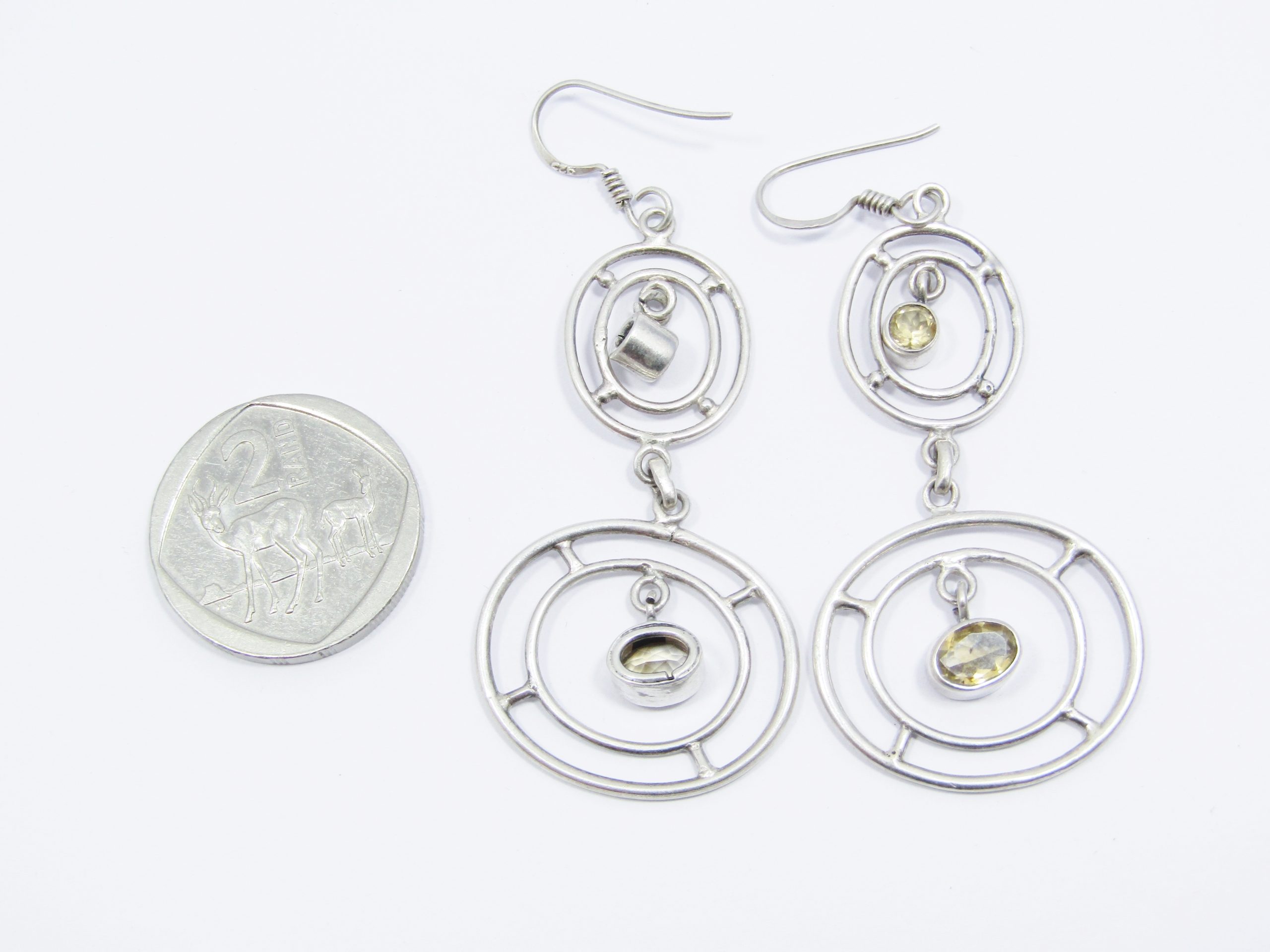 A Gorgeous Pair of Circle Dangling Earrings with Citrine Gemstones in Sterling Silver -See photos showing you more detail and design on this Amazing Pair -marked accordingly 925 Sterling Silver.
