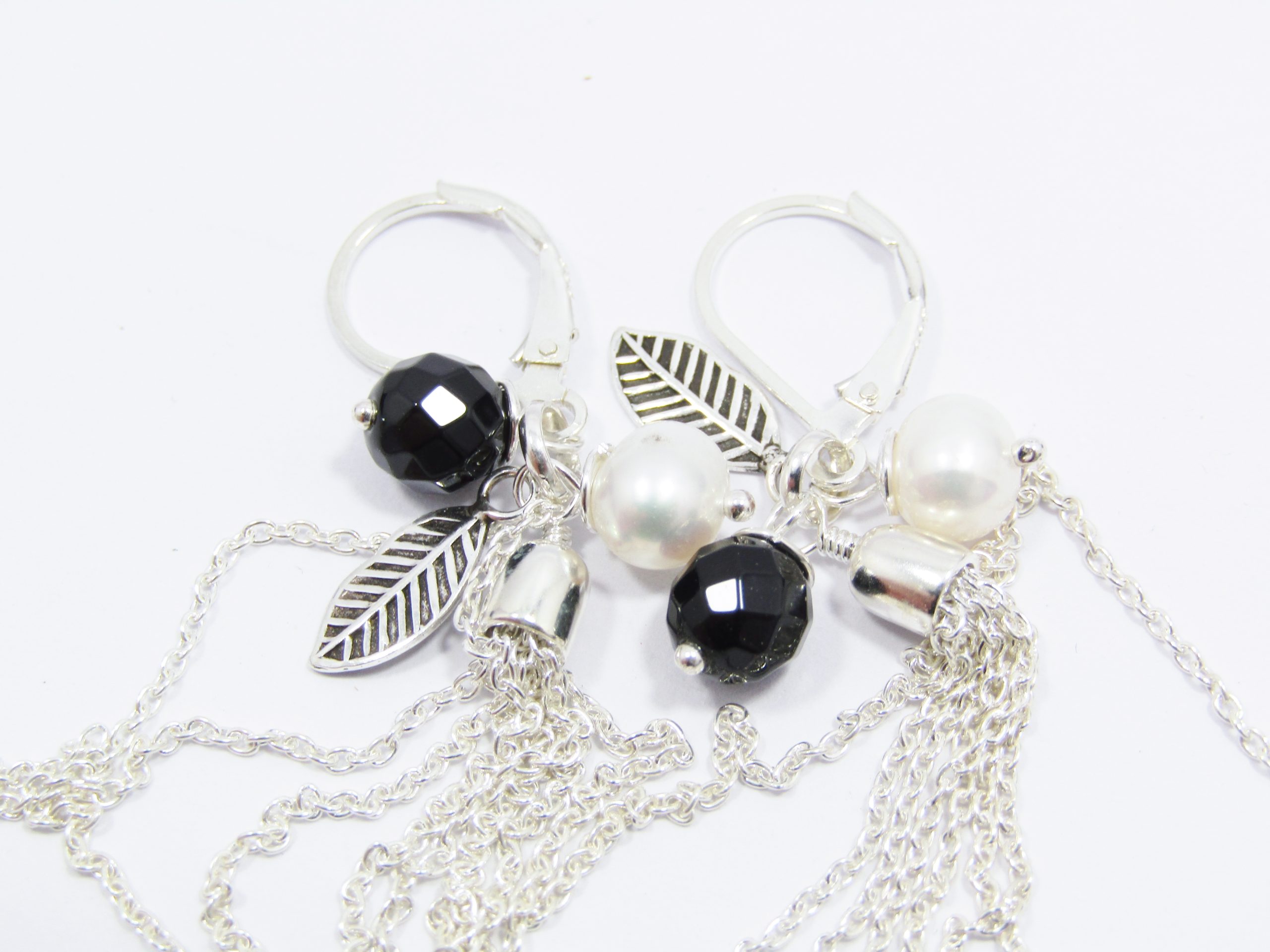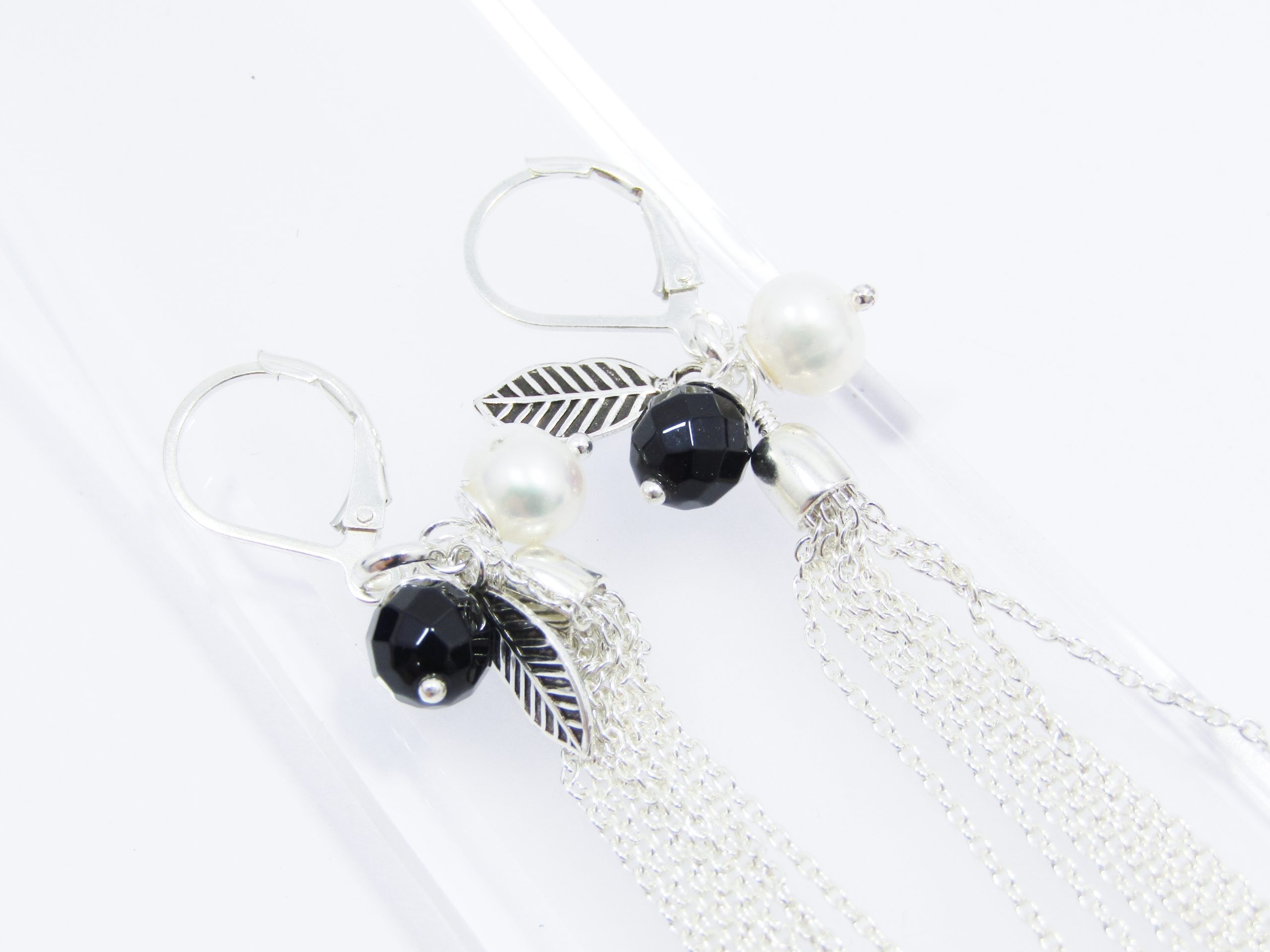 A Gorgeous Pair of Fresh Water Pearl and Obsidian Bead Tassel Earrings in Sterling Silver-See photos showing you more detail and design on this amazing Piece With the pearl and Obsidian and a tiny feather detail -this pair is just amazing -marked accordingly 925 sterling Silver