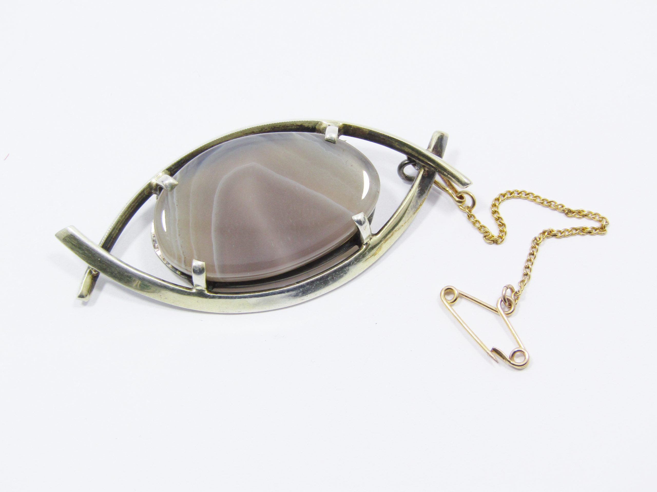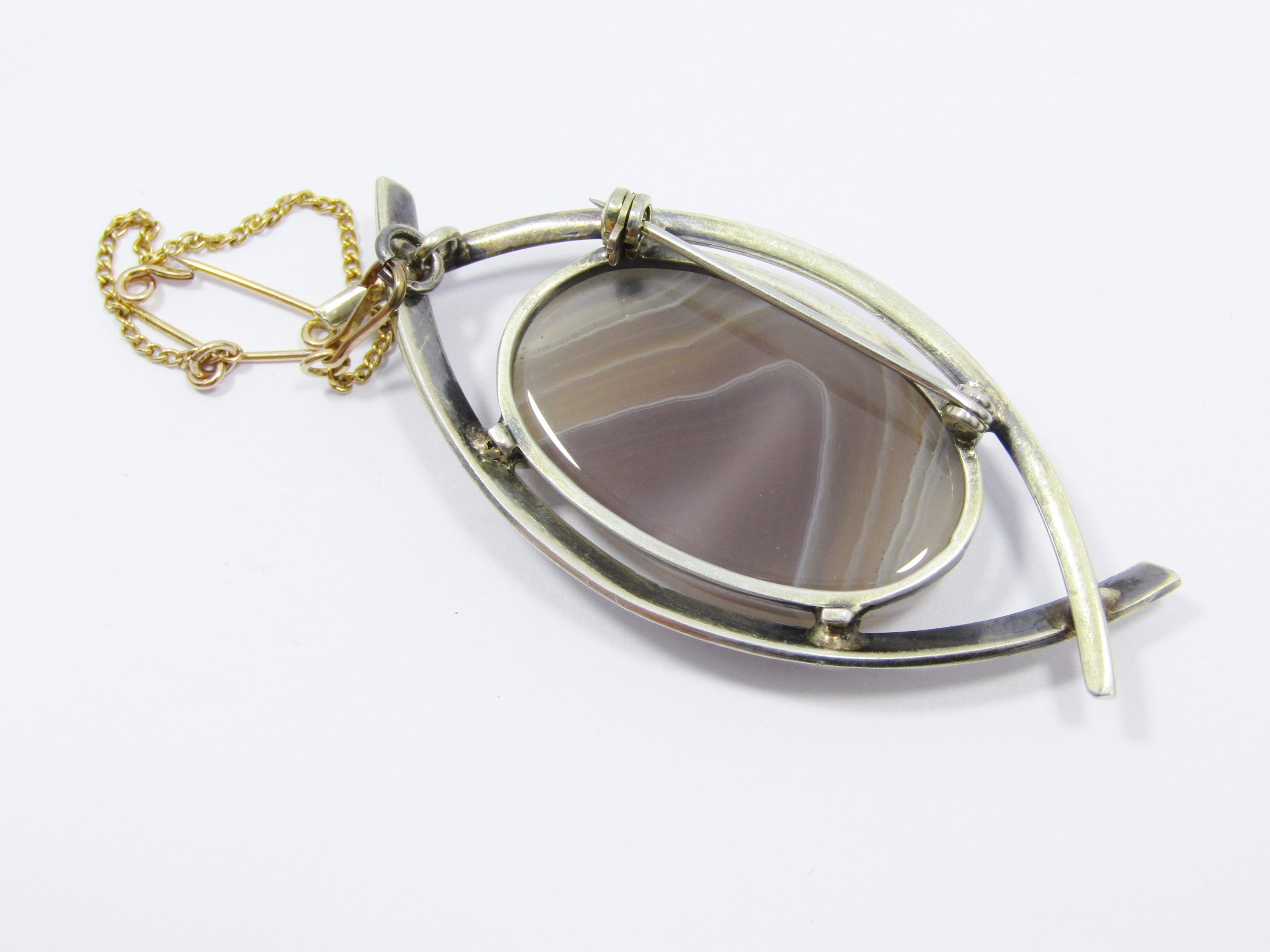 A Gorgeous Vintage Design Brooch a huge Agate Stone in Sterling Silver -See photos showing you more detail and design on this amazing Piece -The Piece is not marked but tested and verified its Sterling Silver.
