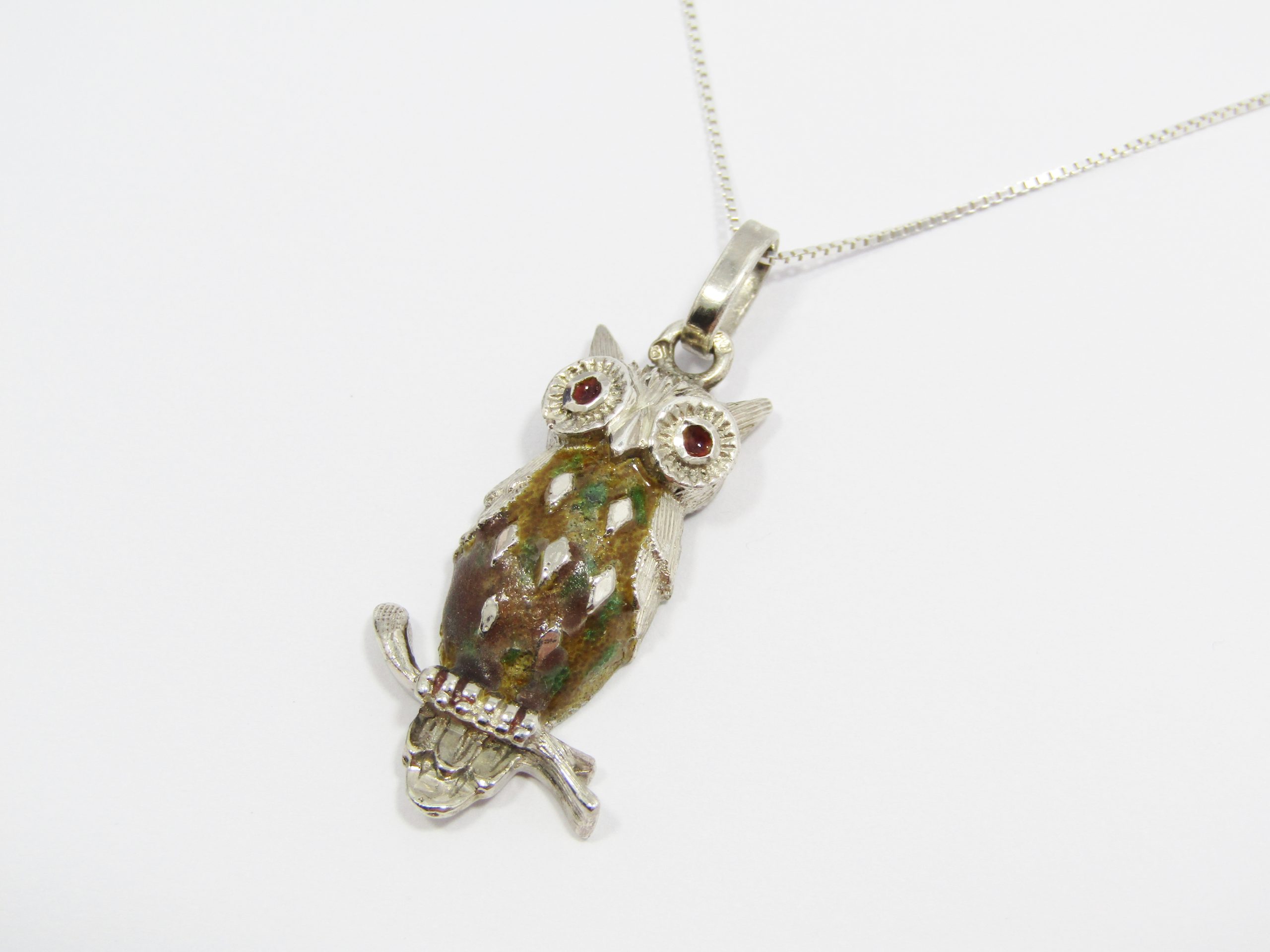 A Lovely Large Enamel Owl Pendant On Chain in Sterling Silver -See photos showing you more detail and design on this amazing Piece -marked accordingly 925 Sterling Silver.