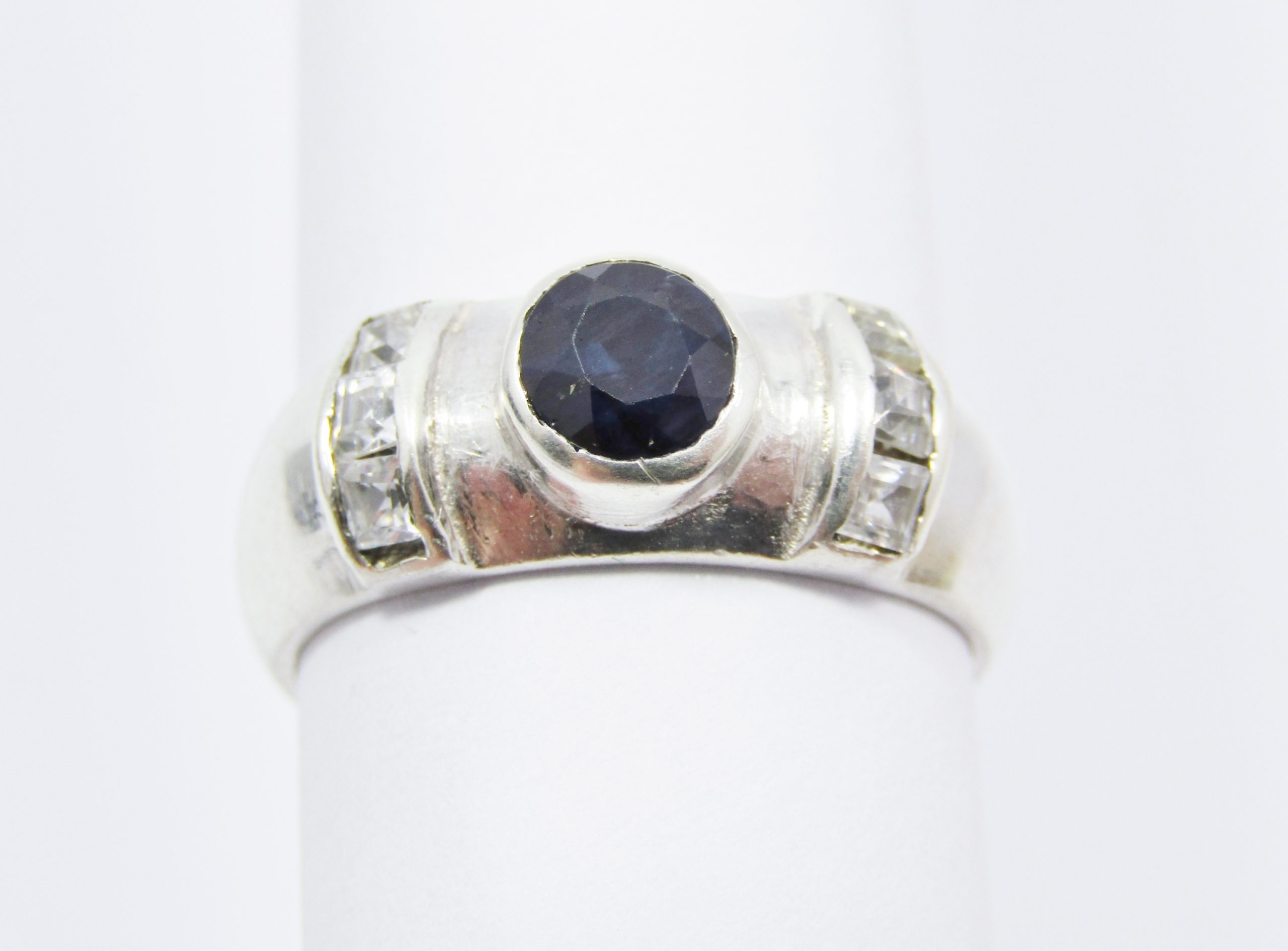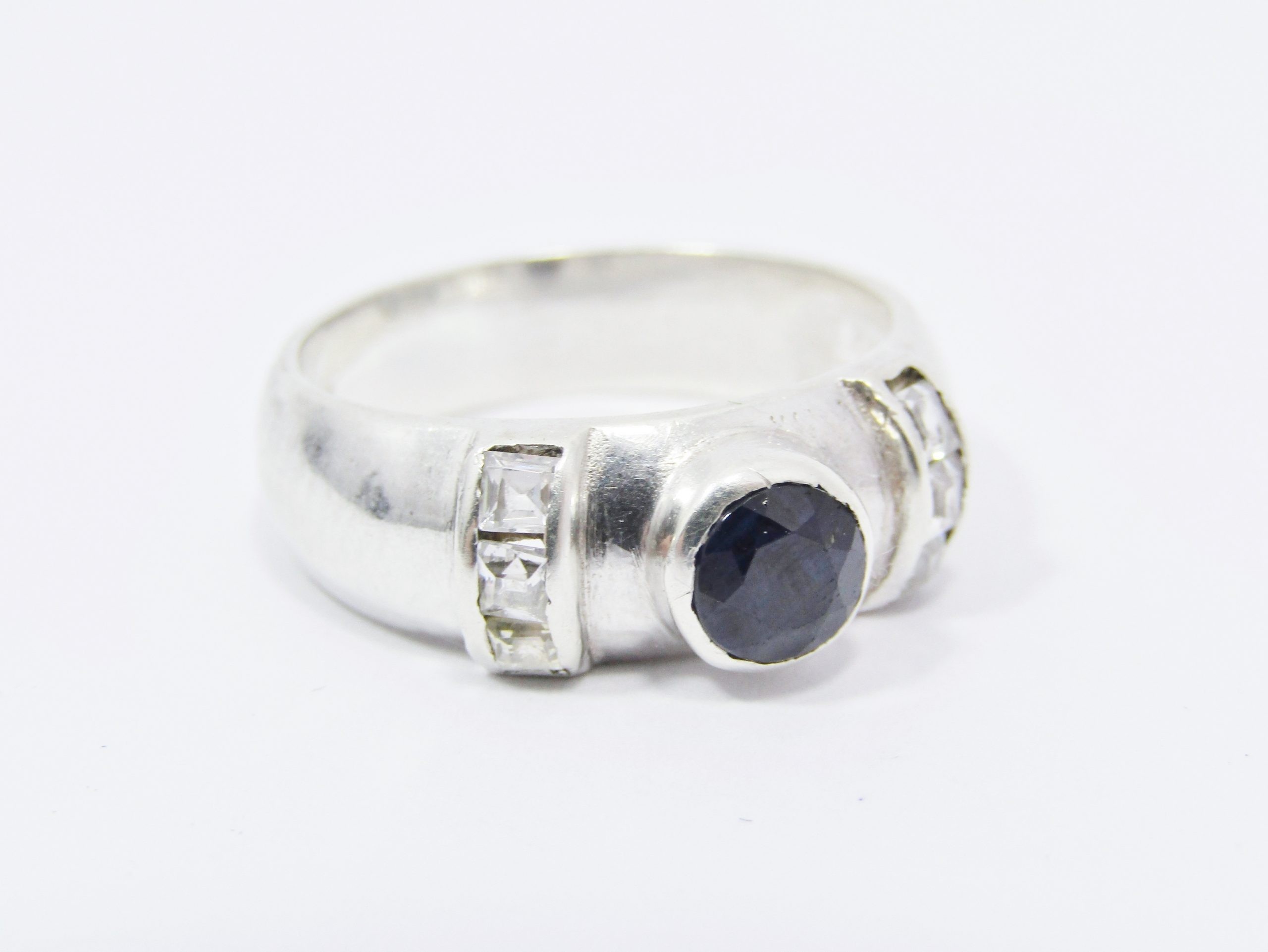 A Lovely Opaque Sapphire Ring in Sterling Silver-See photos showing you more detail and design on this very pretty piece -Set with tiny clear Zirconia's for sparkle - marked accordingly 925 Sterling Silver.
