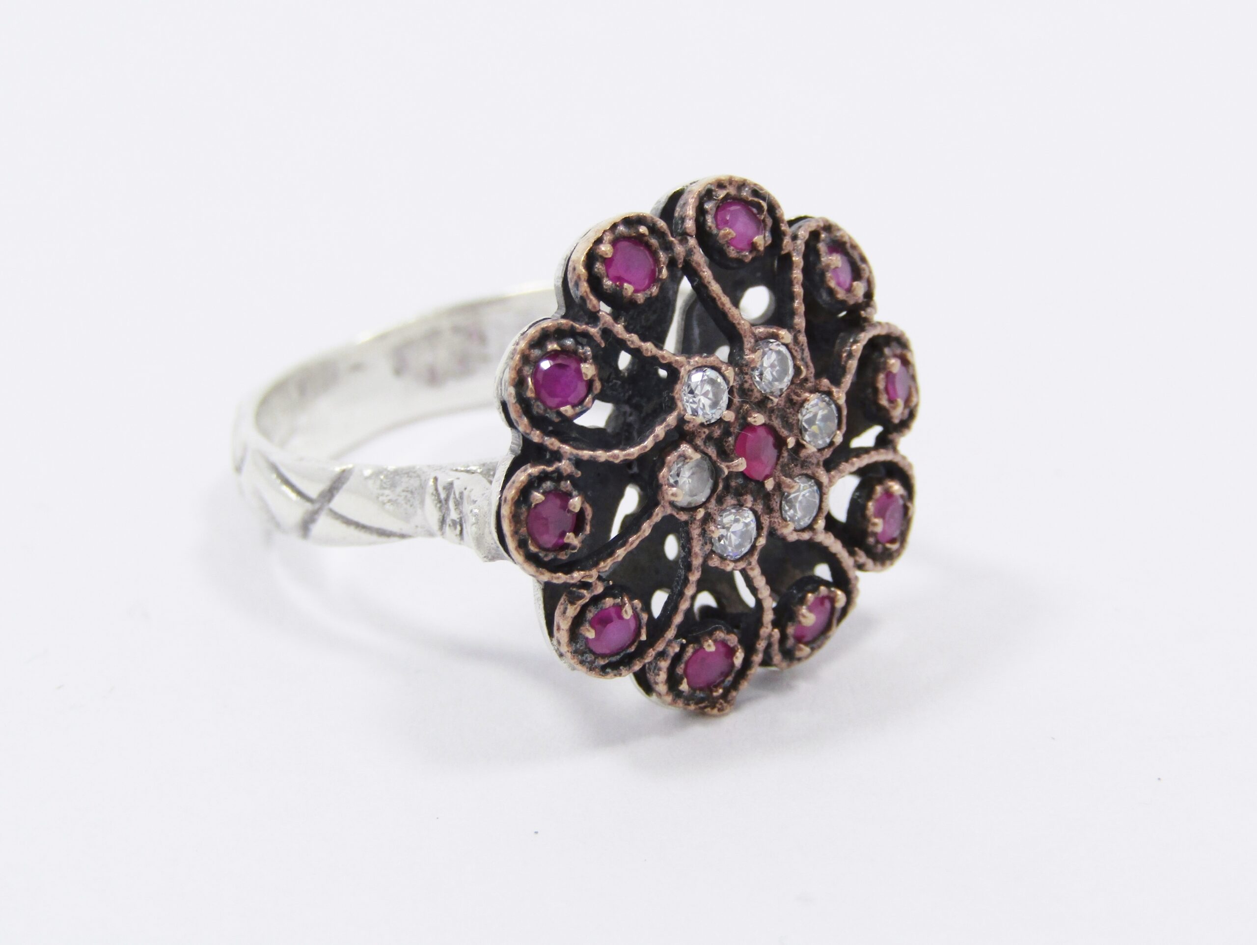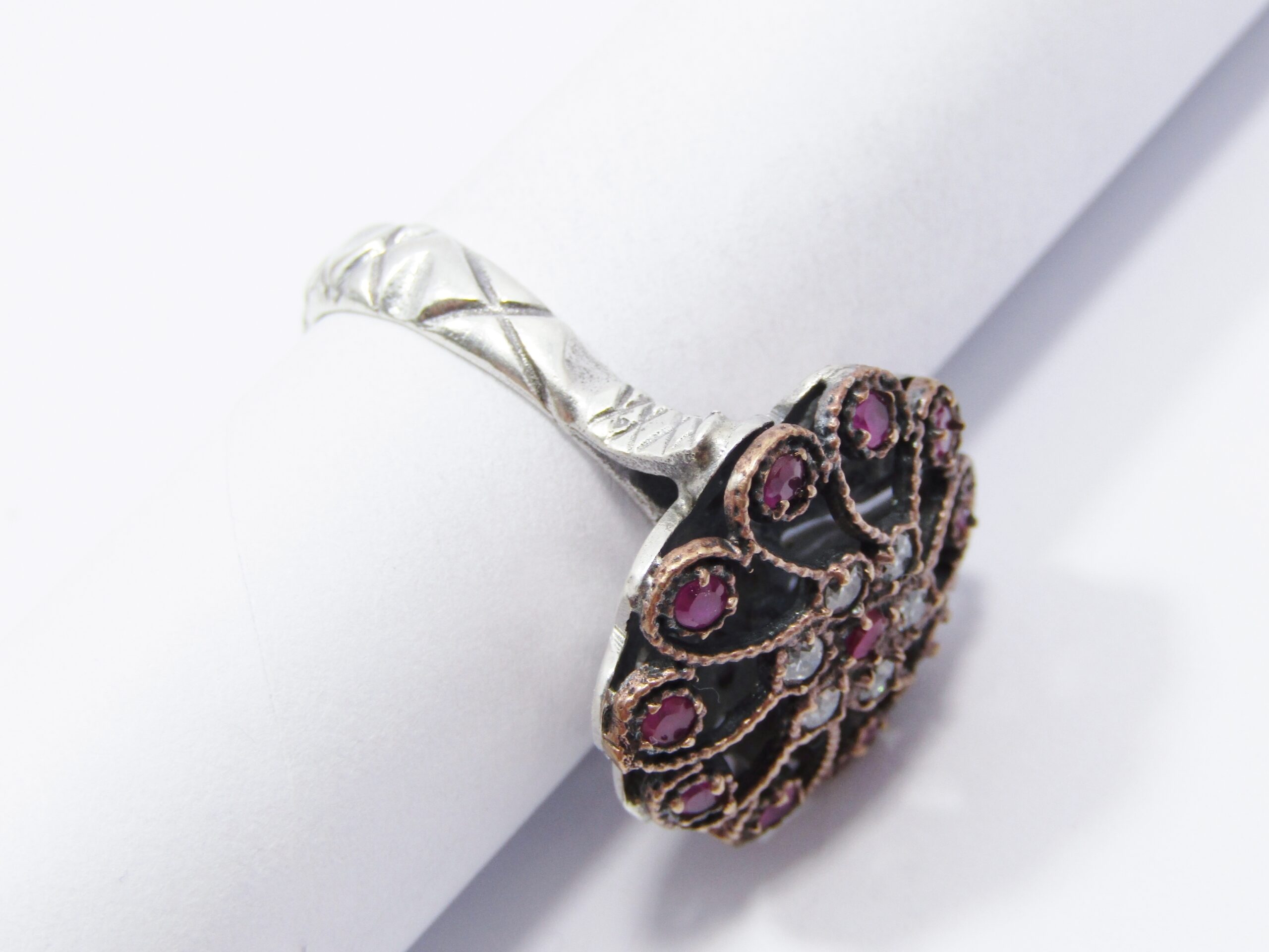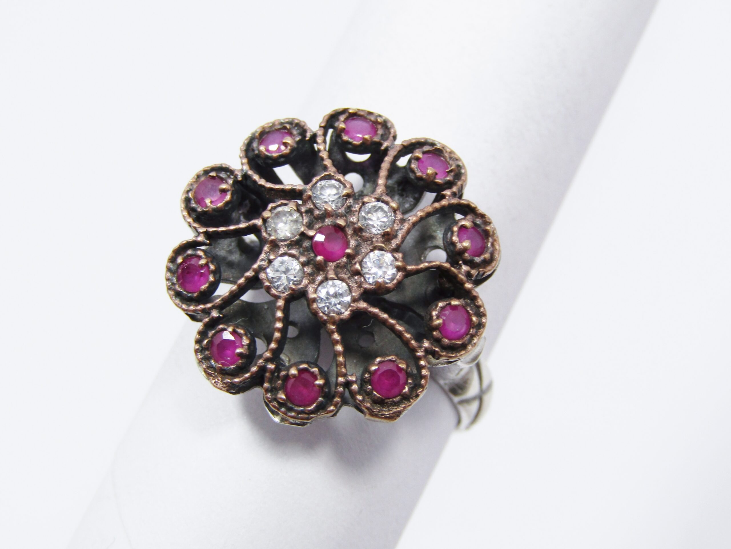 A Lovely Two Tone Eastern Design Ring With Pink and Clear Paste Stones in Sterling Silver-See photos showing you more detail and design on this amazing Piece -marked accordingly 925 Sterling Silver.