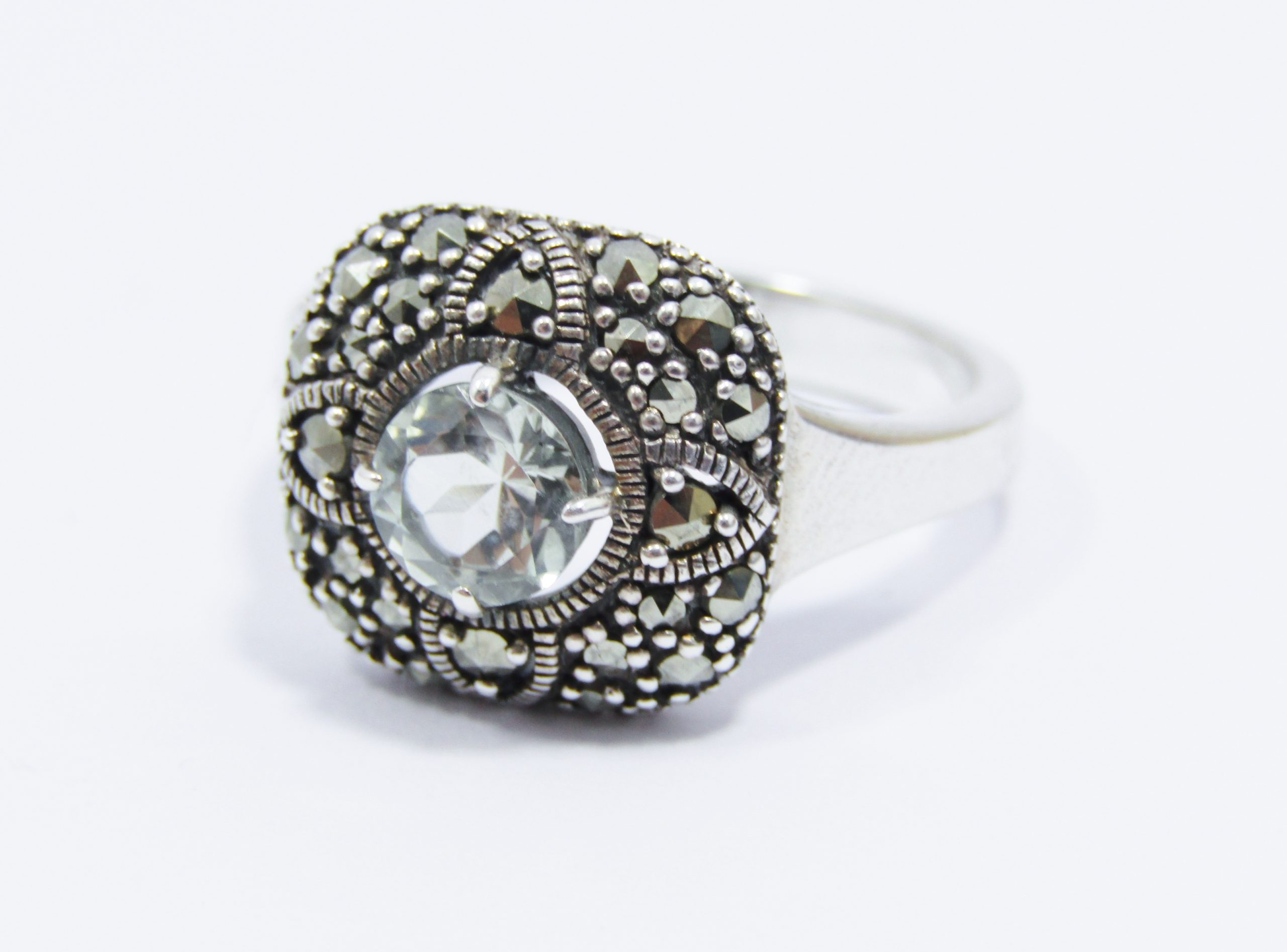 A Lovely Vintage Design Marcasite and Prasiolite Ring in Sterling Silver.