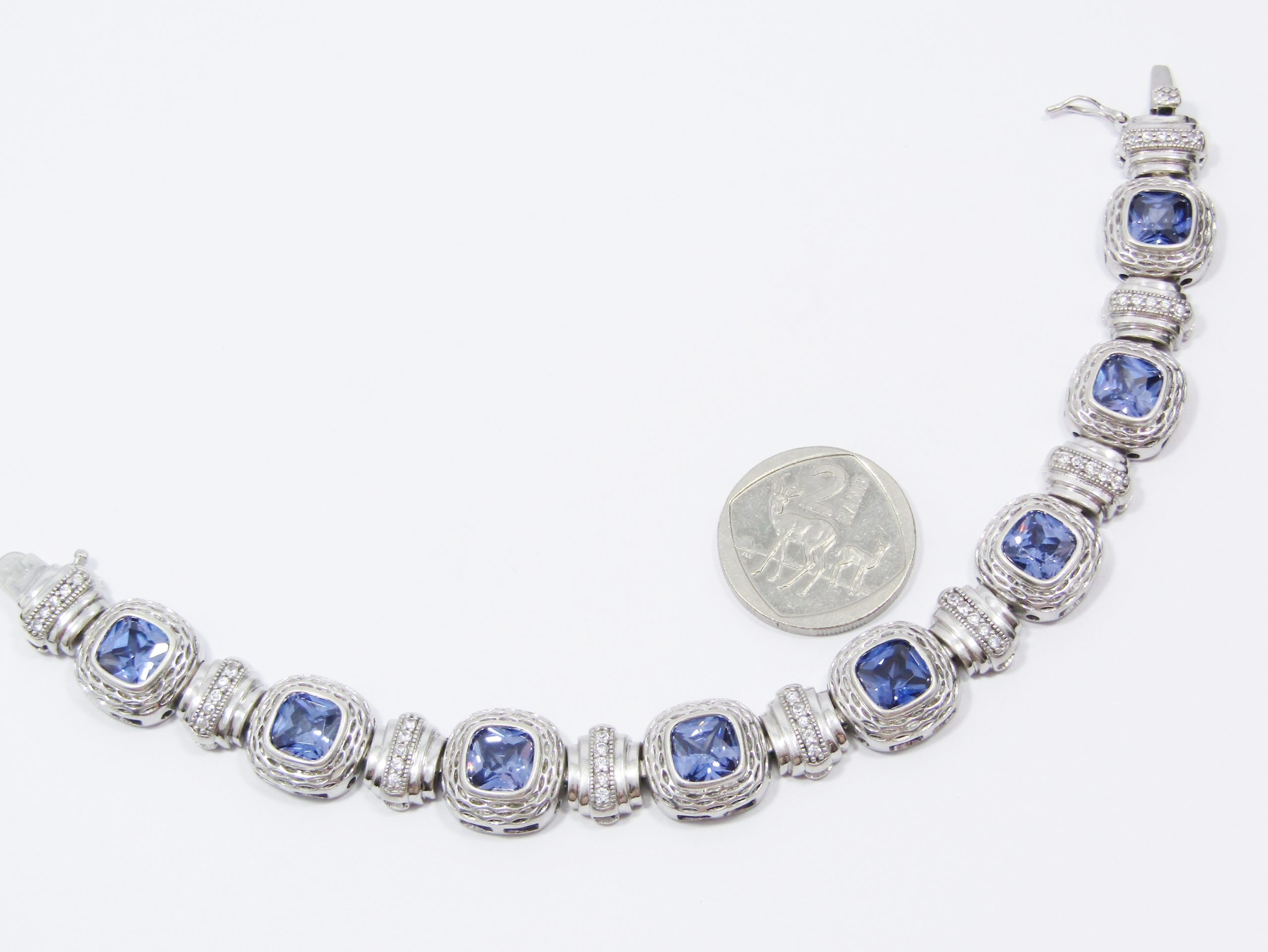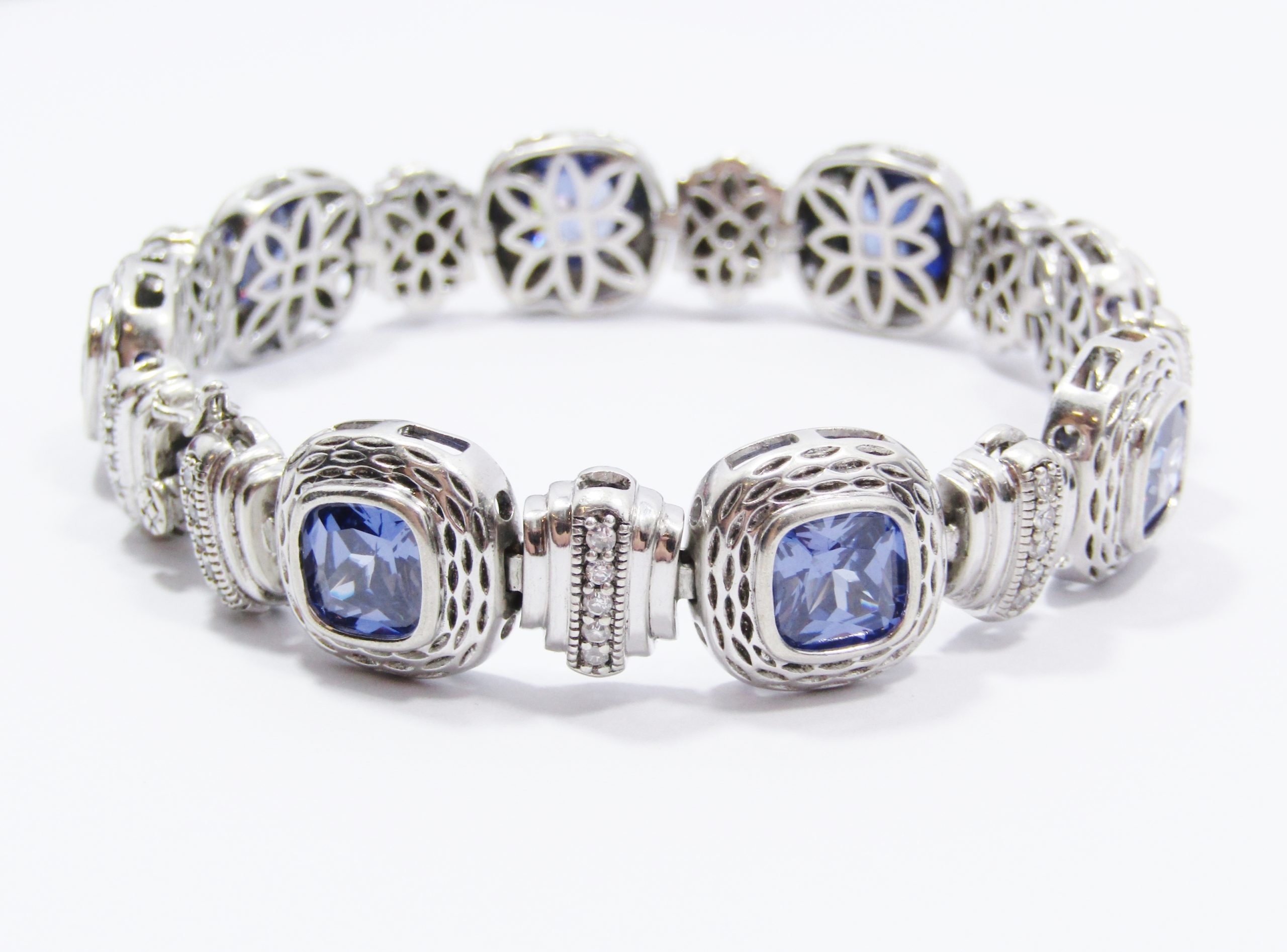 A Stunning Chunky Royal Blue Zirconia Tennis Bracelet in Sterling Silver-See photos showing you more detail and design on this amazing Piece -marked accordingly 925 Sterling Silver.