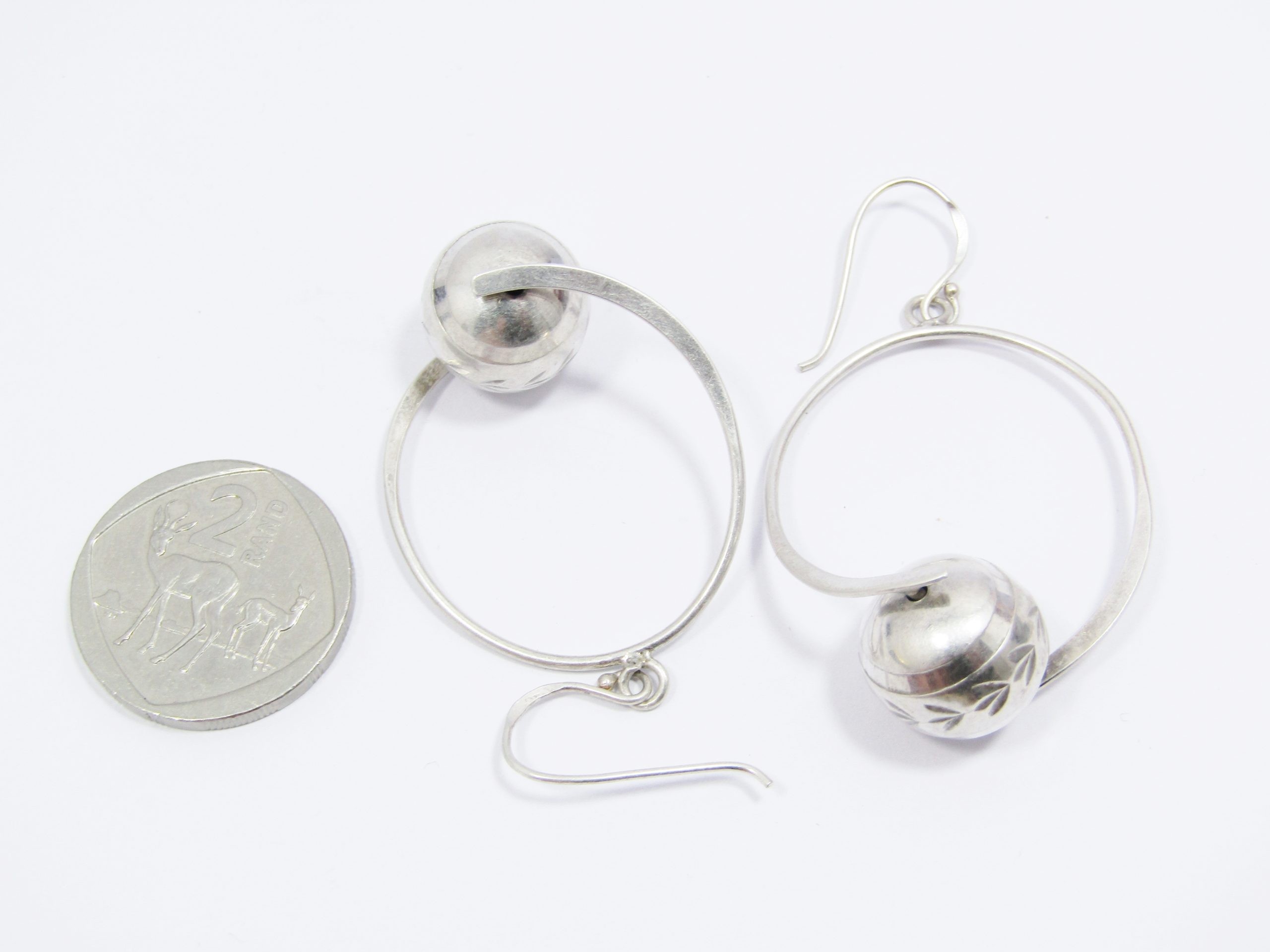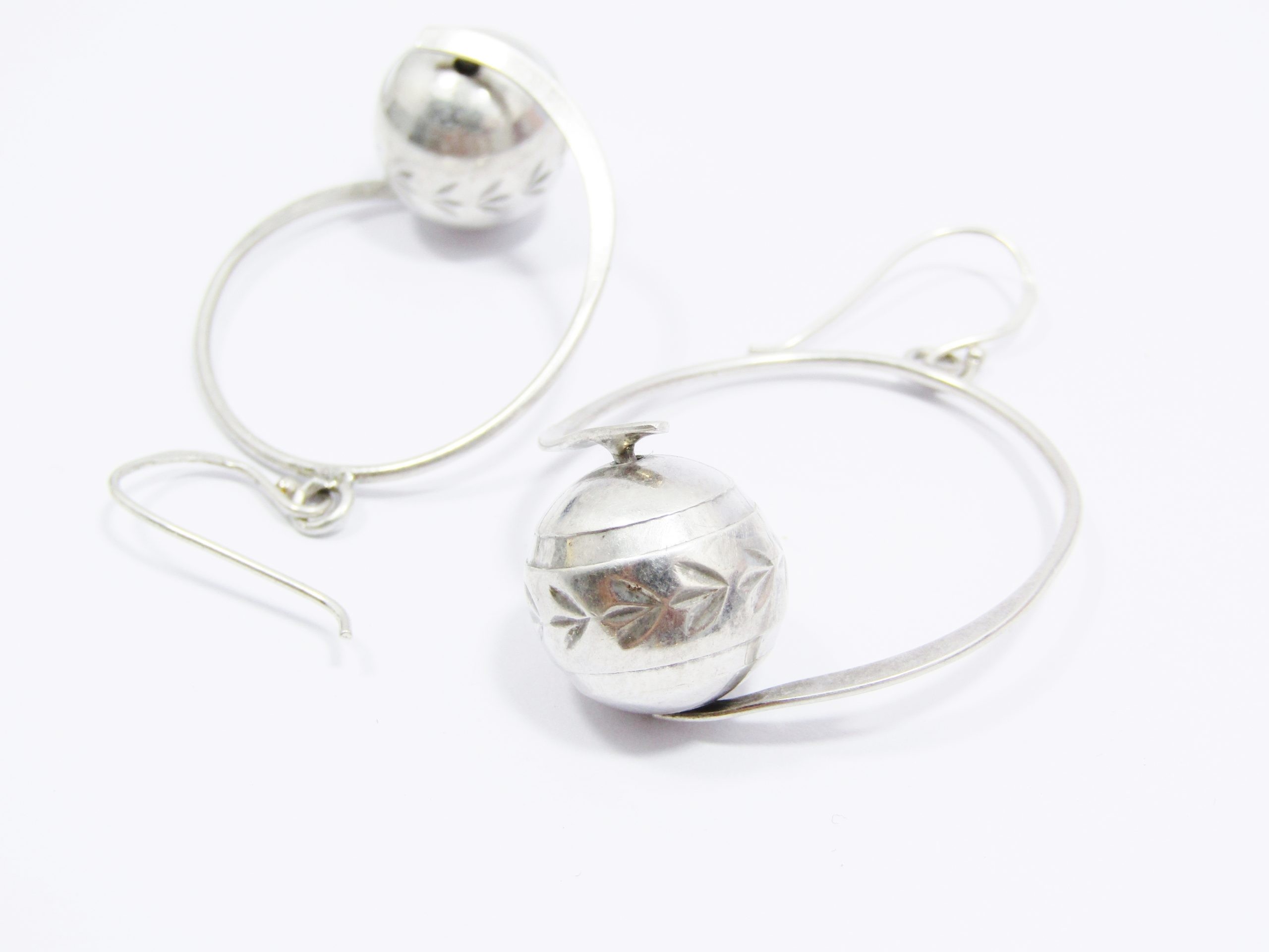 A Stunning Textured Ball Hoop Earrings in Sterling Silver -See photos showing you more detail and design on this amazing Pair -marked accordingly 925 Sterling Silver -The hoop is not closed so it is attached to the ball and the hoop is next to the ball on the other side