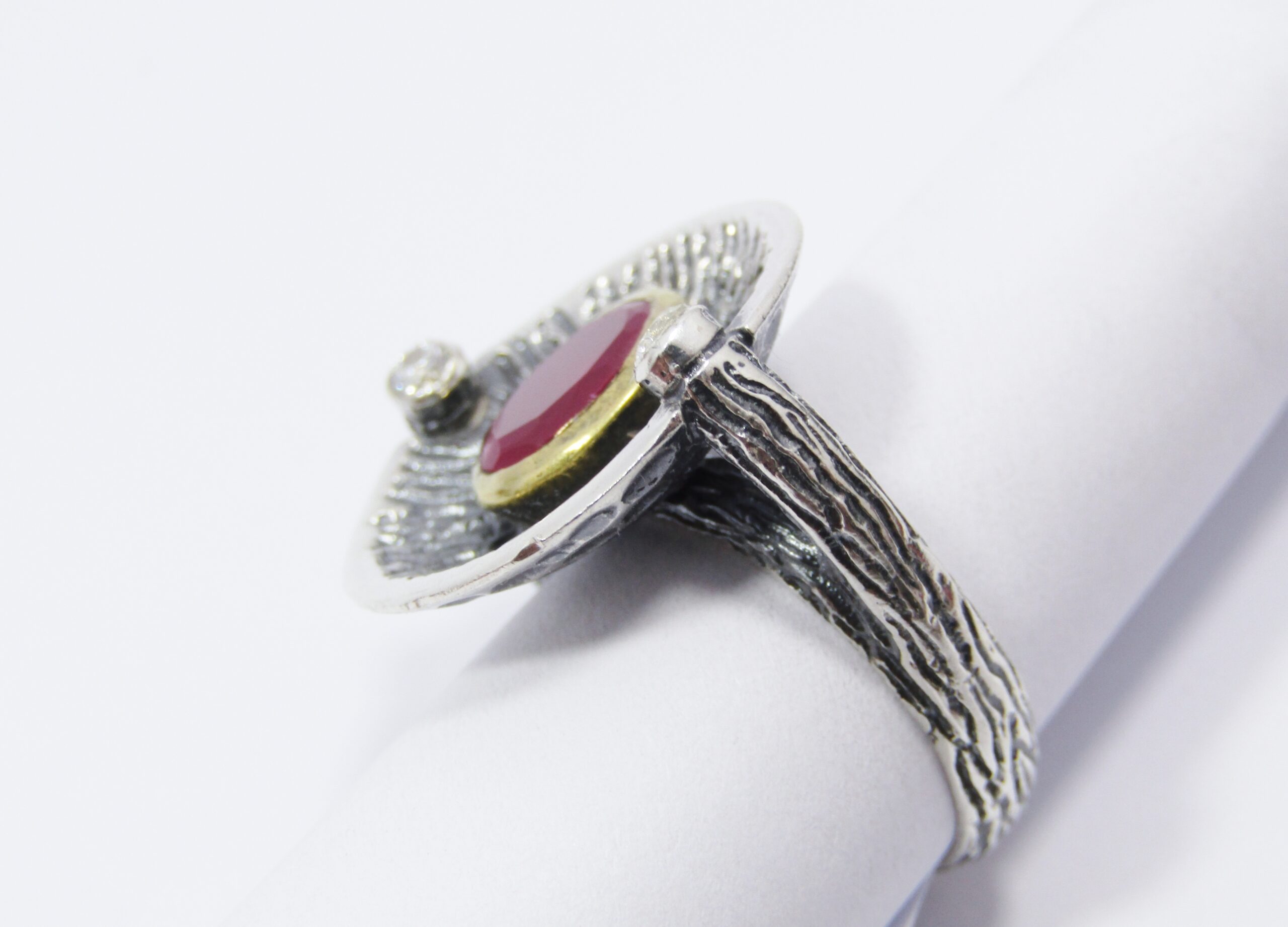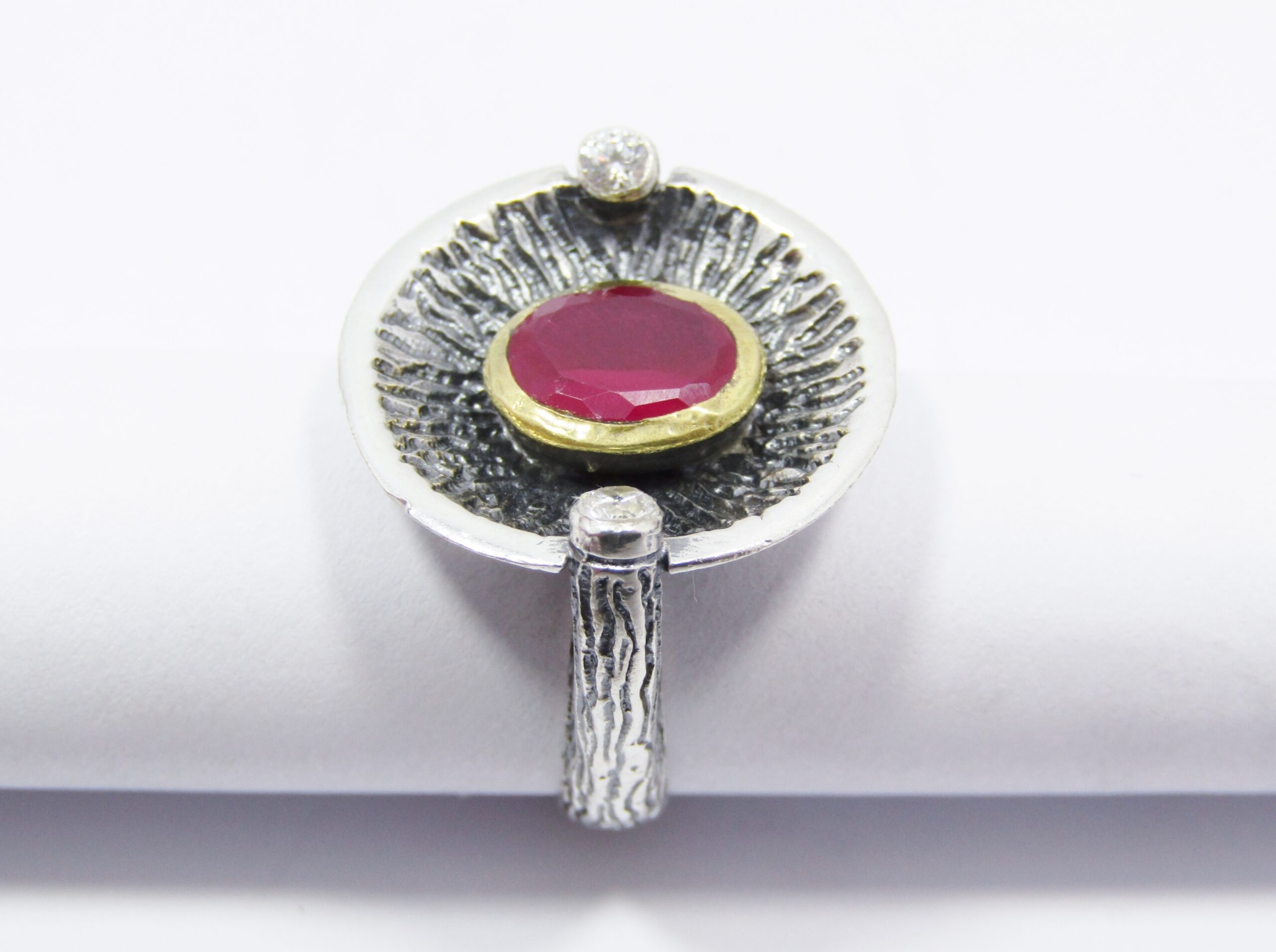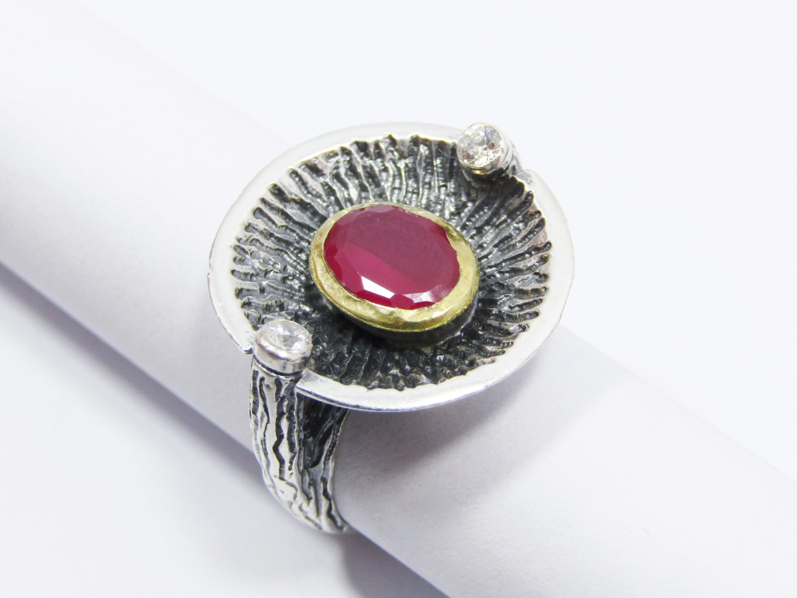 A Stunning Two Tone Brass over Sterling Silver ring with a Synthetic Ruby in Sterling Silver-See photos showing you more detail and design on this amazing Ring -marked accordingly 925 Sterling Silver.