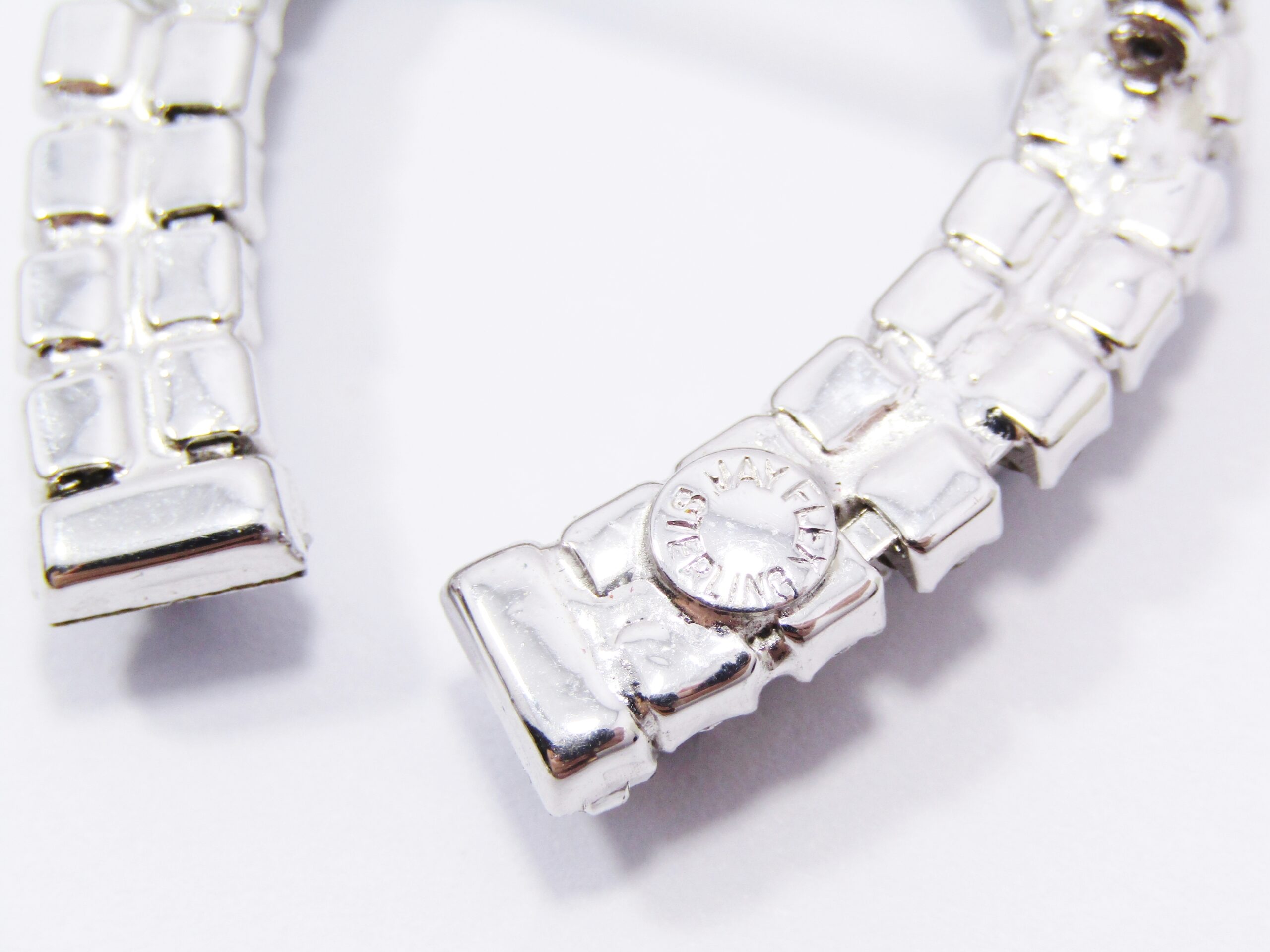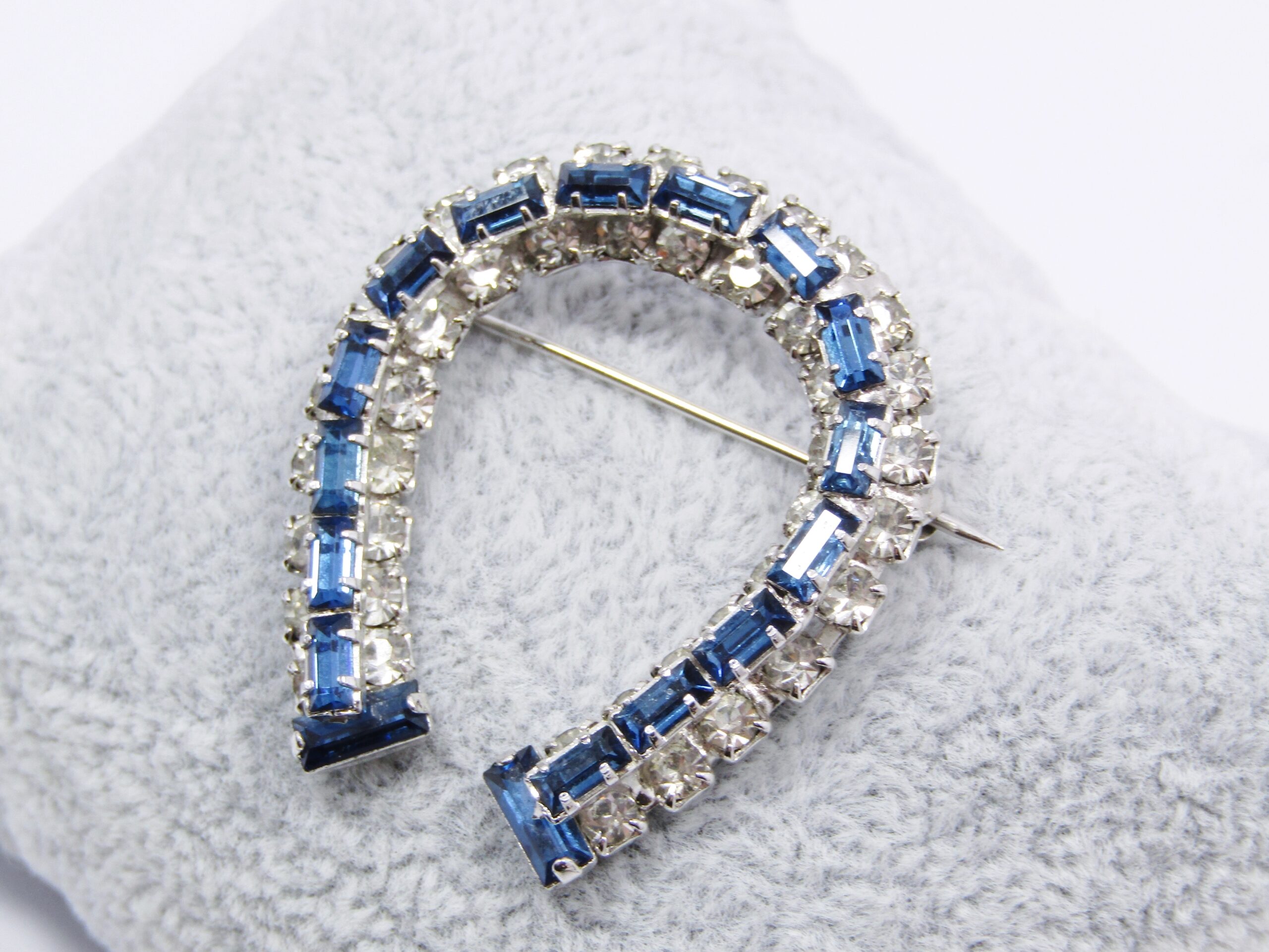 A beautiful piece in pristine condition, this vintage sterling silver brooch in the form of a horse shoe was made by Canadian jewellery firm Jay Flex. The piece is set with sparkling clear and blue rhinestones, marked "STERLING" accordingly.