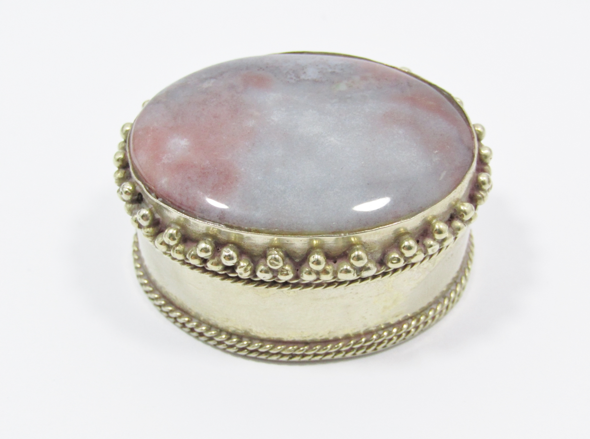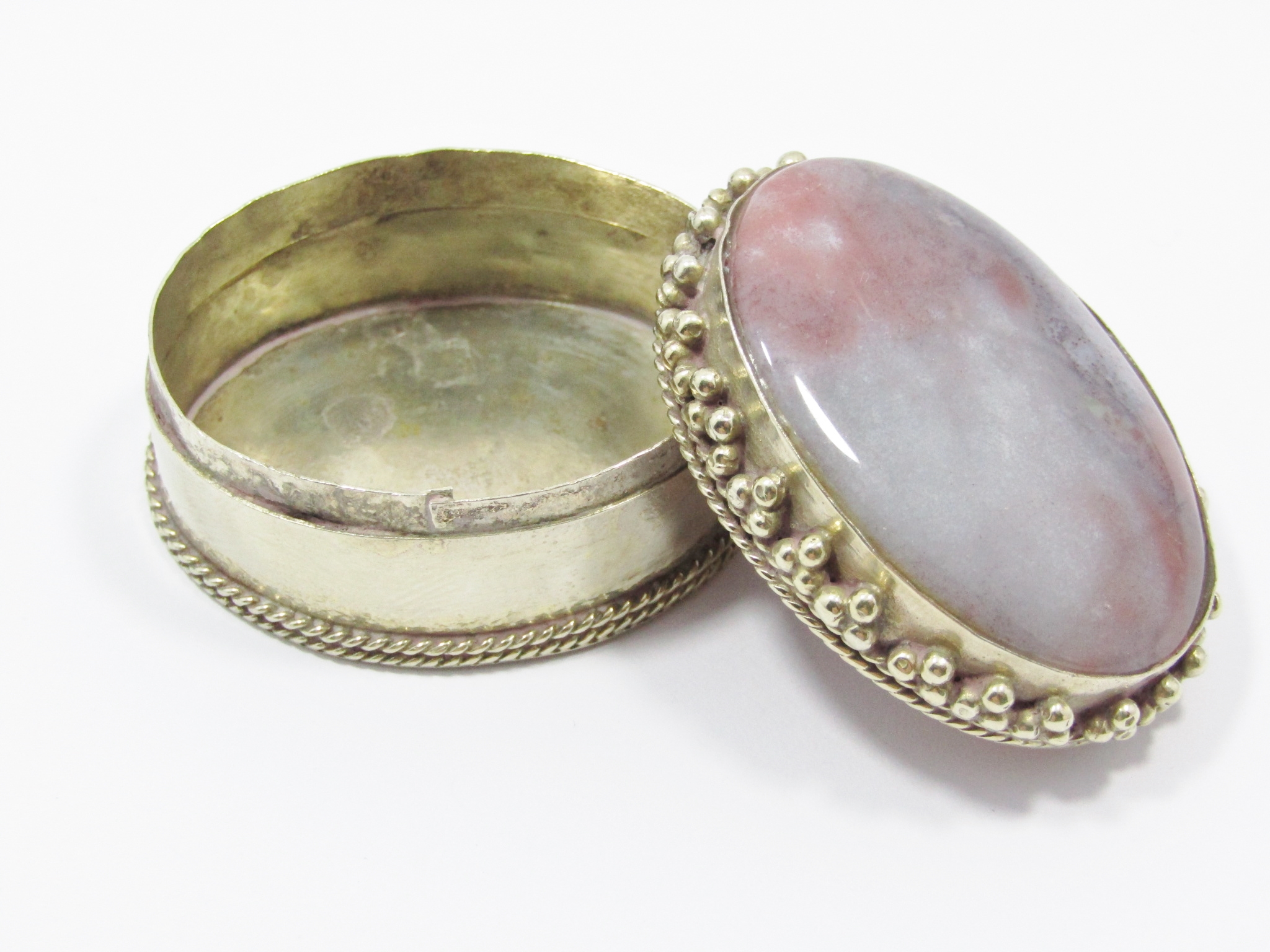 An Amazing Agate Stone Pill Box in Silver tone -See photos showing you more detail and design on this Magnificent Piece-made from a none precious metal all still in a beautiful condition