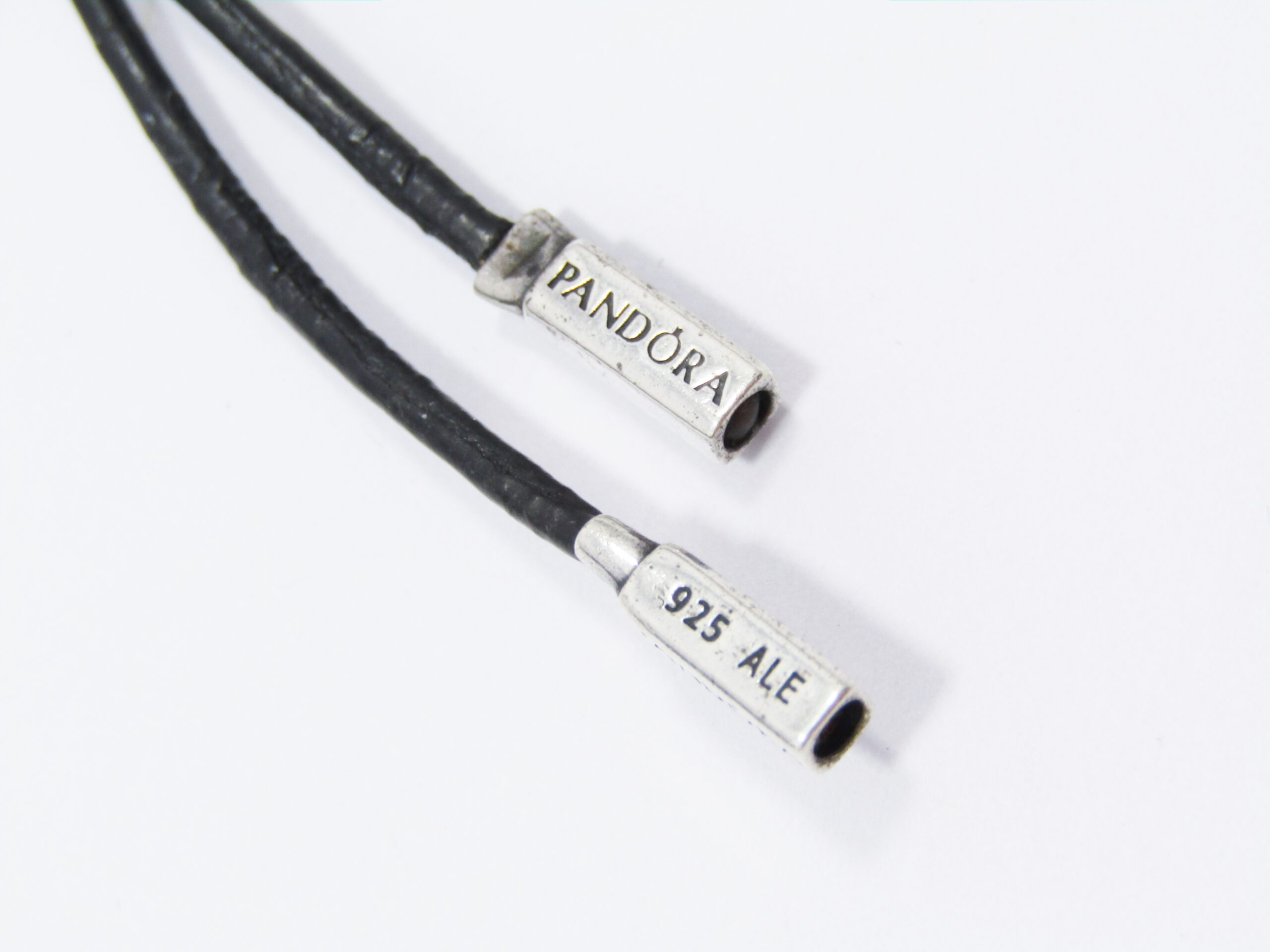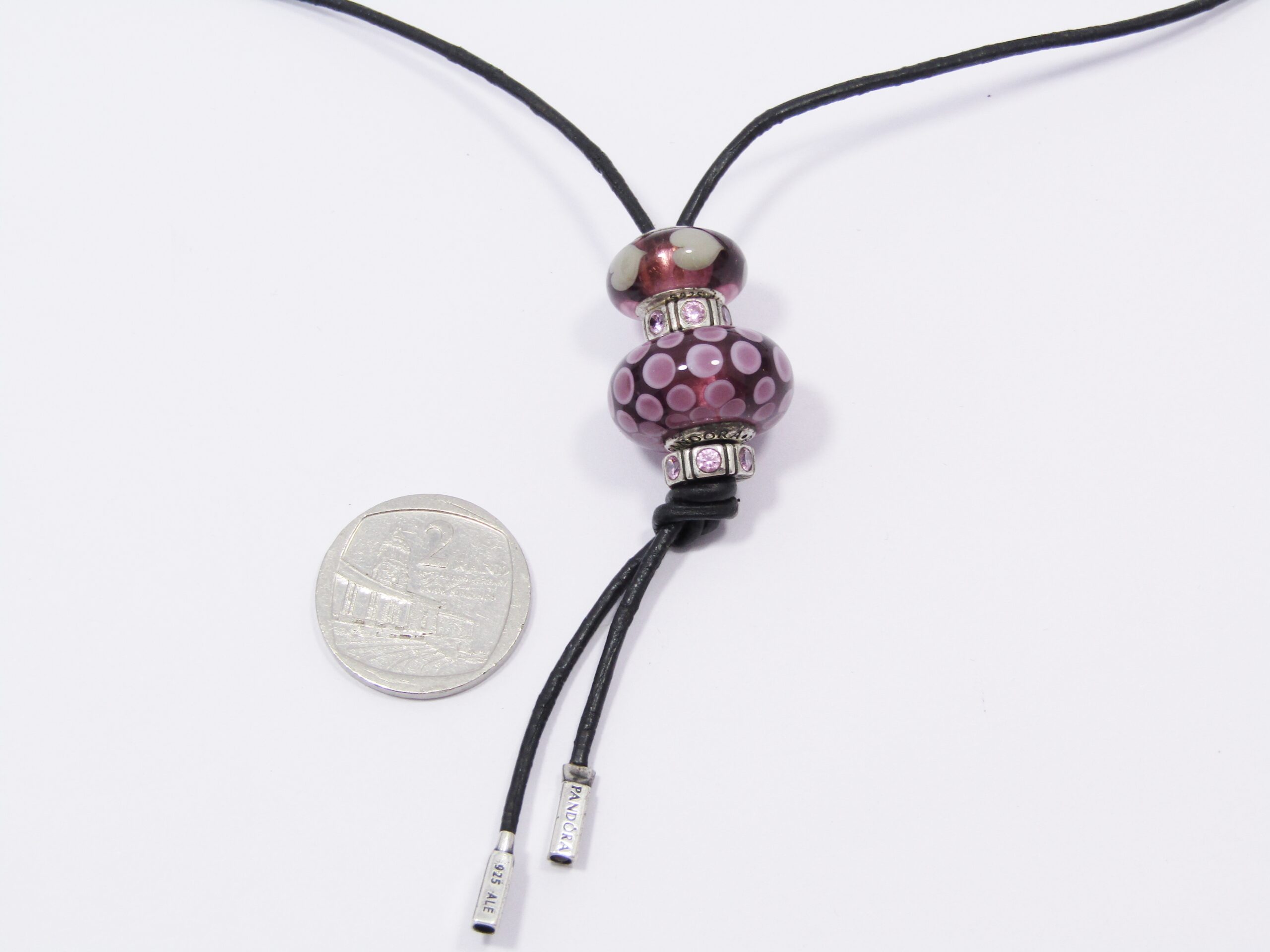 An unusual, early Pandora leather fob, with sterling silver Pandora beads dangling on the end. Marked accordingly ALE 925, see photos for details.