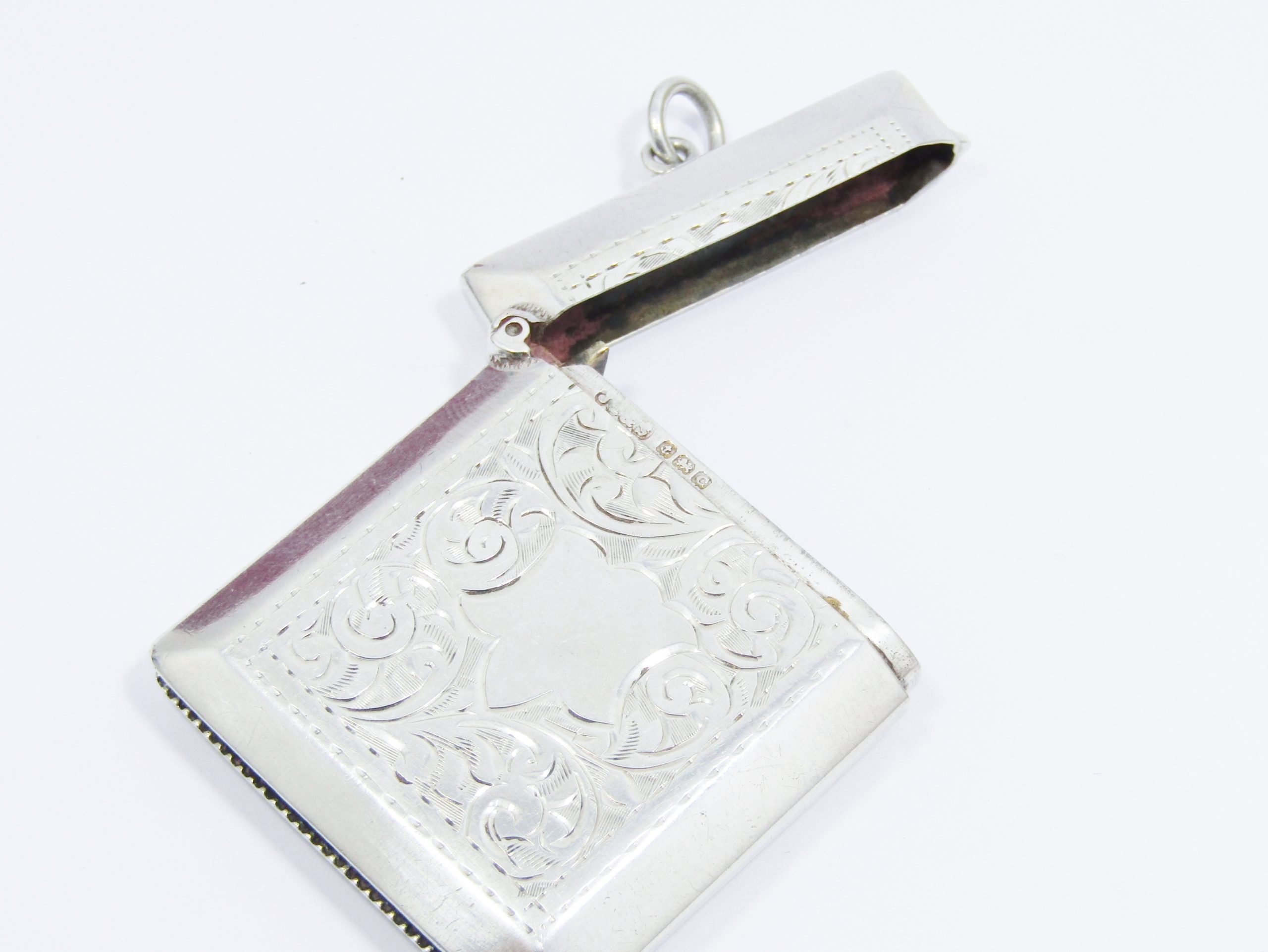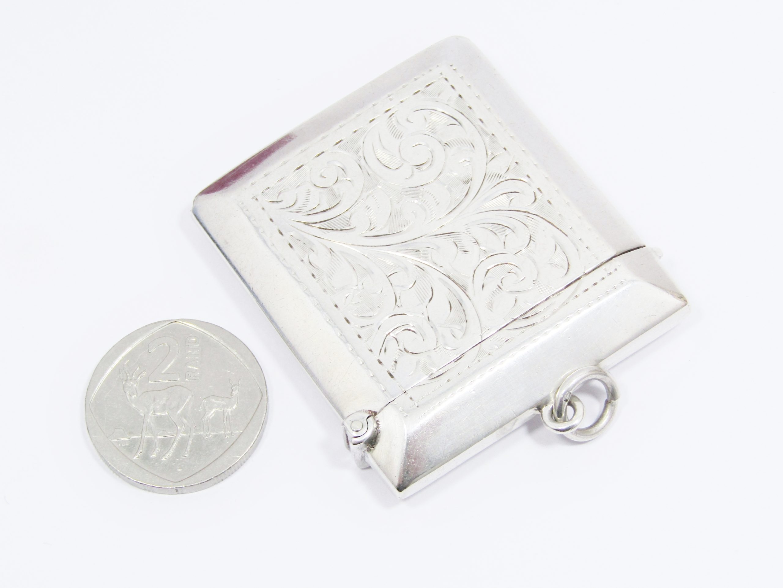 A lovely, large-sized sterling silver vesta case, hallmarked for Birmingham England with date letter for 1927, in excellent condition with chatelaine loop to easily be worn as a statement pendant, or pillbox in your bag! The hinge works perfectly and secures in place when closed. See photos for details.