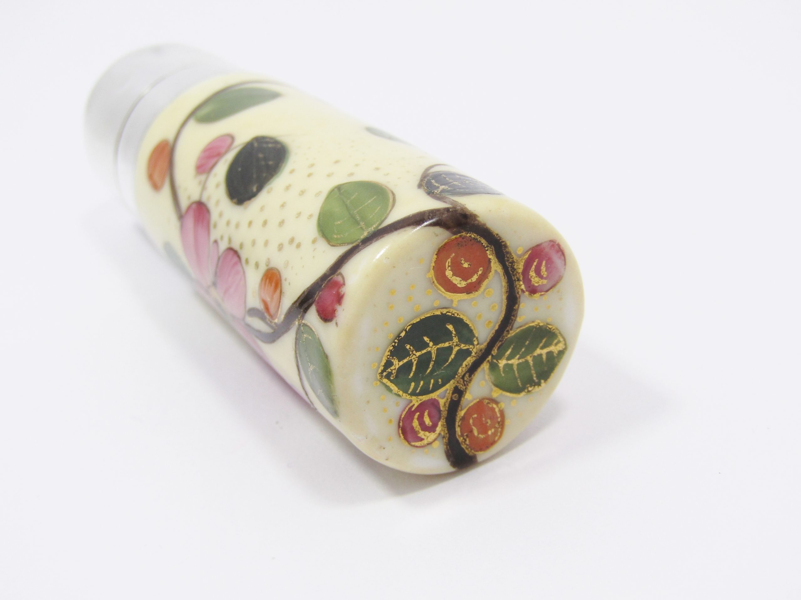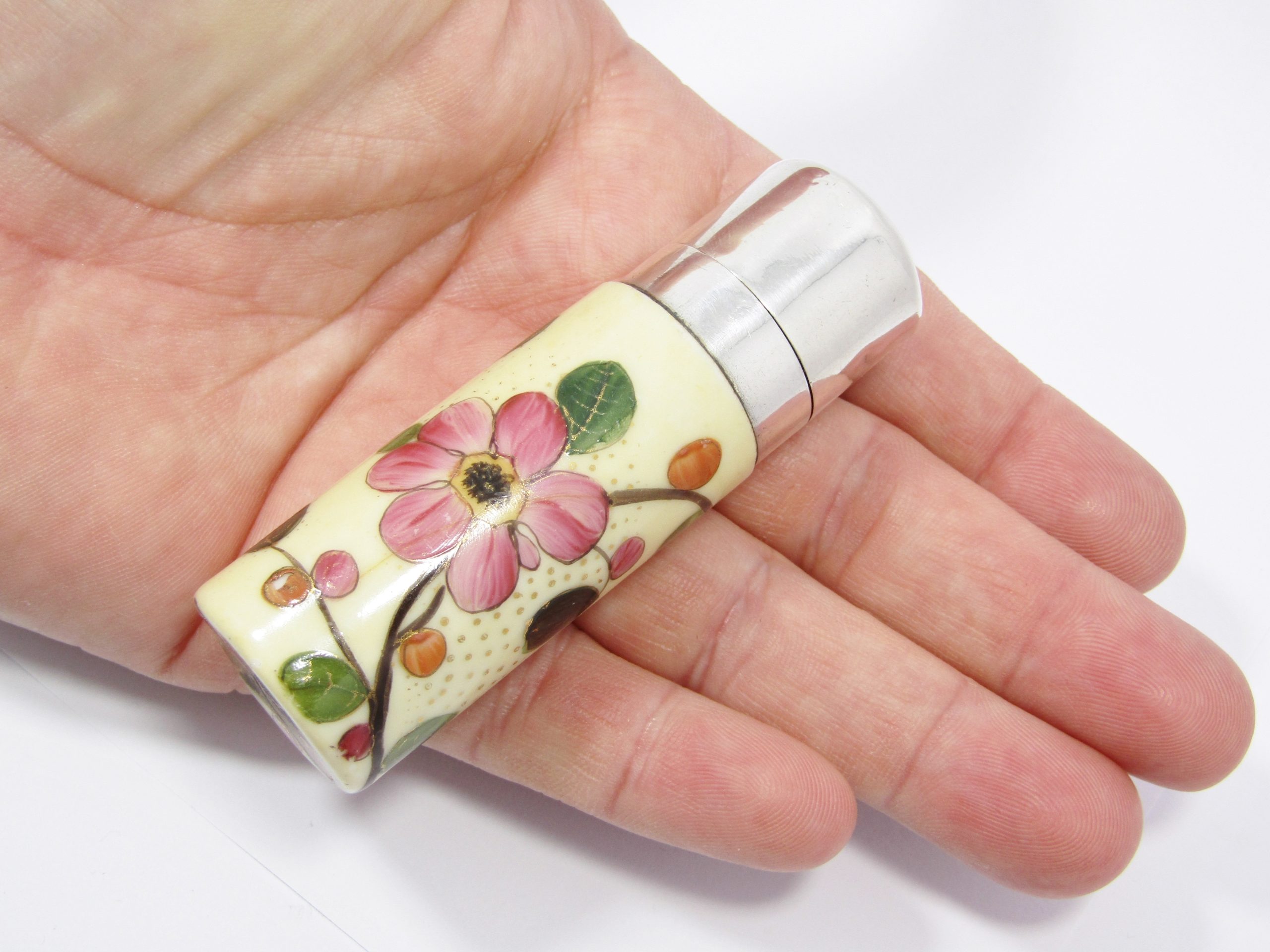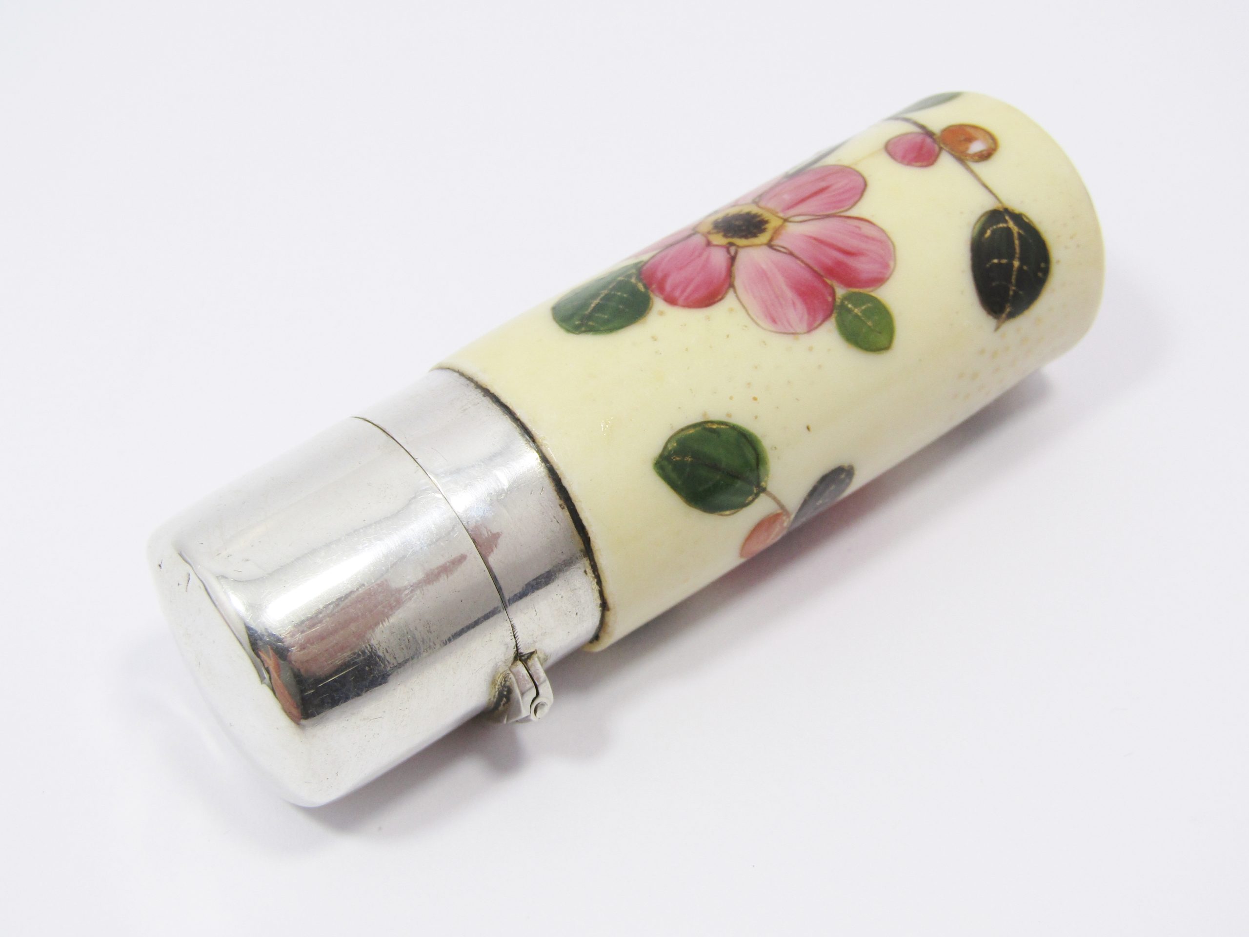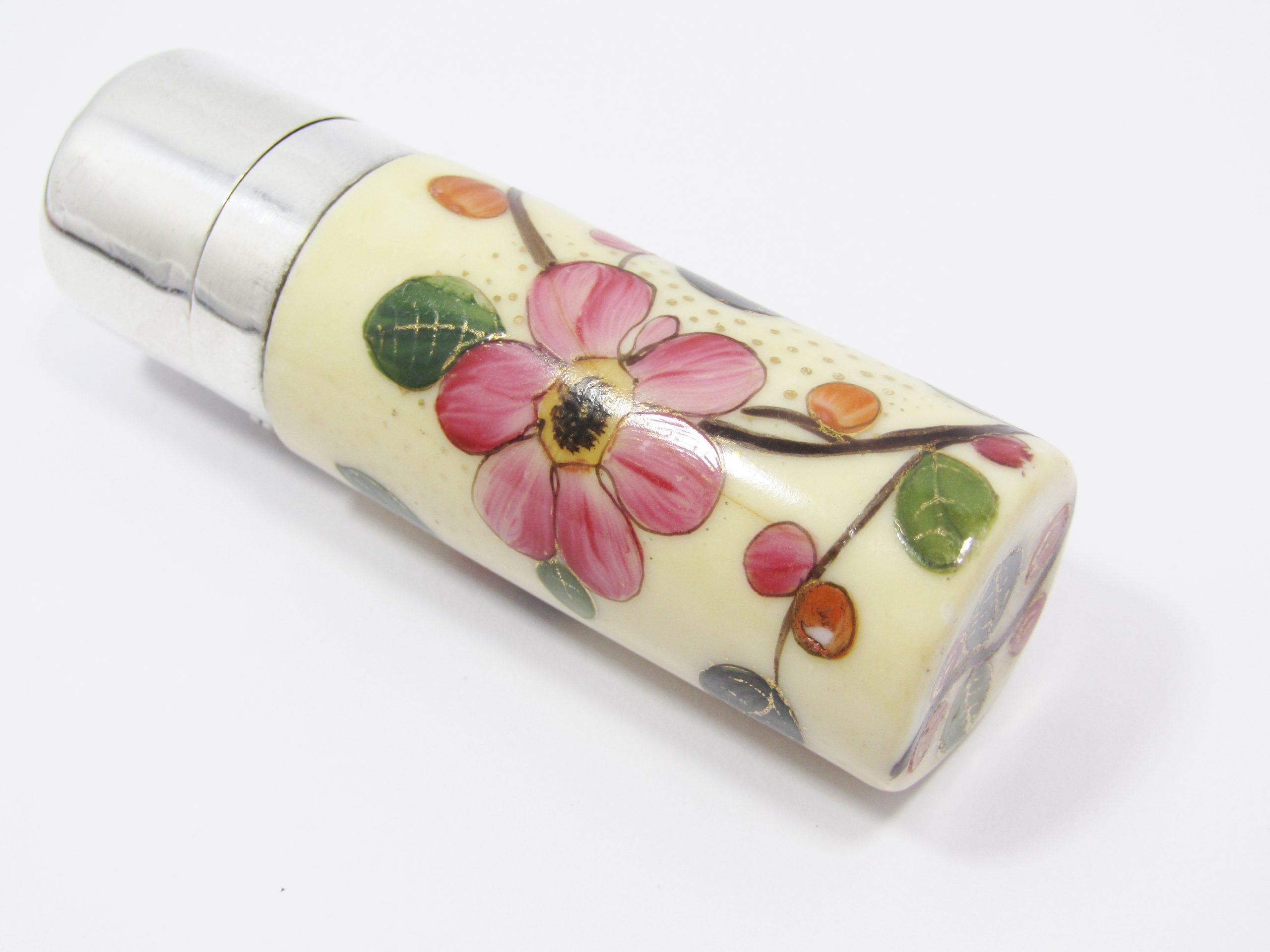 A beautiful antique perfume bottle, made in hand-painted porcelain and sterling silver with gilt inner, dated to the late Victorian period circa 1890. See photos for details, in good overall condition - unmarked but tested as sterling silver accordingly.