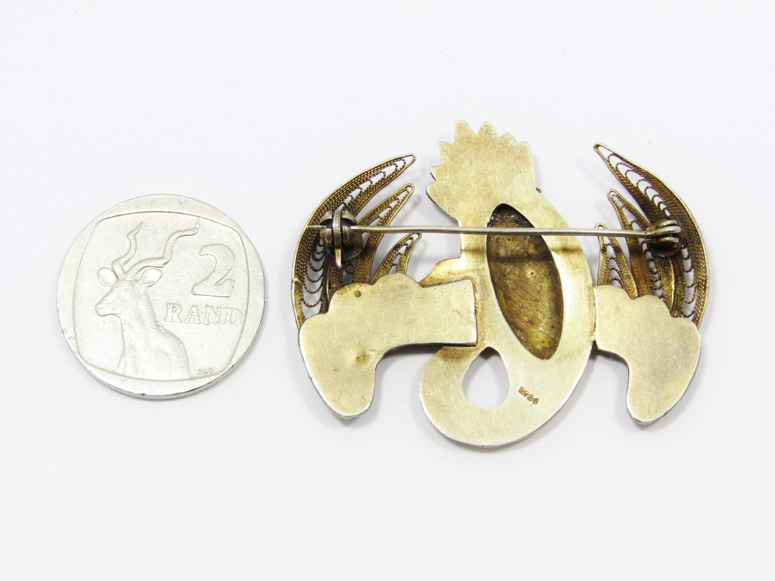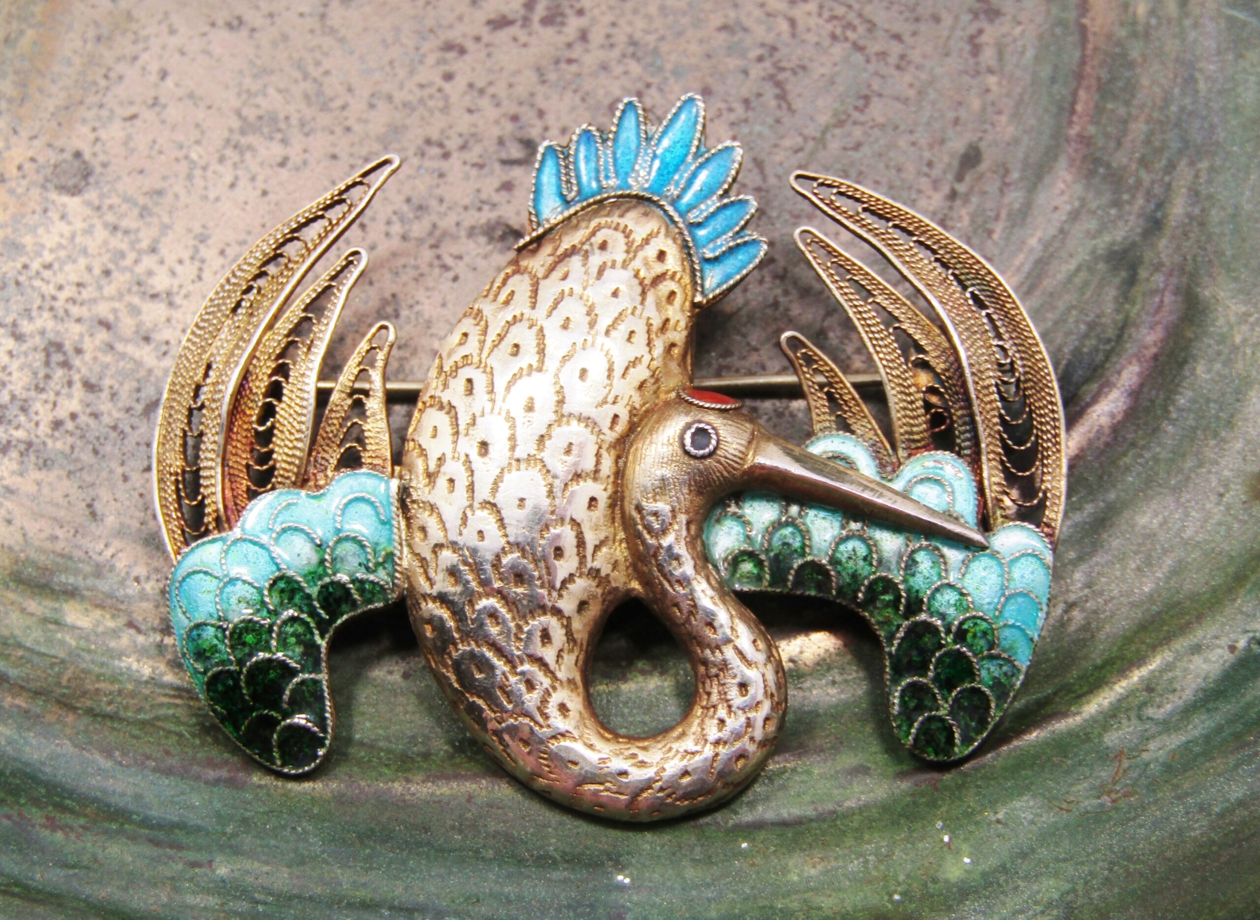 A beautiful antique/vintage Oriental filigree silver gilt brooch in the form of a stork, with lovely enameled detail. Tested and verified as silver accordingly, in excellent condition.