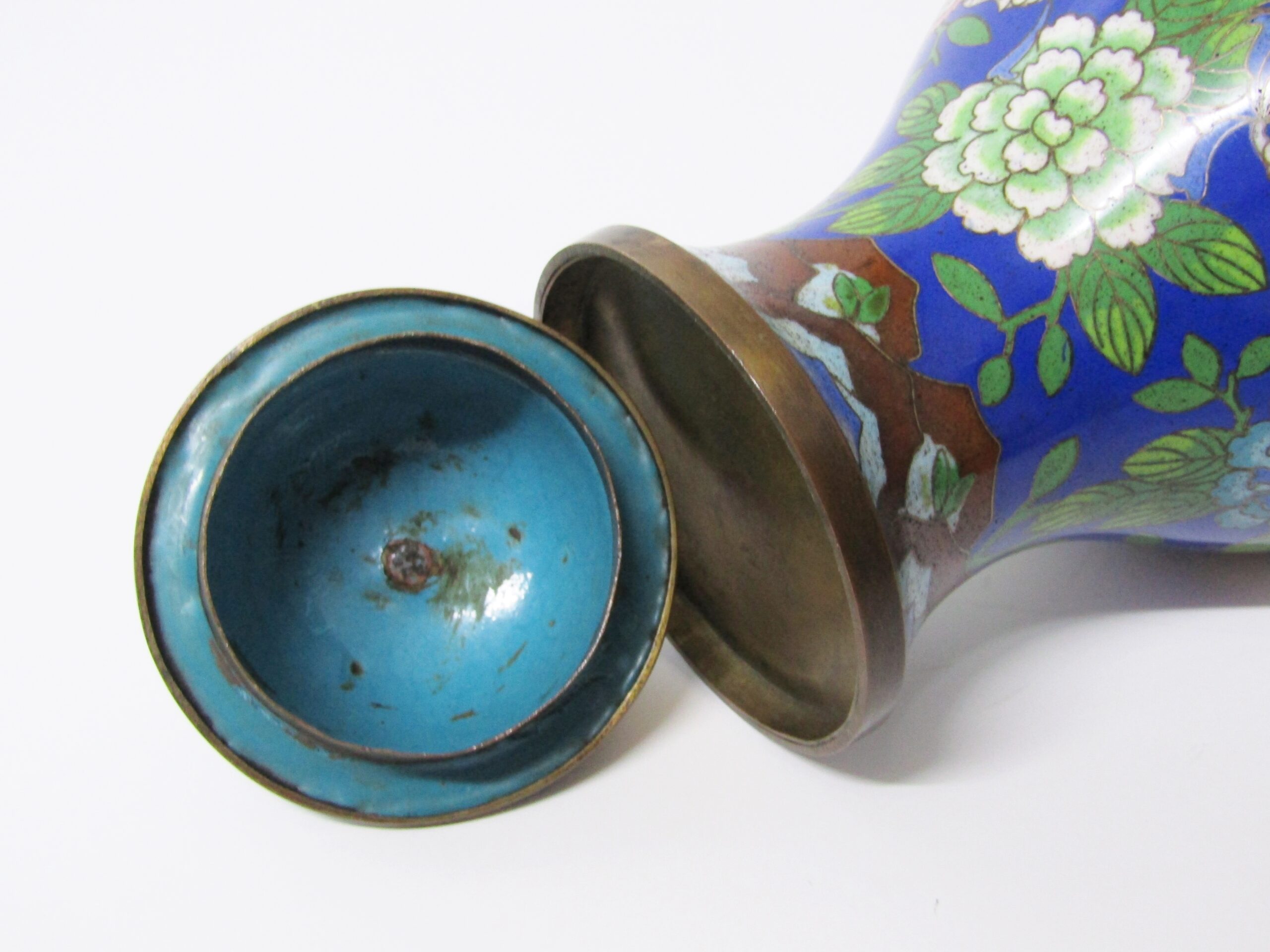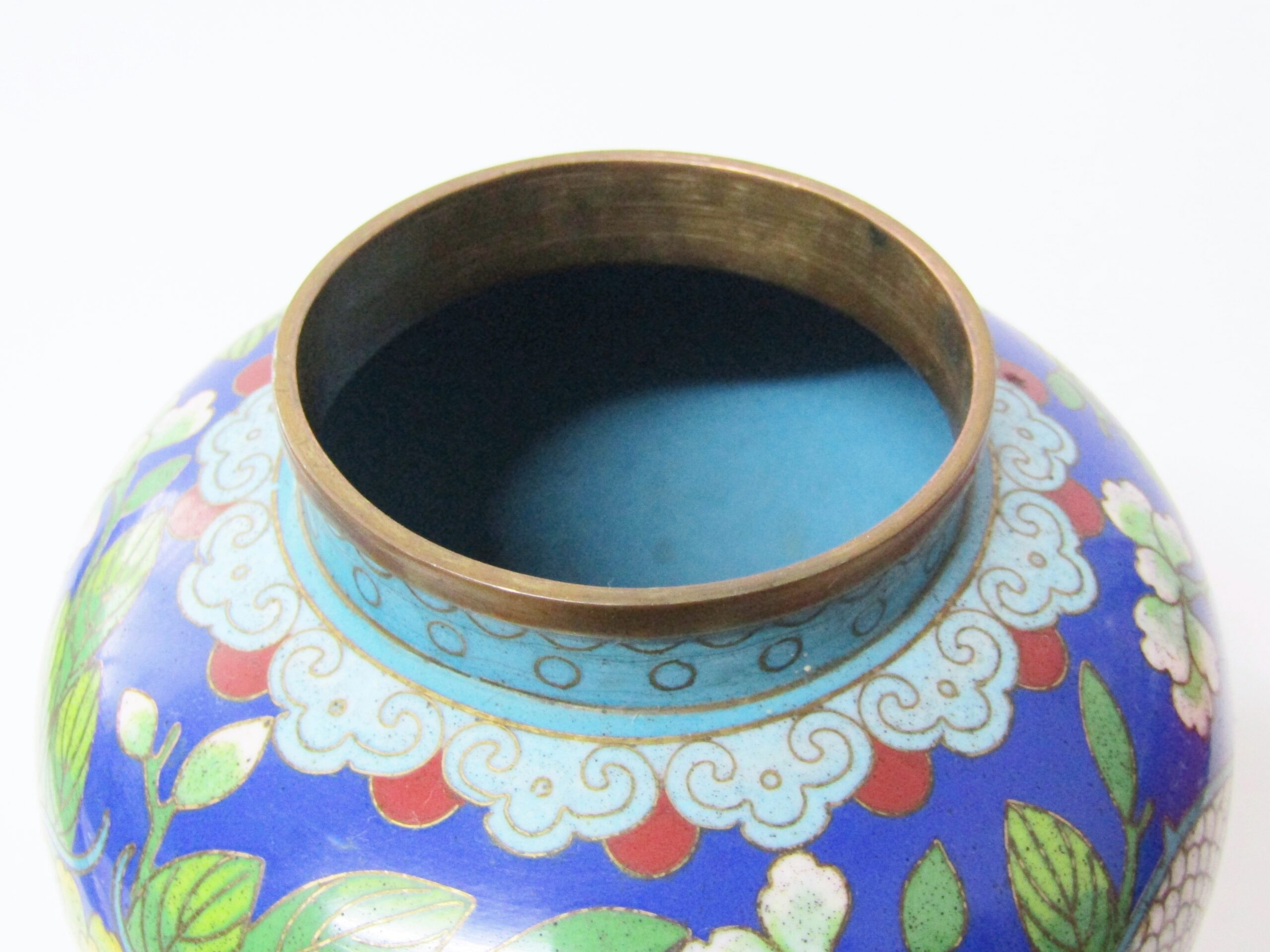 A beautiful ginger jar shaped oriental cloisonne piece, with blue background depicting a dragon amongst flowers and foliate design. In good overall condition with some minor enamel loss noted on the inside lid. See photos for details and lovely design.