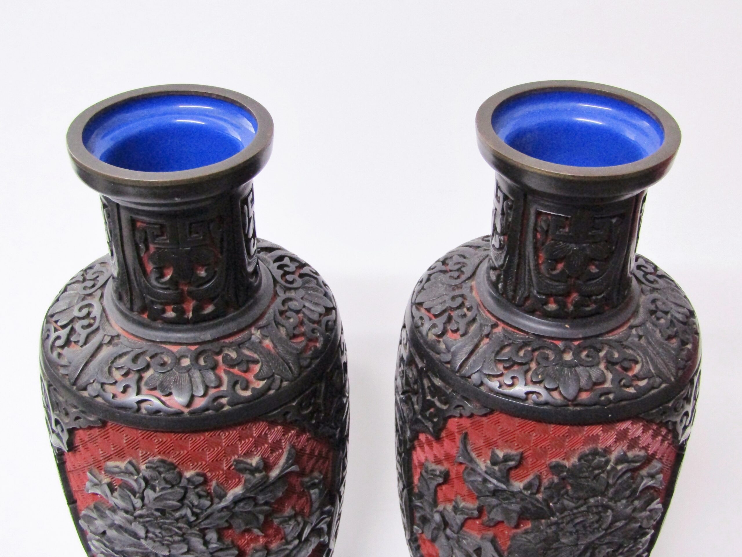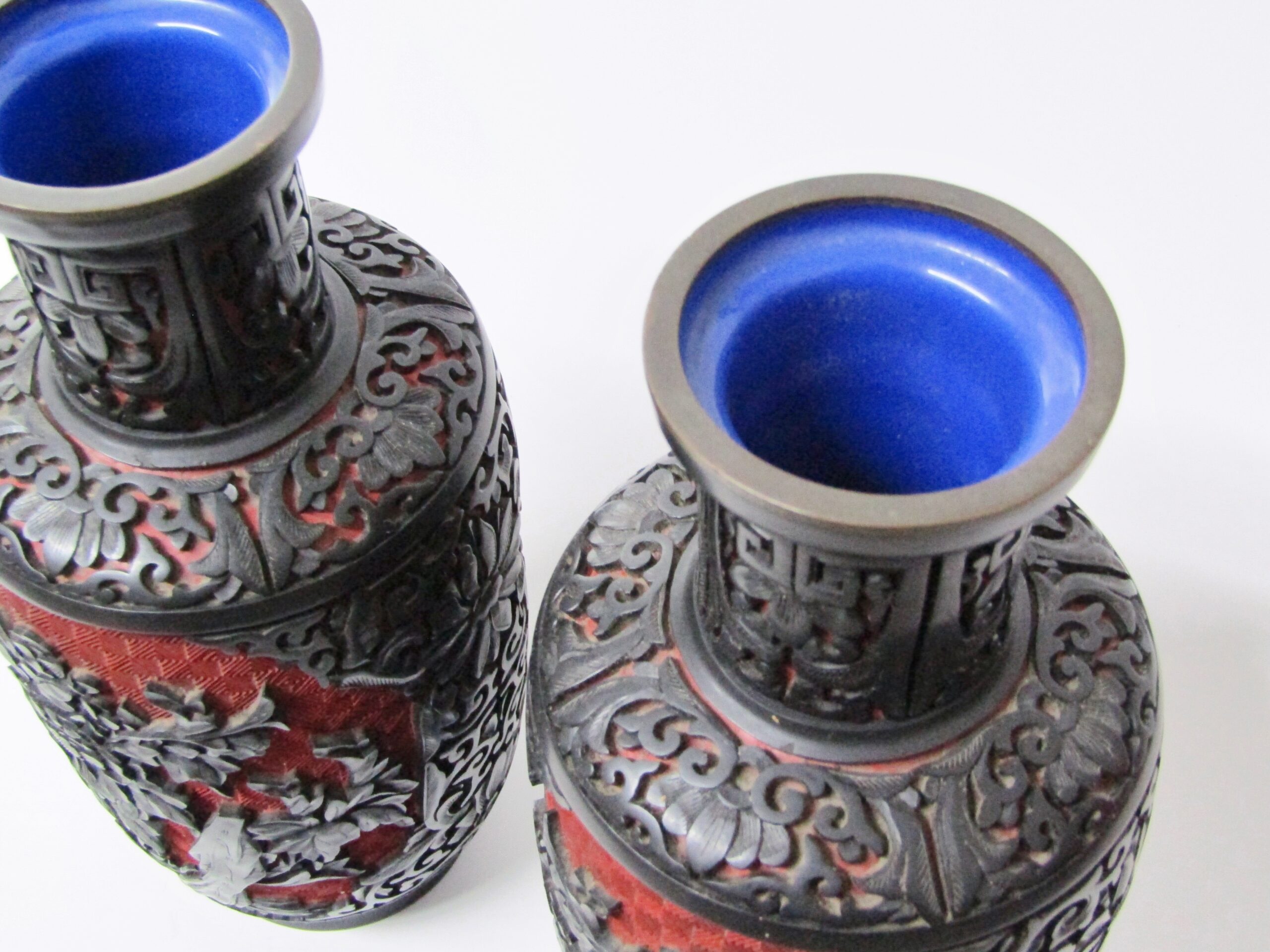 A beautiful pair of oriental cinnabar style vases, with red background and black foreground, and blue enameled metal frame. See photos for details, in excellent condition!