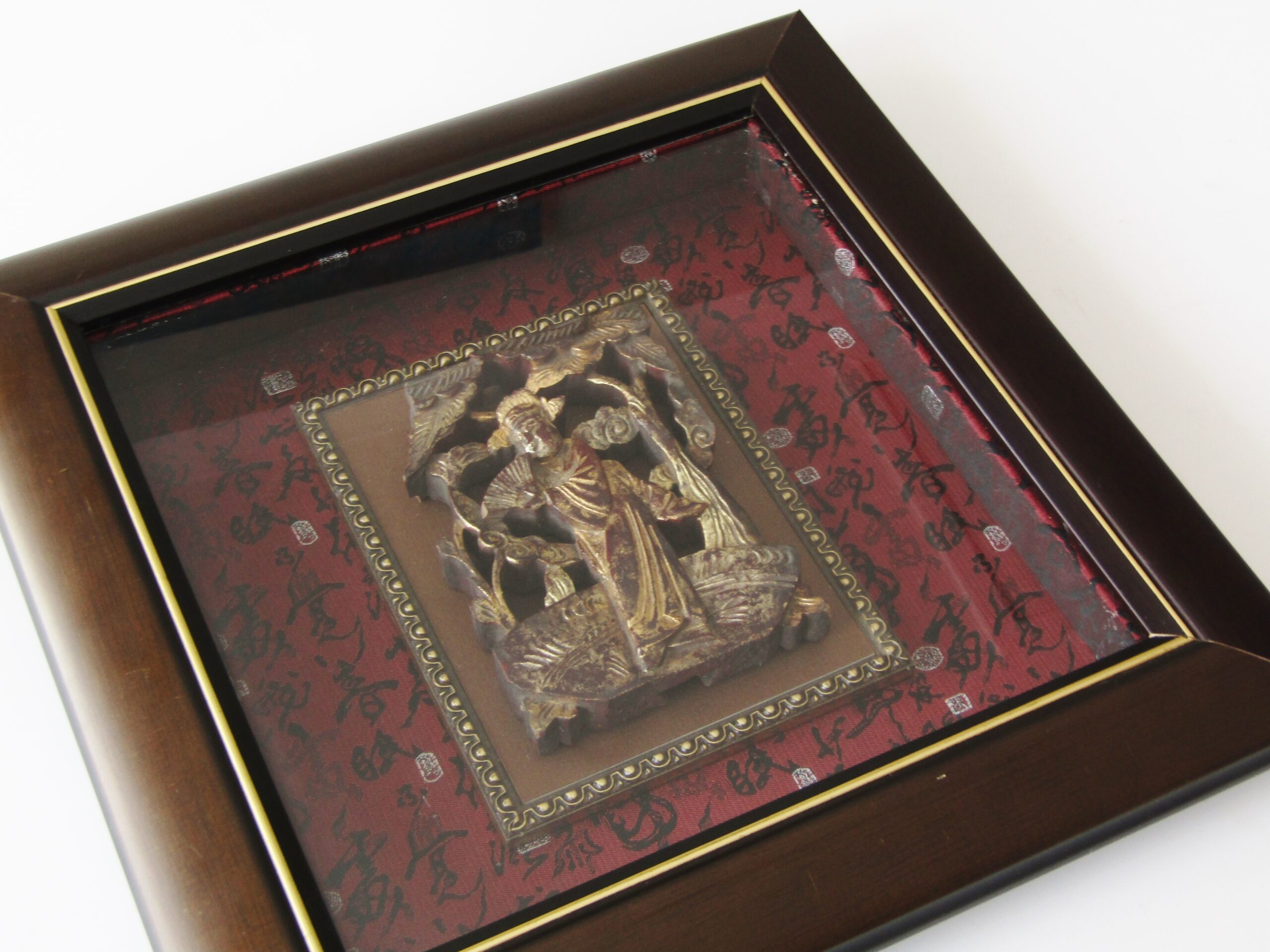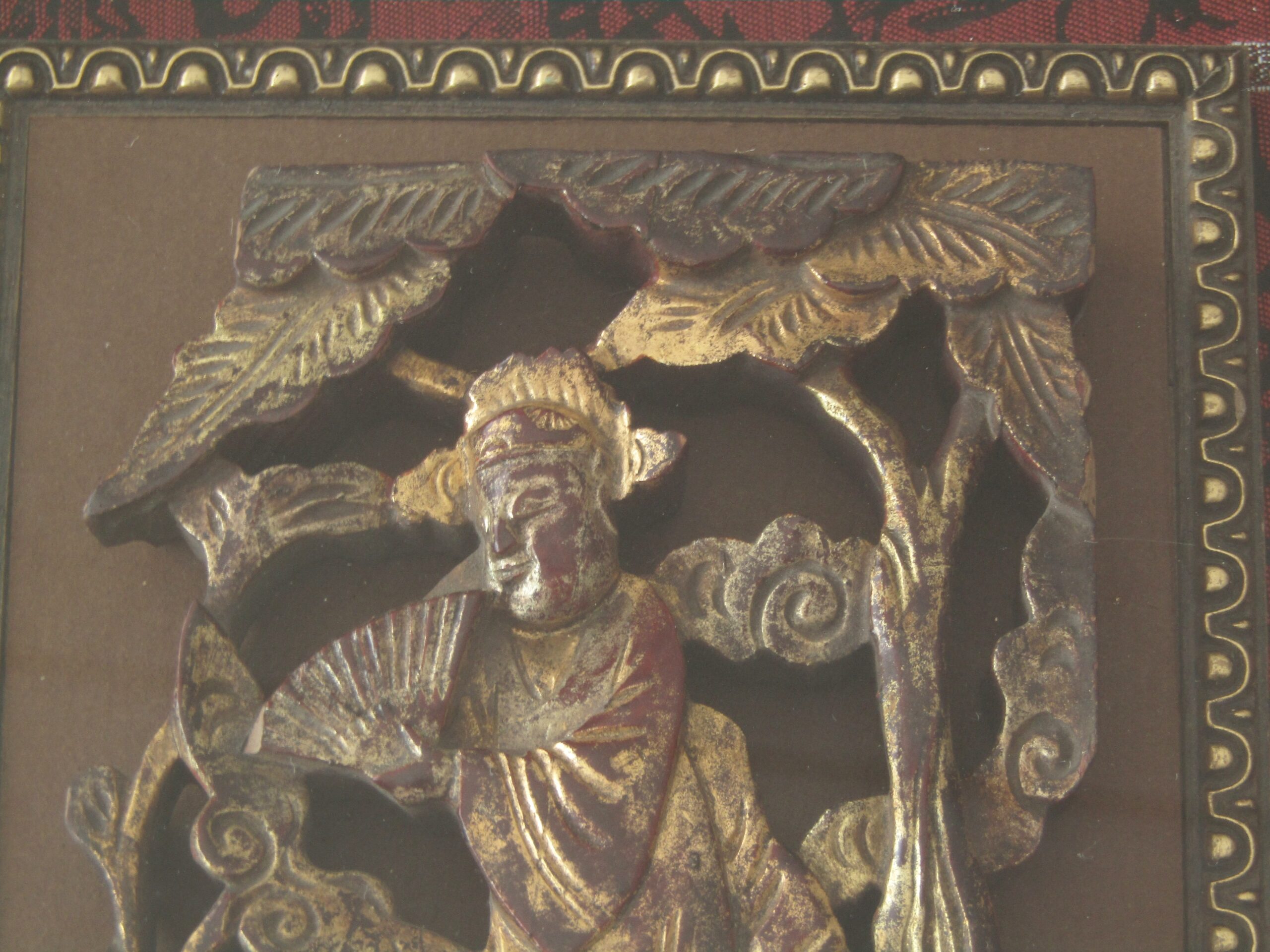 A beautiful, vintage oriental carved panel with gold gilt detail, in a silk-lined frame. See photos for details.