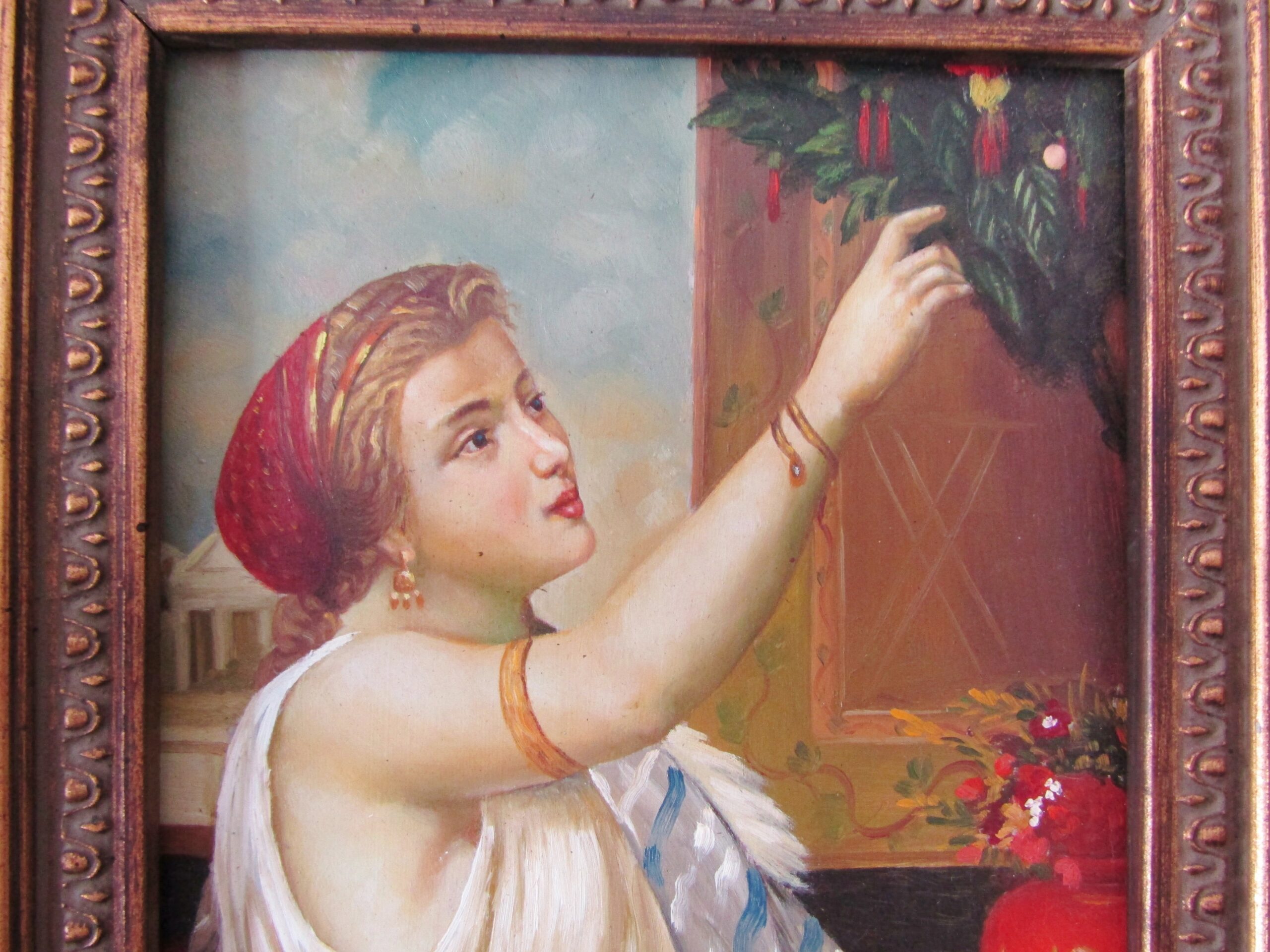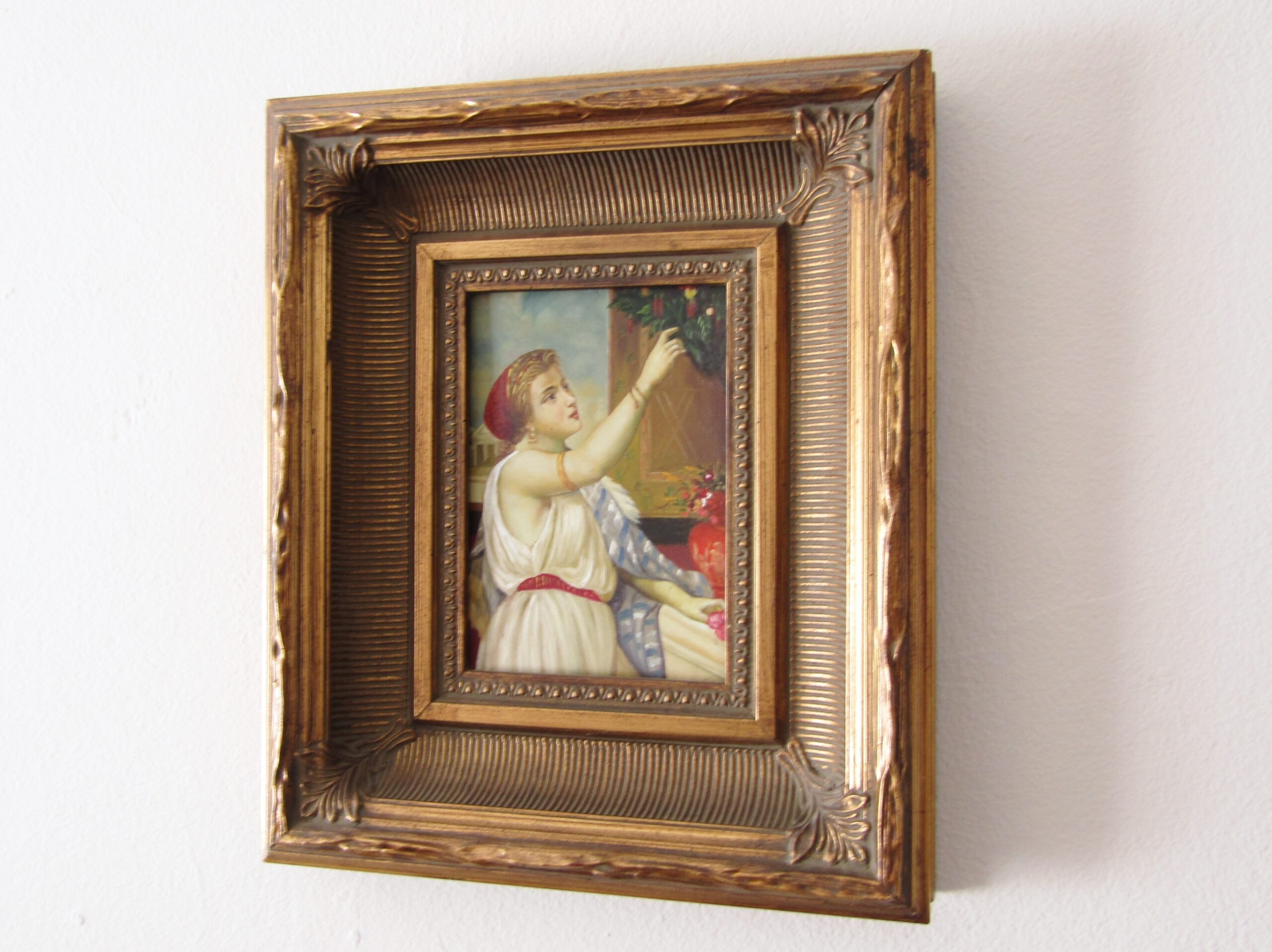 A beautiful, vintage original painting of an stylish traditional Greek or Italian woman, housed in original ornate frame. See photos for details. Originally purchased in Europe.