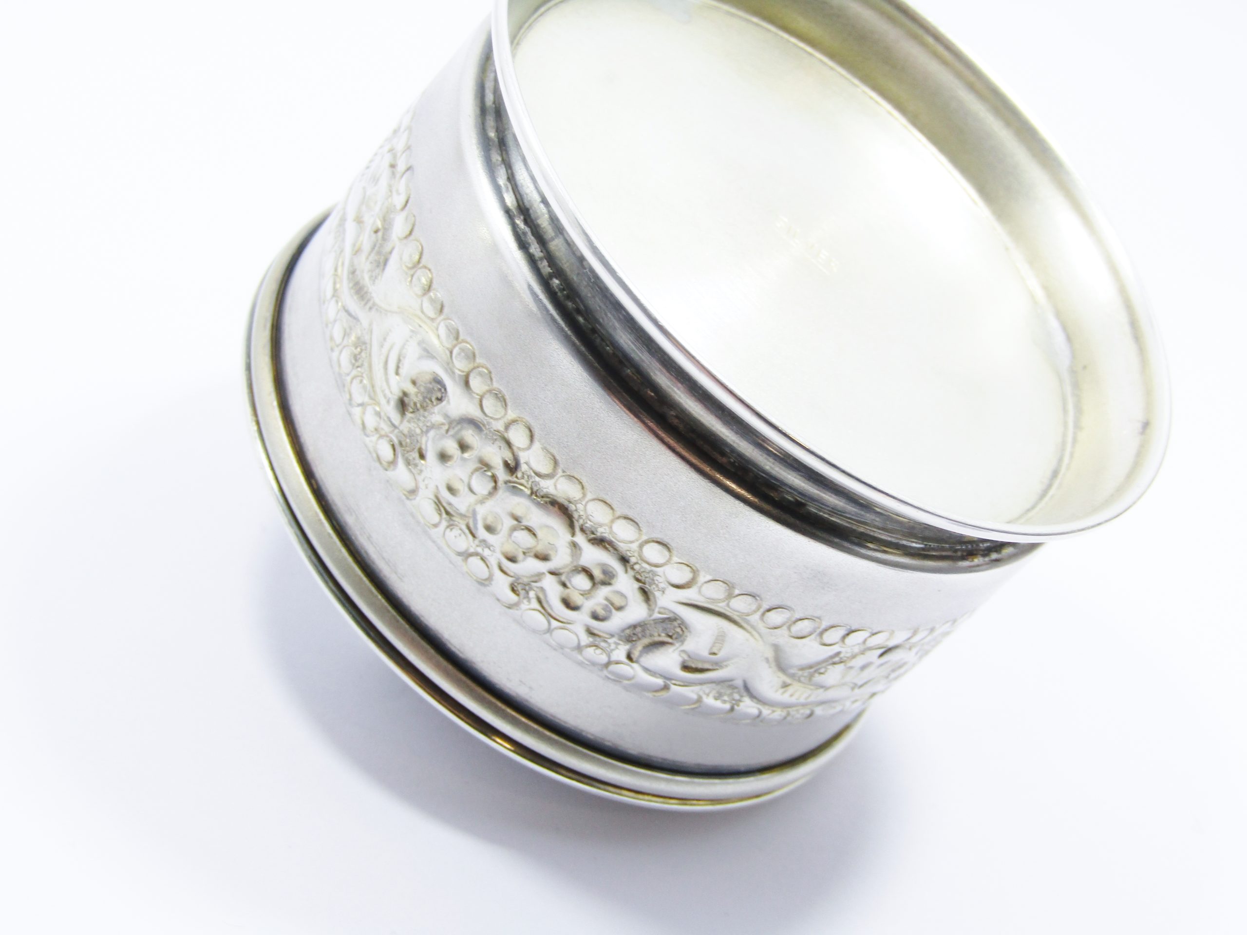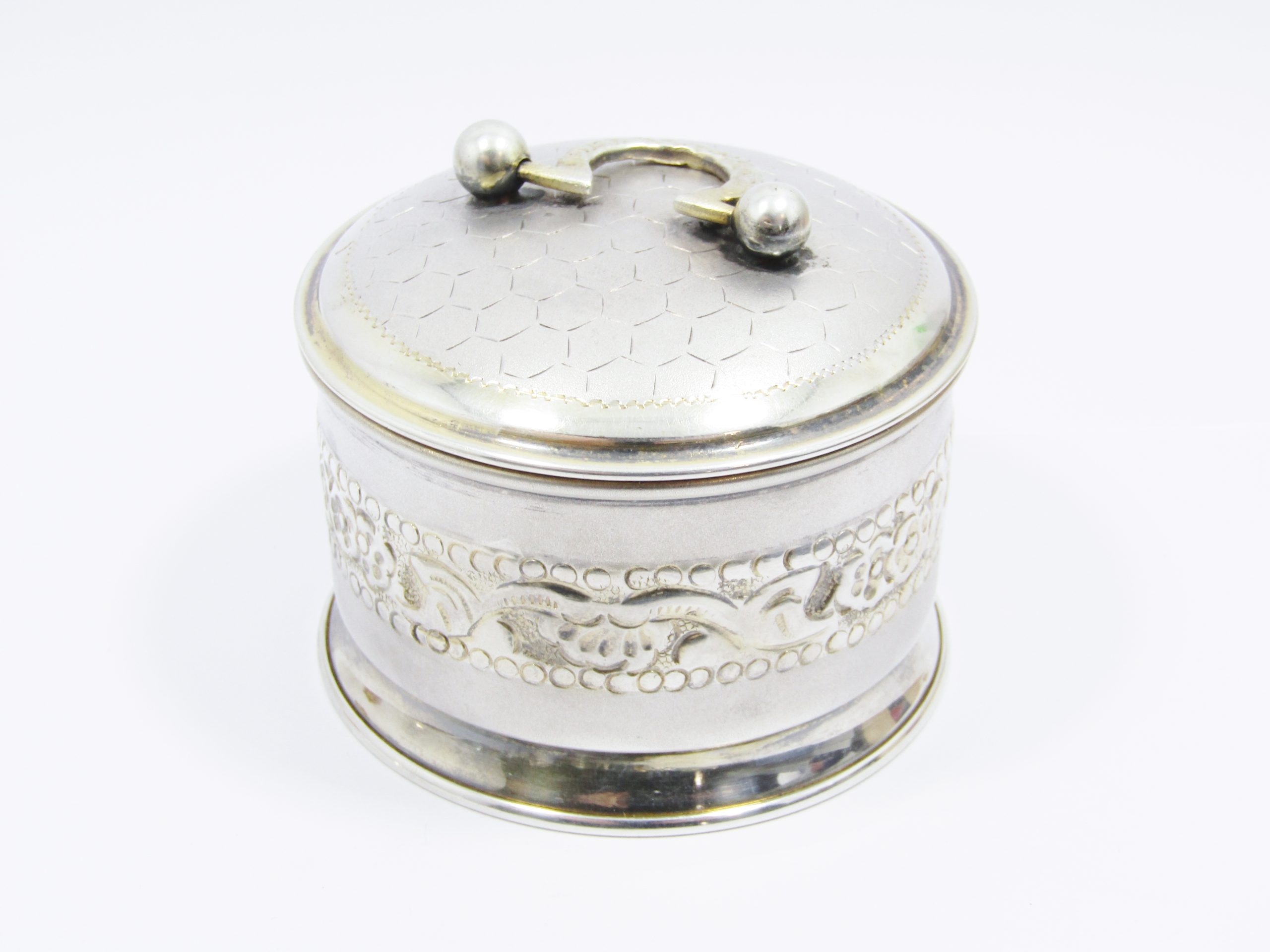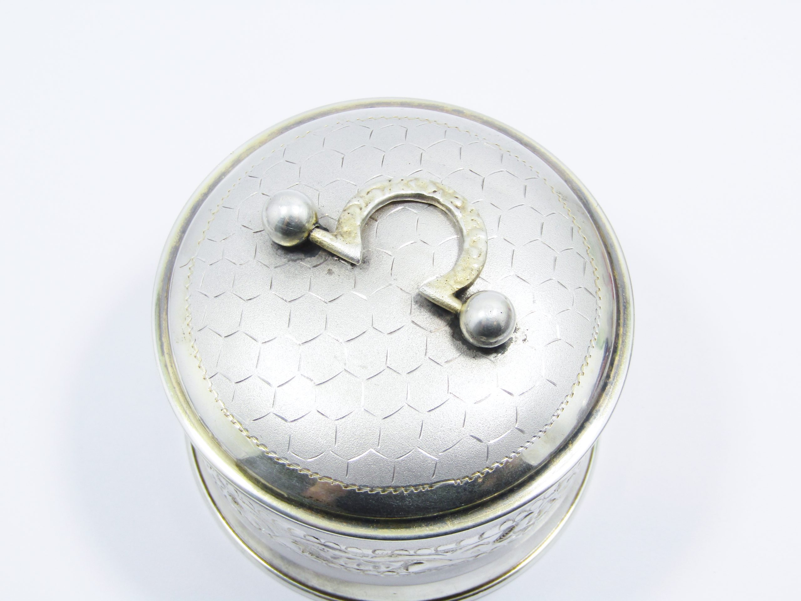 A beautiful, vintage sterling silver dressing table box, with engraved and brushed design with lovely honeycomb pattern on the lid and gilt details, with rich gold gilding on the inside. The piece is marked "SILVER" accordingly, see photos for details. In good overall condition with minimal age-related wear.