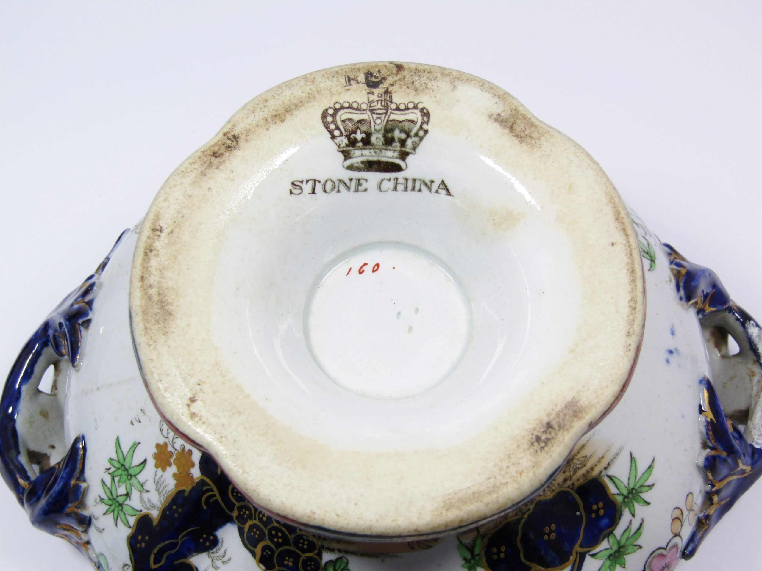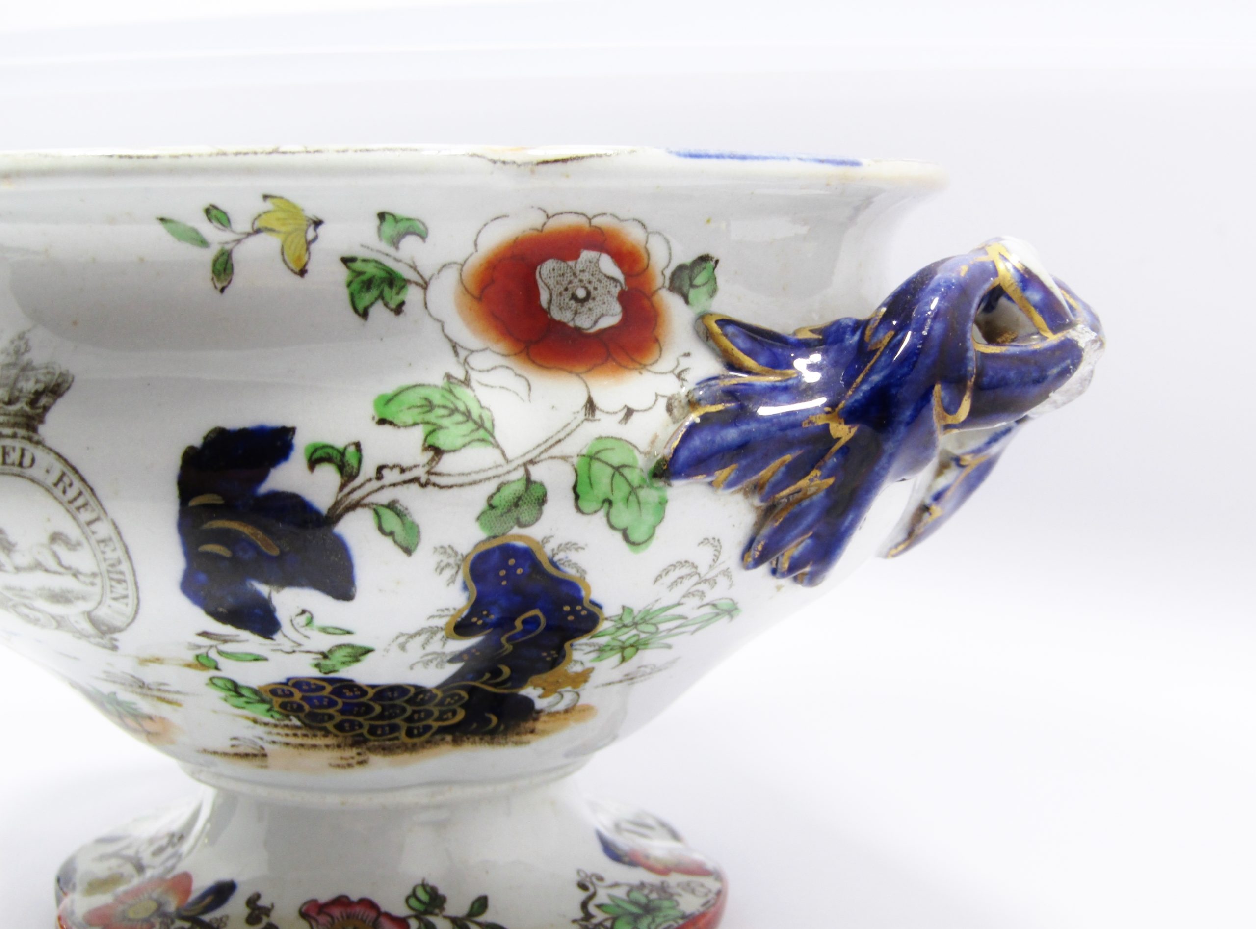The sugar bowl is in fair condition; the value is very much in the surviving artifact showing the heraldry.
