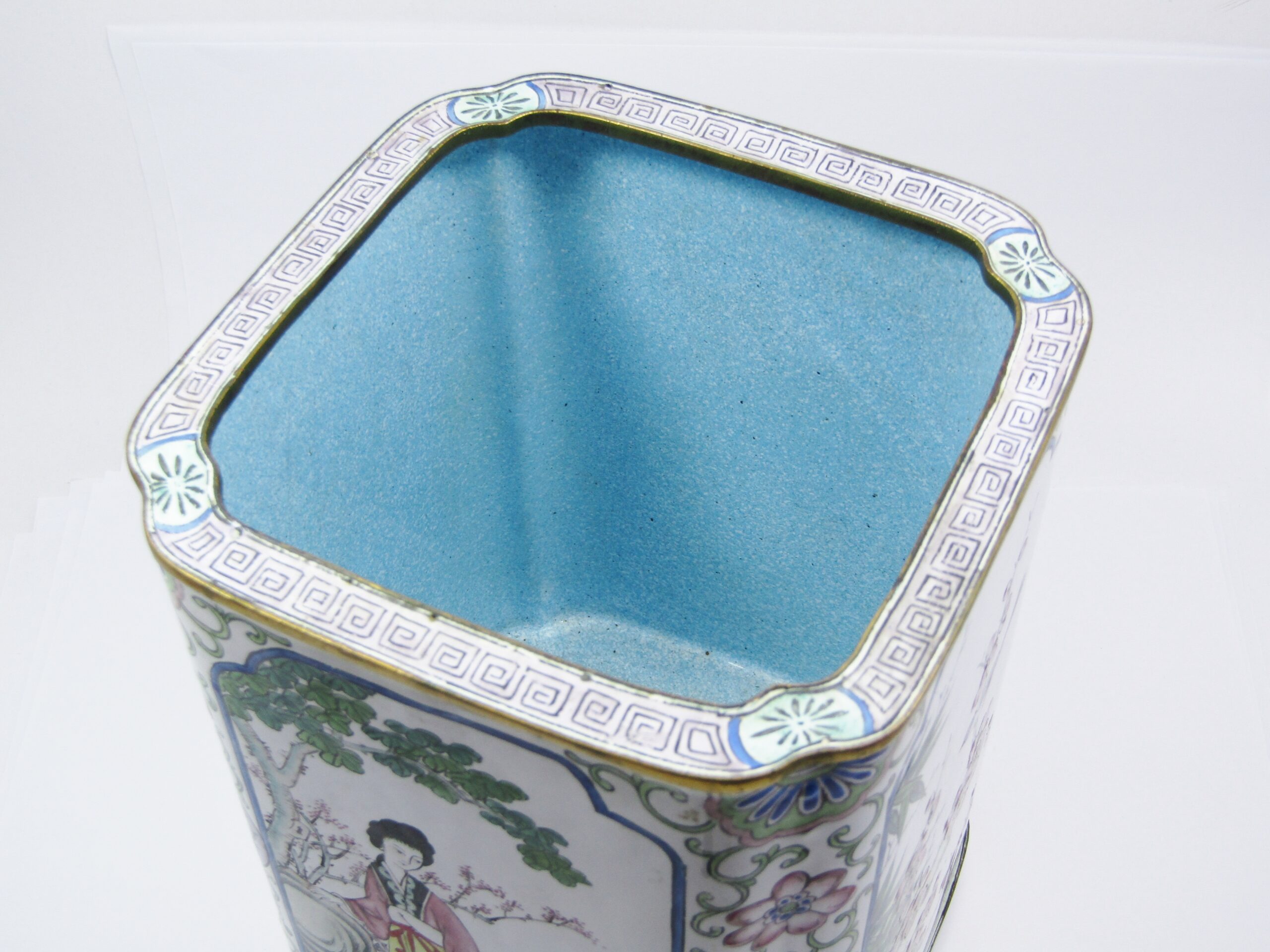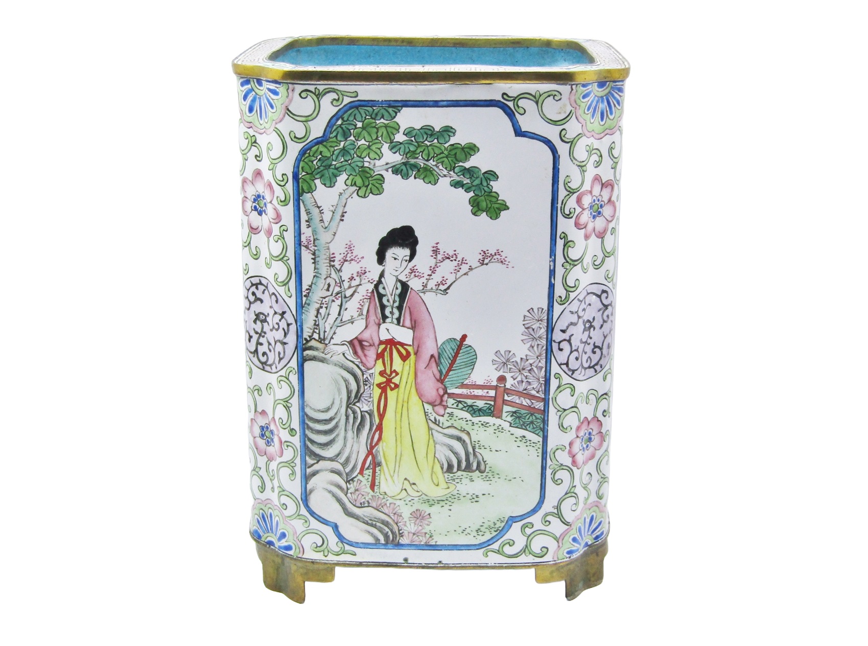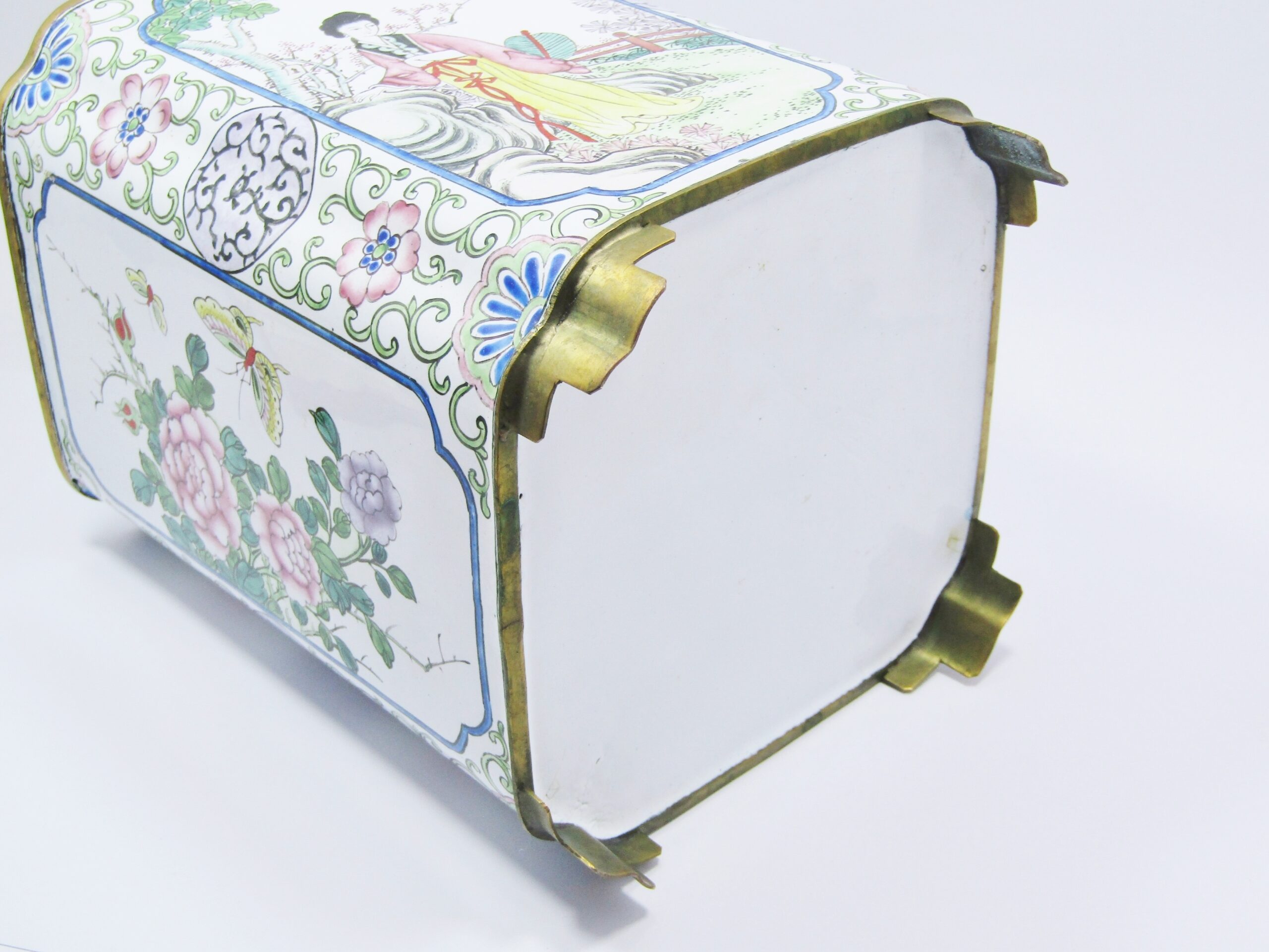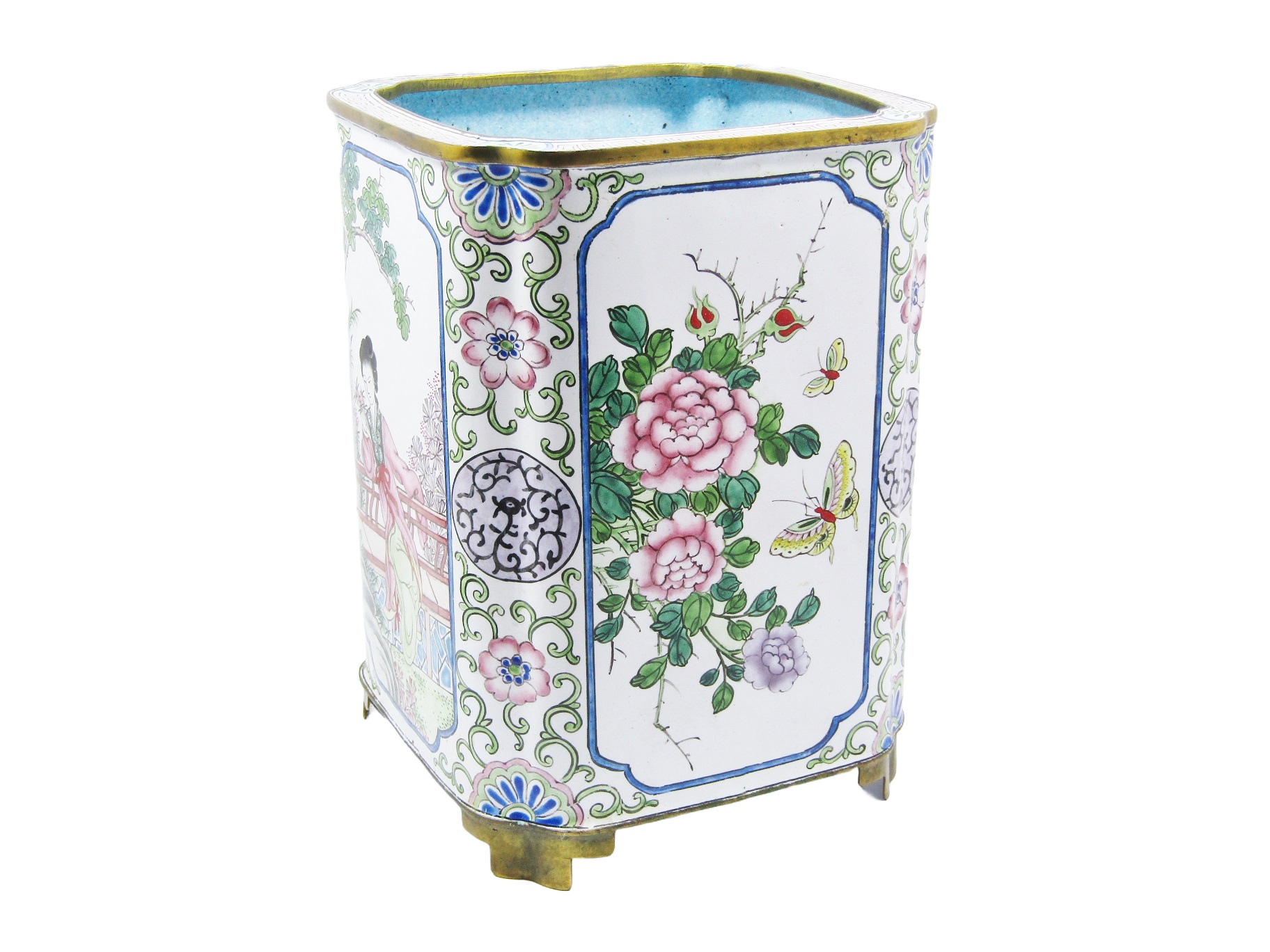 An exquisite, rare find - Cantonese enamels are sought-after for their fine hand-painted detail and scarcity. In this example we have a large circa 20th-Century brush pot rectangular in design with canted corners, adorned with beautiful detailed scroll work and four individually hand-painted panels. Two panels depicting oriental figures in garden scenes, and two panels with butterflies, flowers, cherry blossoms and birds. In excellent overall condition - see photos for details.