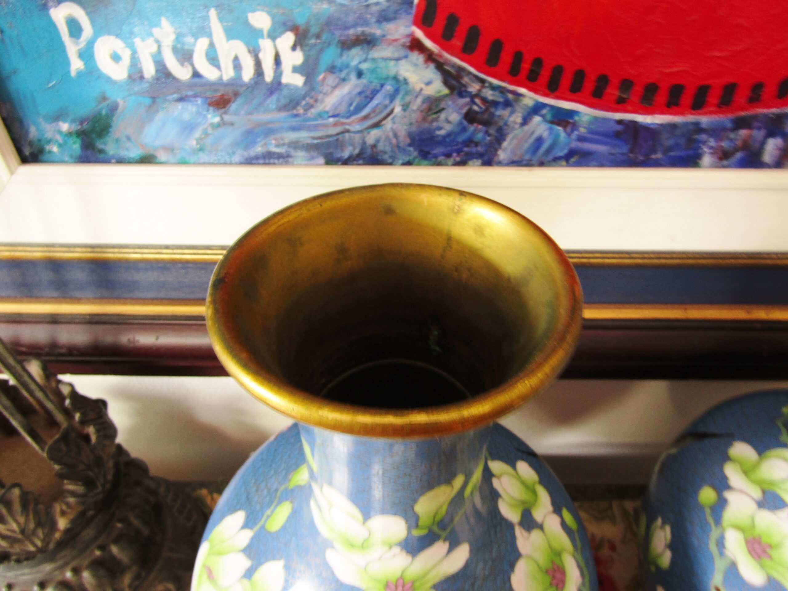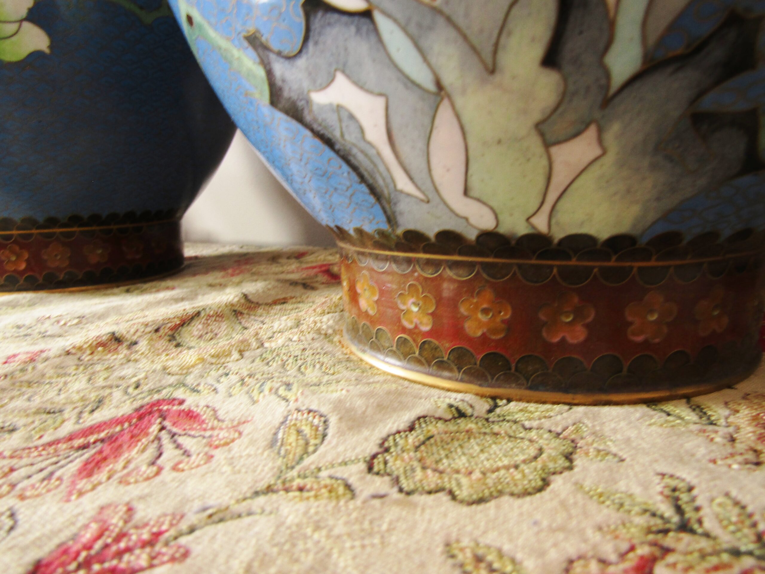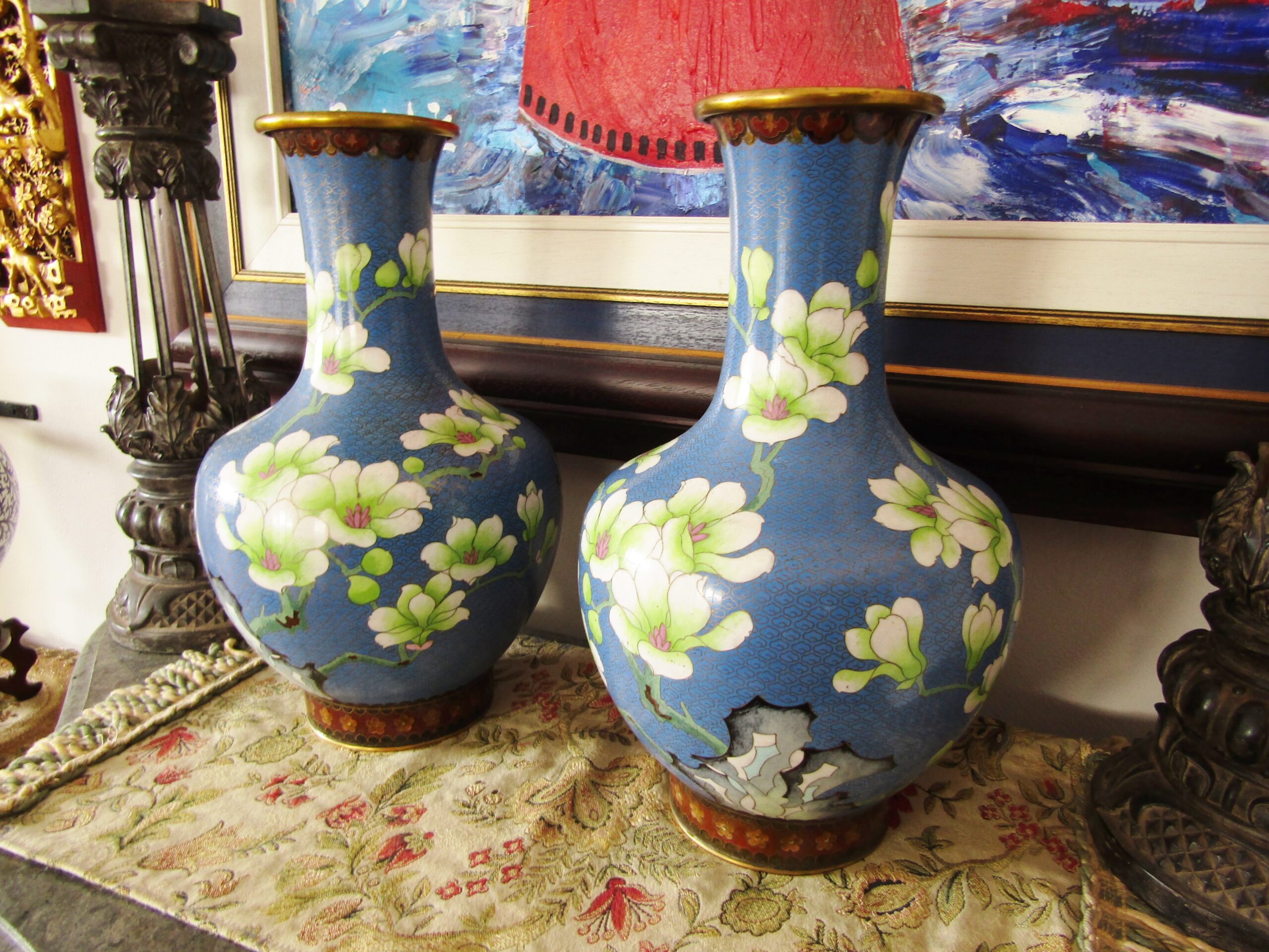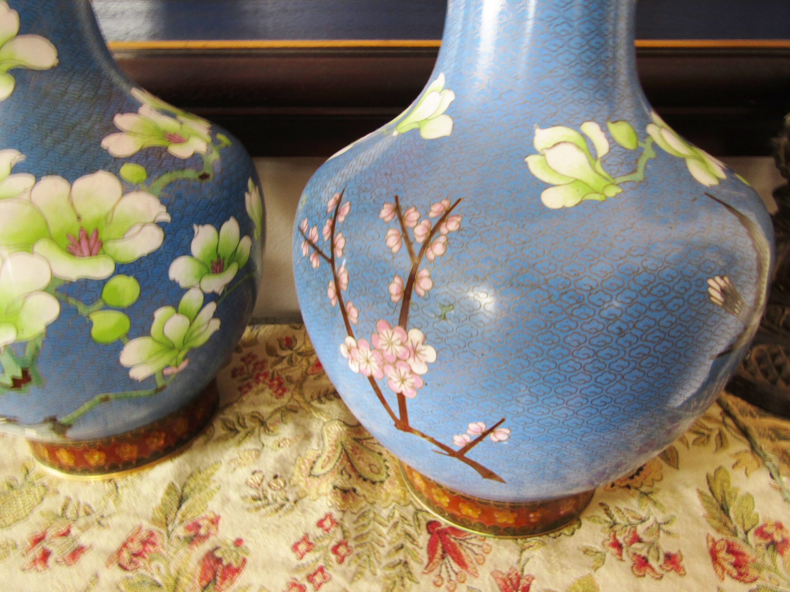 An exquisite pair of beautiful, large cloisonne vases, each with a blue background design with flower- and blossom detail. See photos for details, in perfect condition.