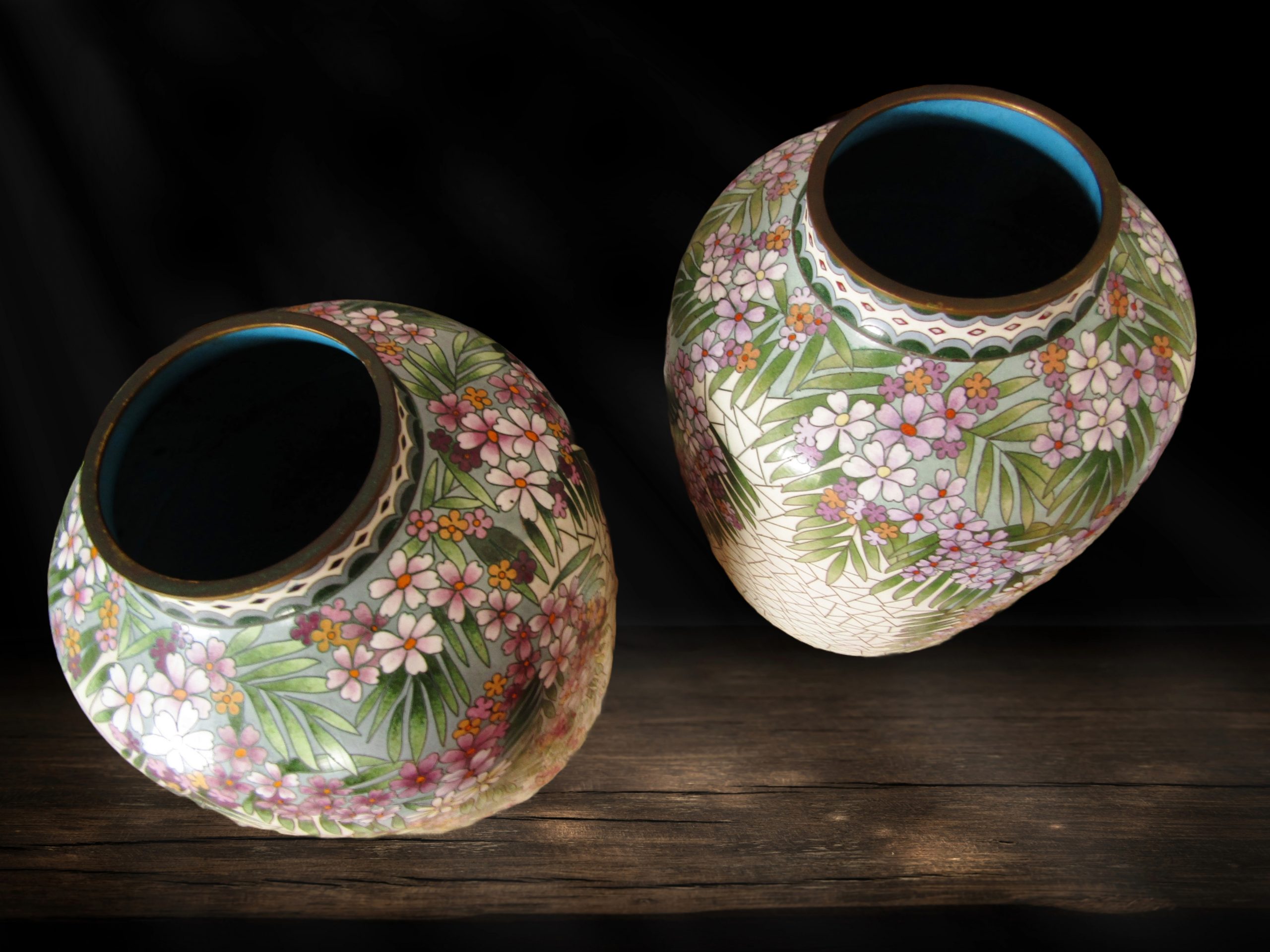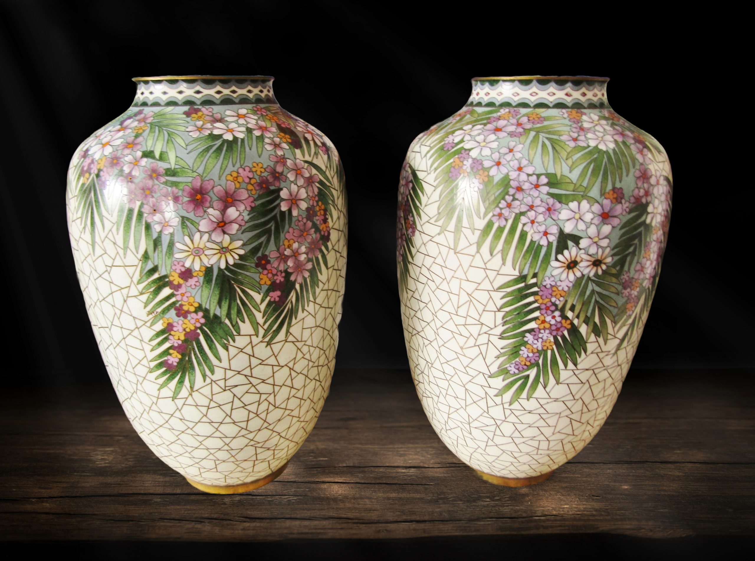 An exquisite pair of beautiful, large cloisonne vases, each with a cream mosaic design and flower and leaves detail. See photos for details, in perfect condition.