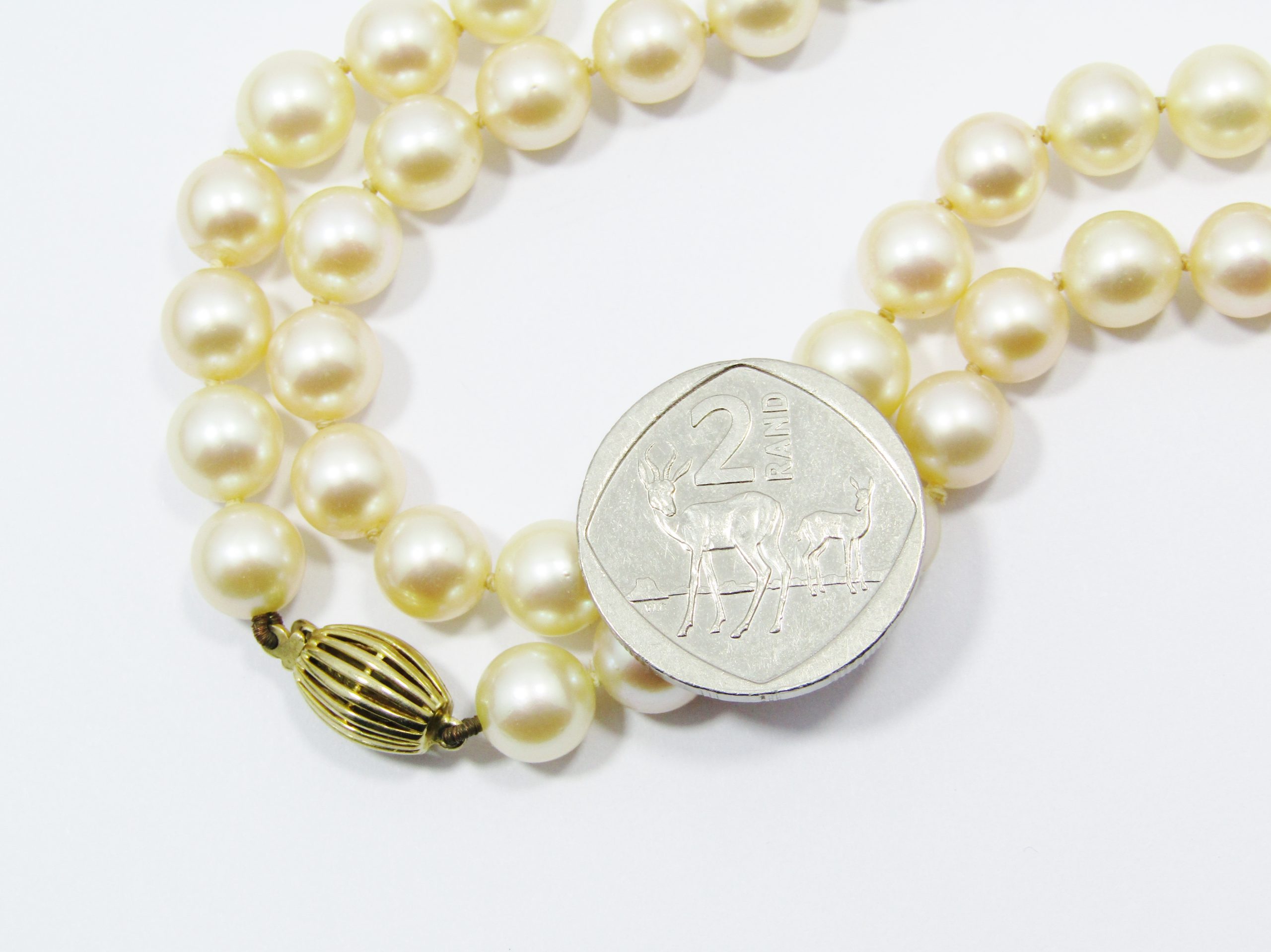 An exquisite vintage pearl necklace comprised of almost perfectly round large freshwater pearls, strung with a vintage 8ct gold (German in origin) clasp. Each pearl measures approximately 8 mm in diameter, in excellent overall condition with lovely creamish lustre. See photos for details.