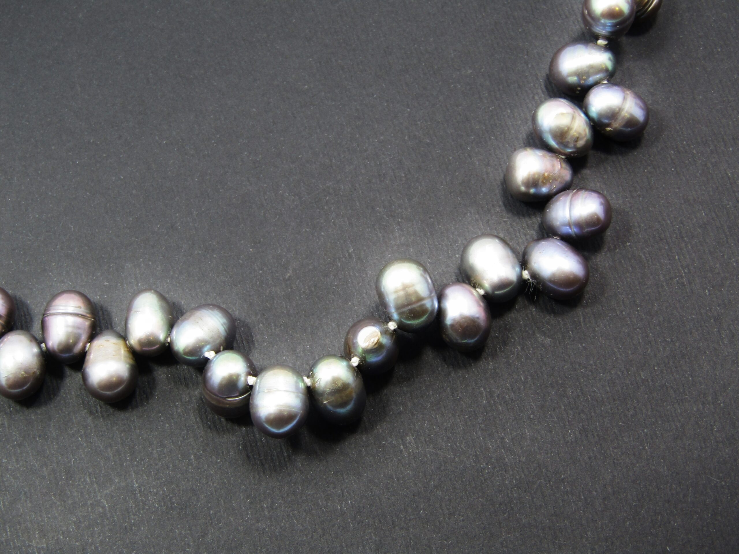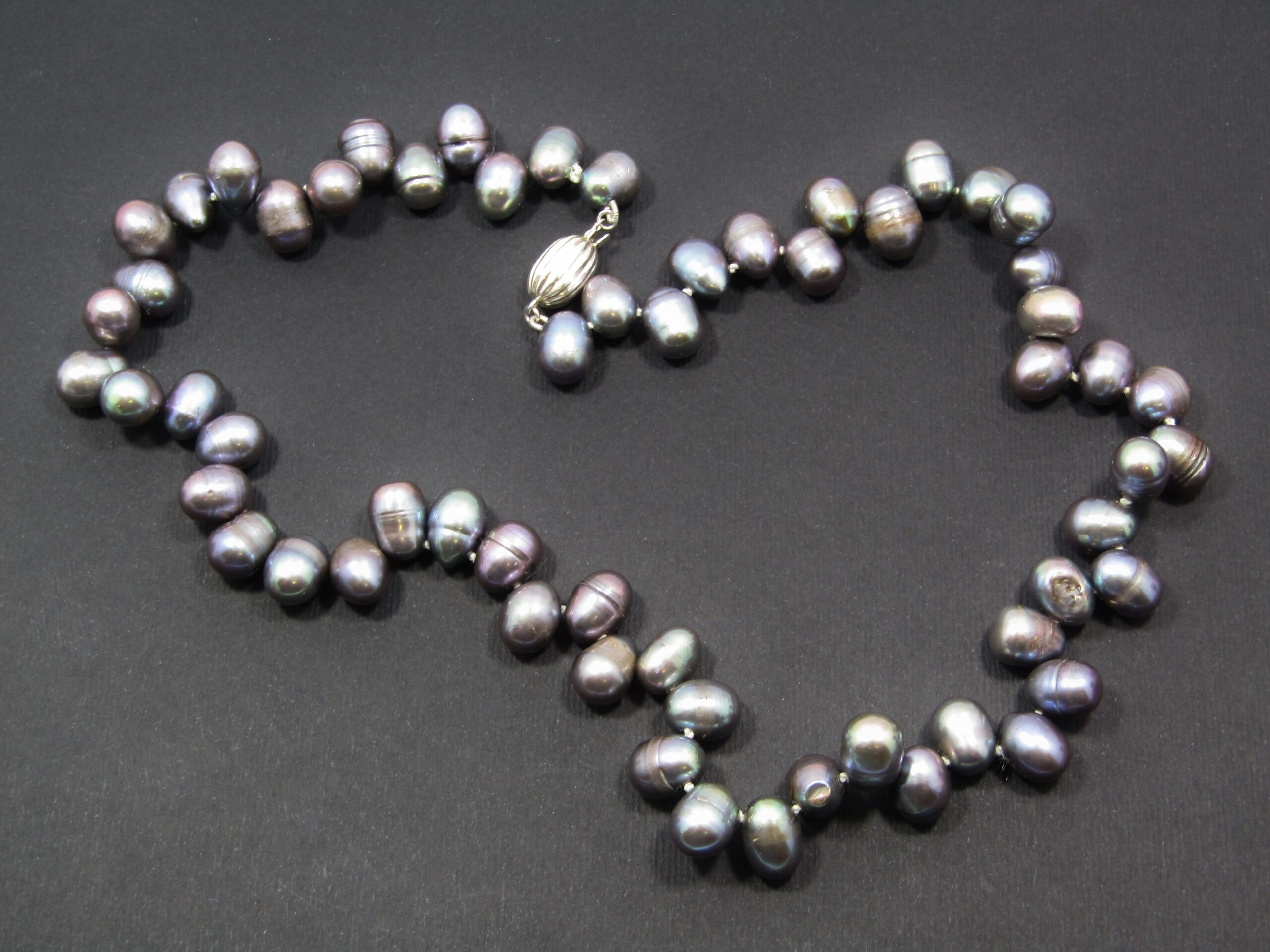 A Gorgeous String of Fresh Water Peacock Pearls With a Sterling Silver Clasp -See photos showing you more detail and design on this Amazing String has has been individually knotted -all in a beautiful condition with vibrant colors -The clasp is marked accordingly 925 Sterling Silver.