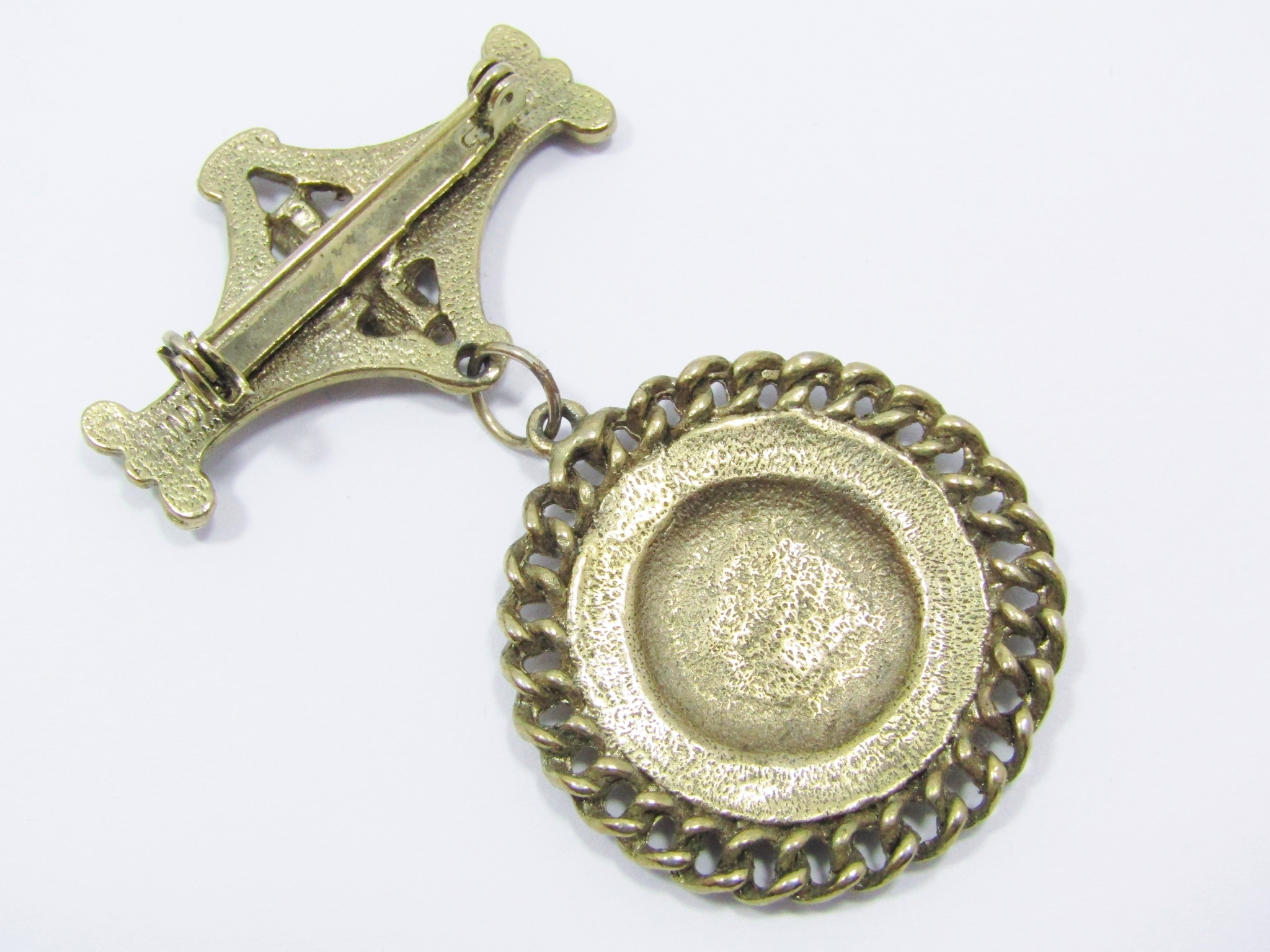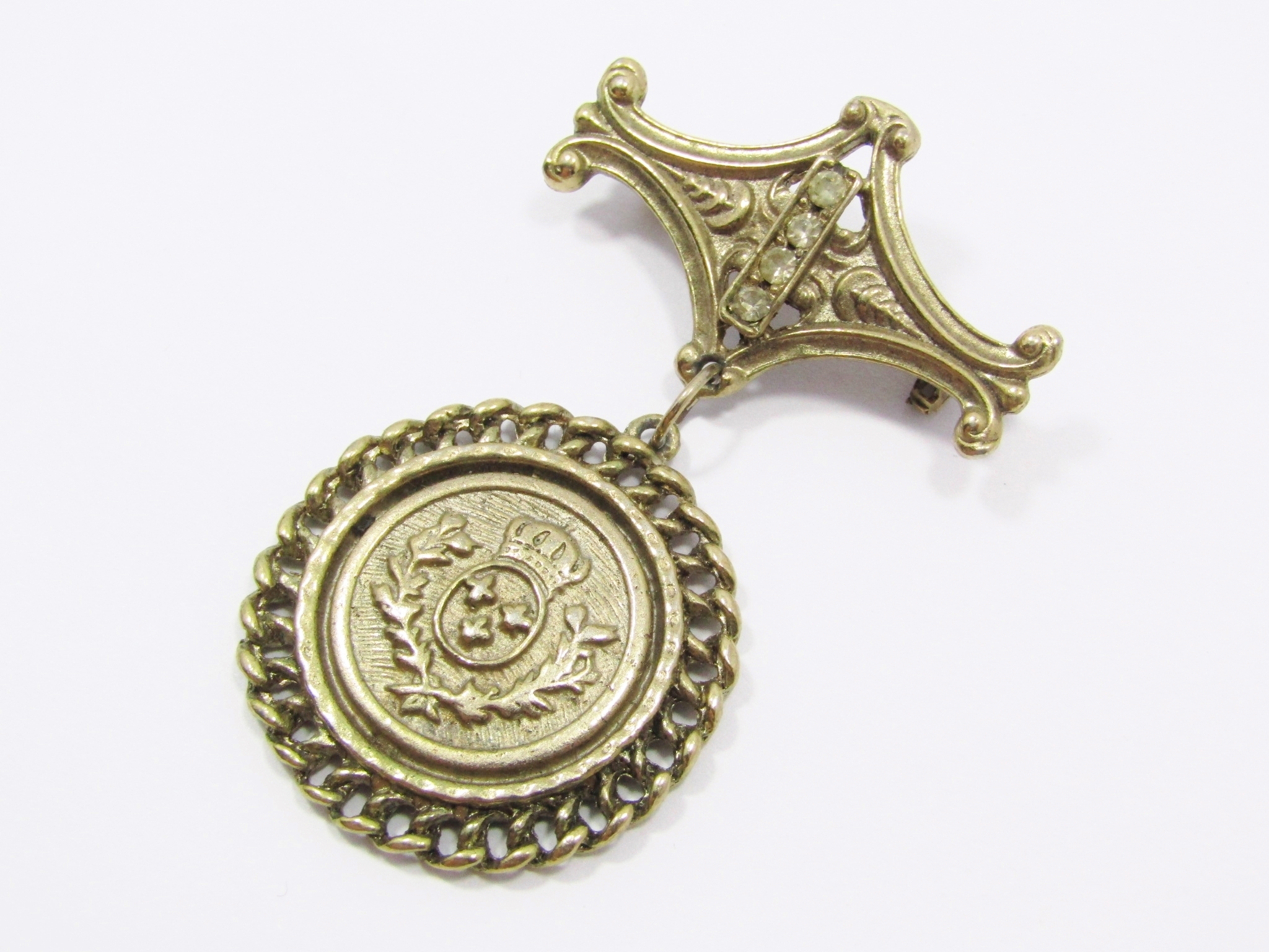 A lovely costume jewelry brooch, with a large round shield design dangle with crest detail. See photos for details.