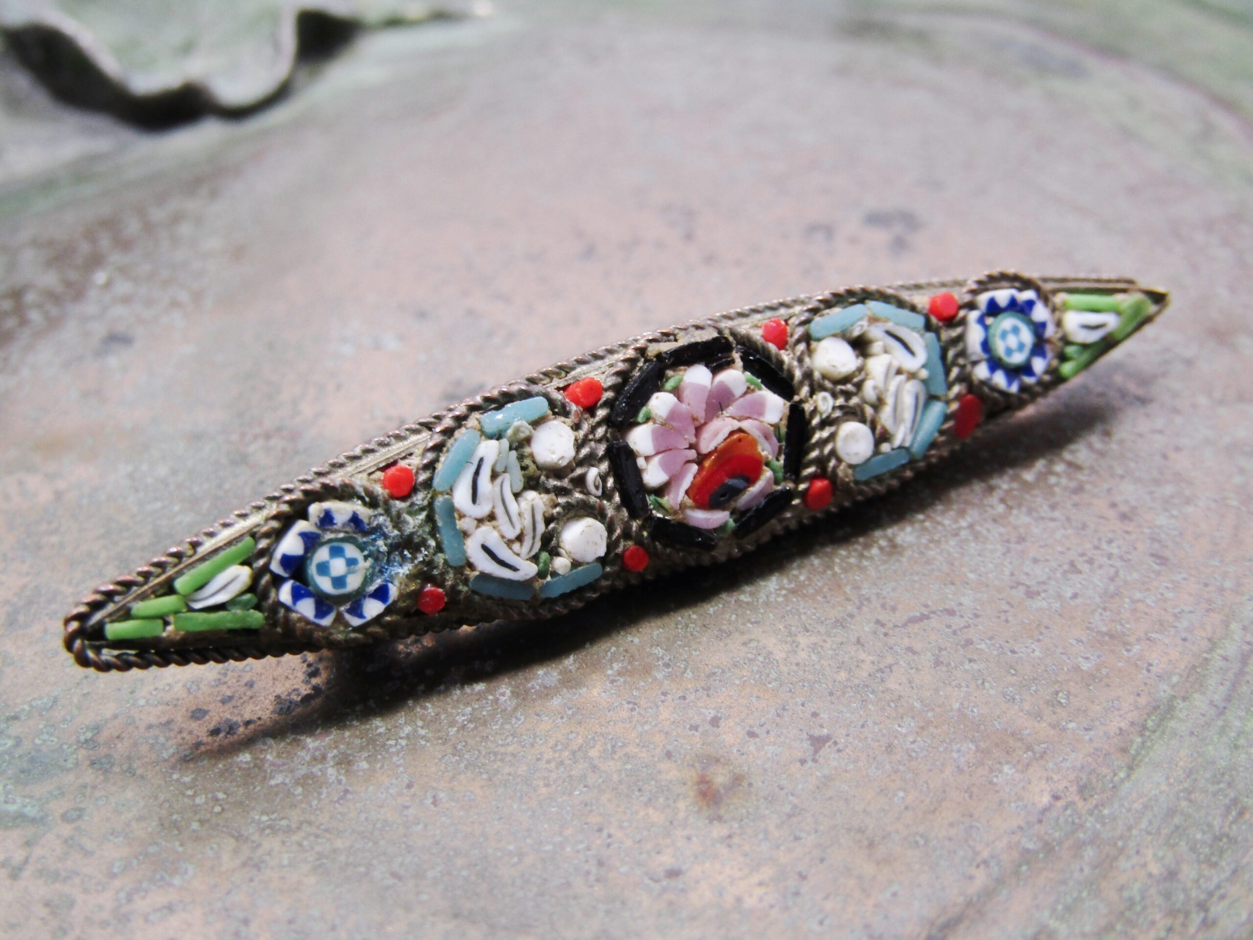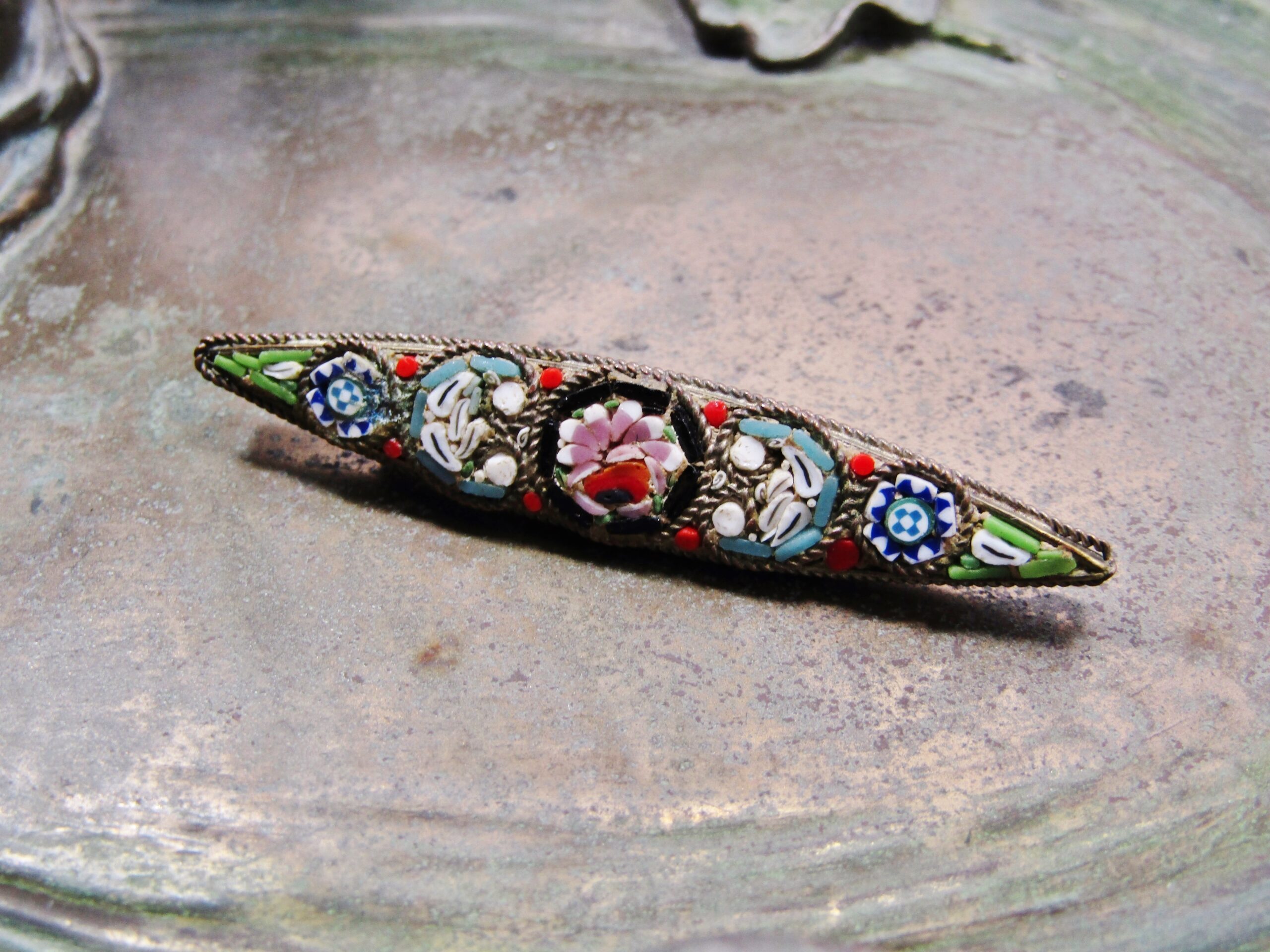 A Lovely Micro Mosaic Brooch in Brass Tone -See photos showing you more detail and design on this lovely piece -The brooch the Mosaic work is still in a lovely condition