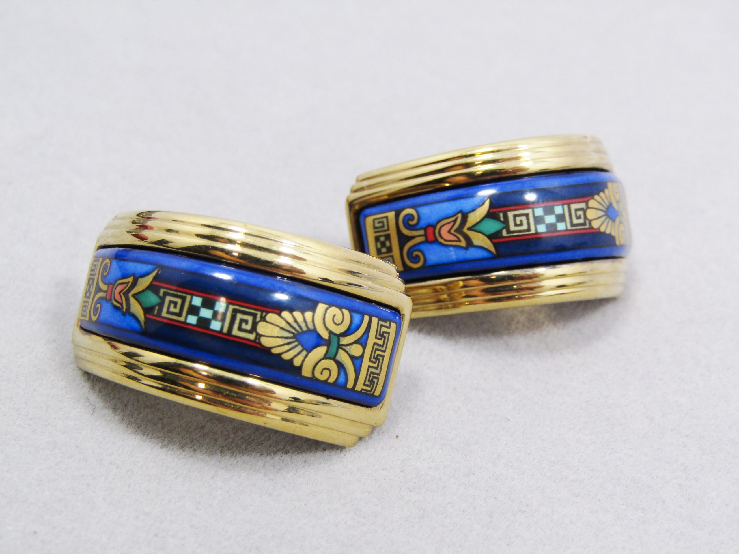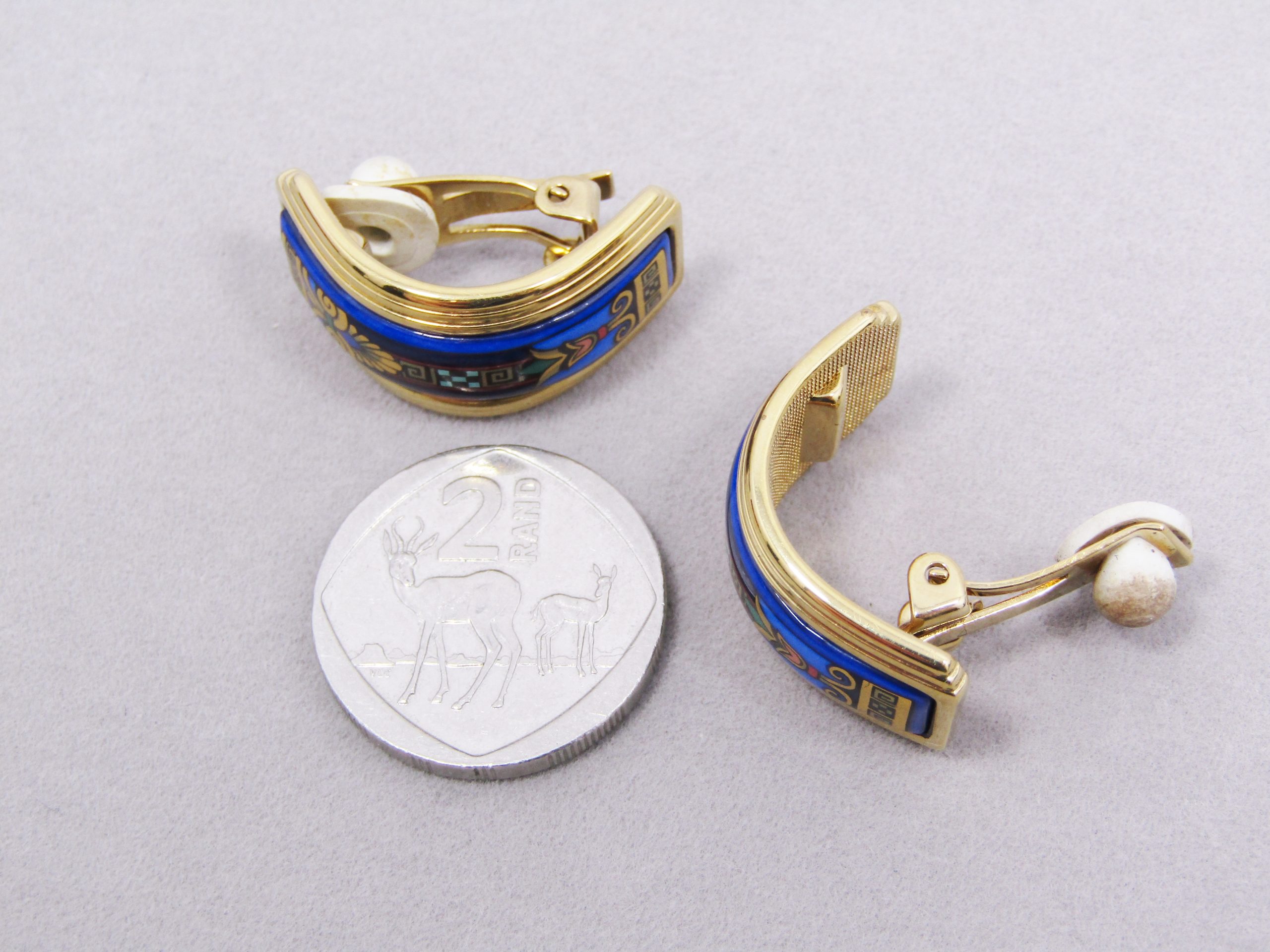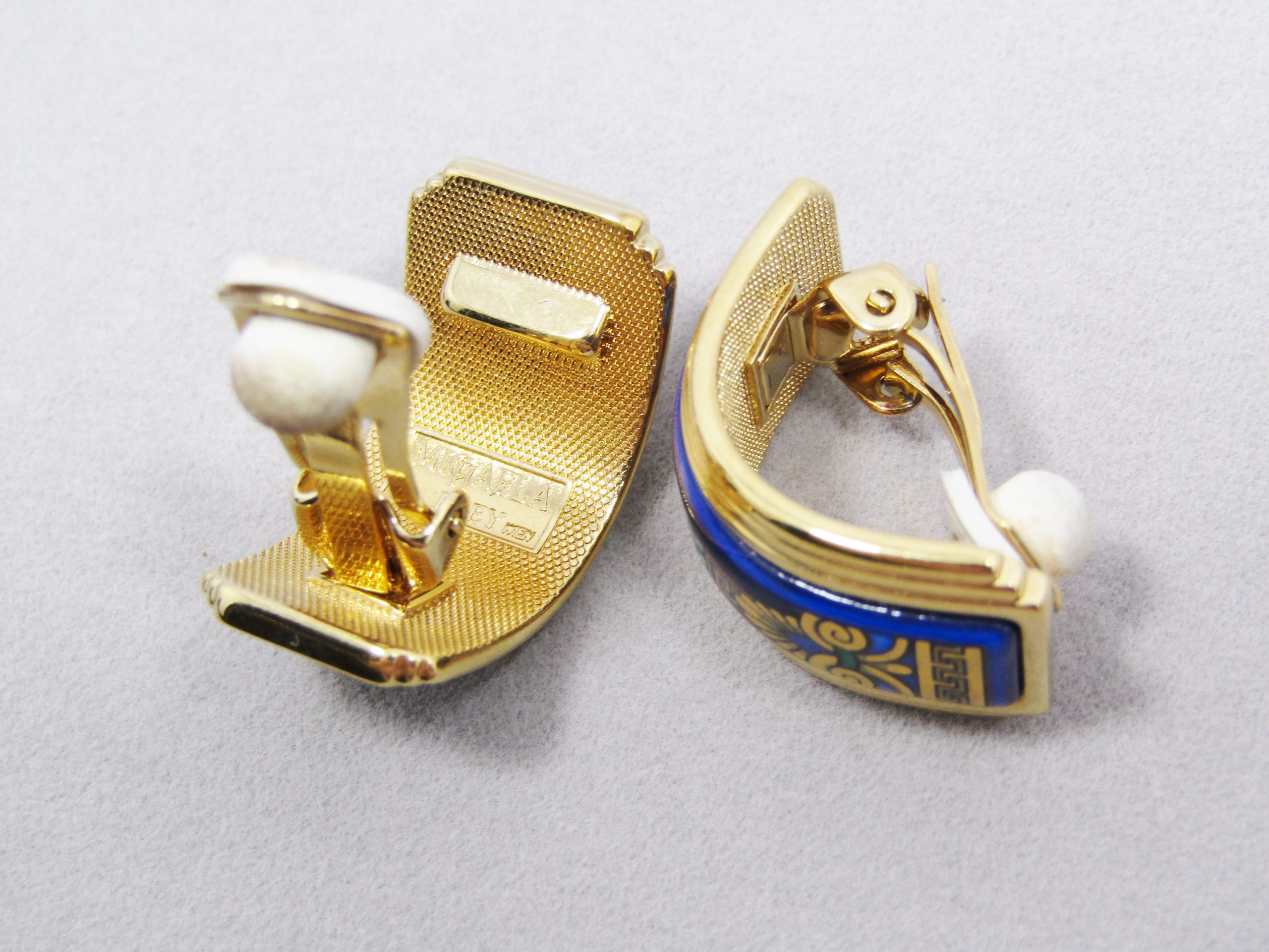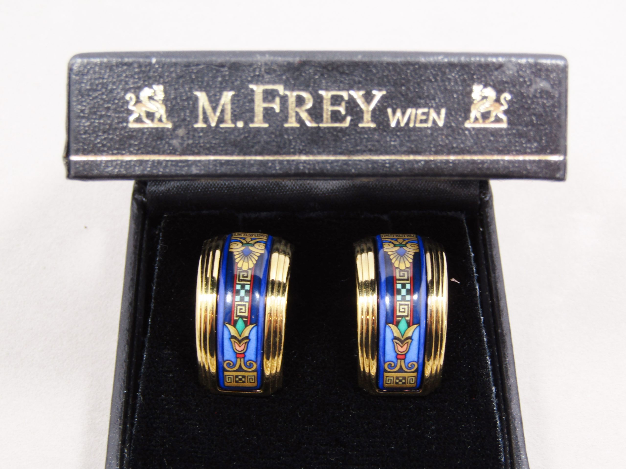 A stunning Michaela Frey Wille designer pair of clip-on earrings, in half-moon style with enameled detail, all in rich gold tone details. In excellent condition and marked accordingly - see photos for details! In original box.