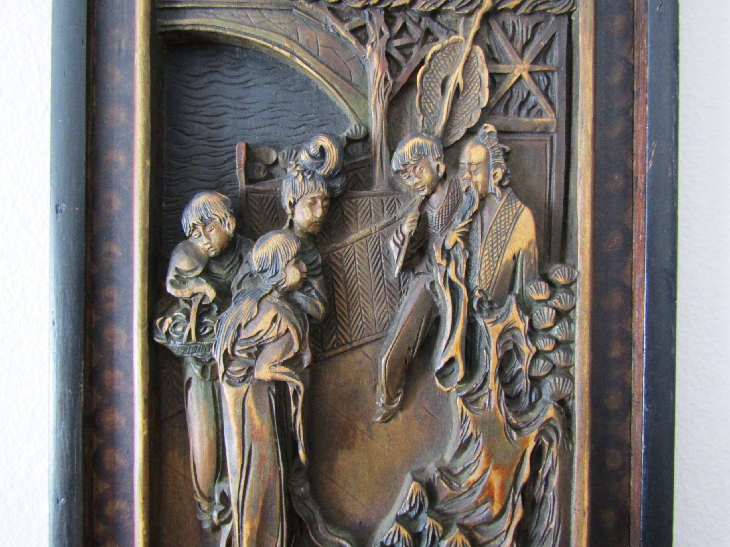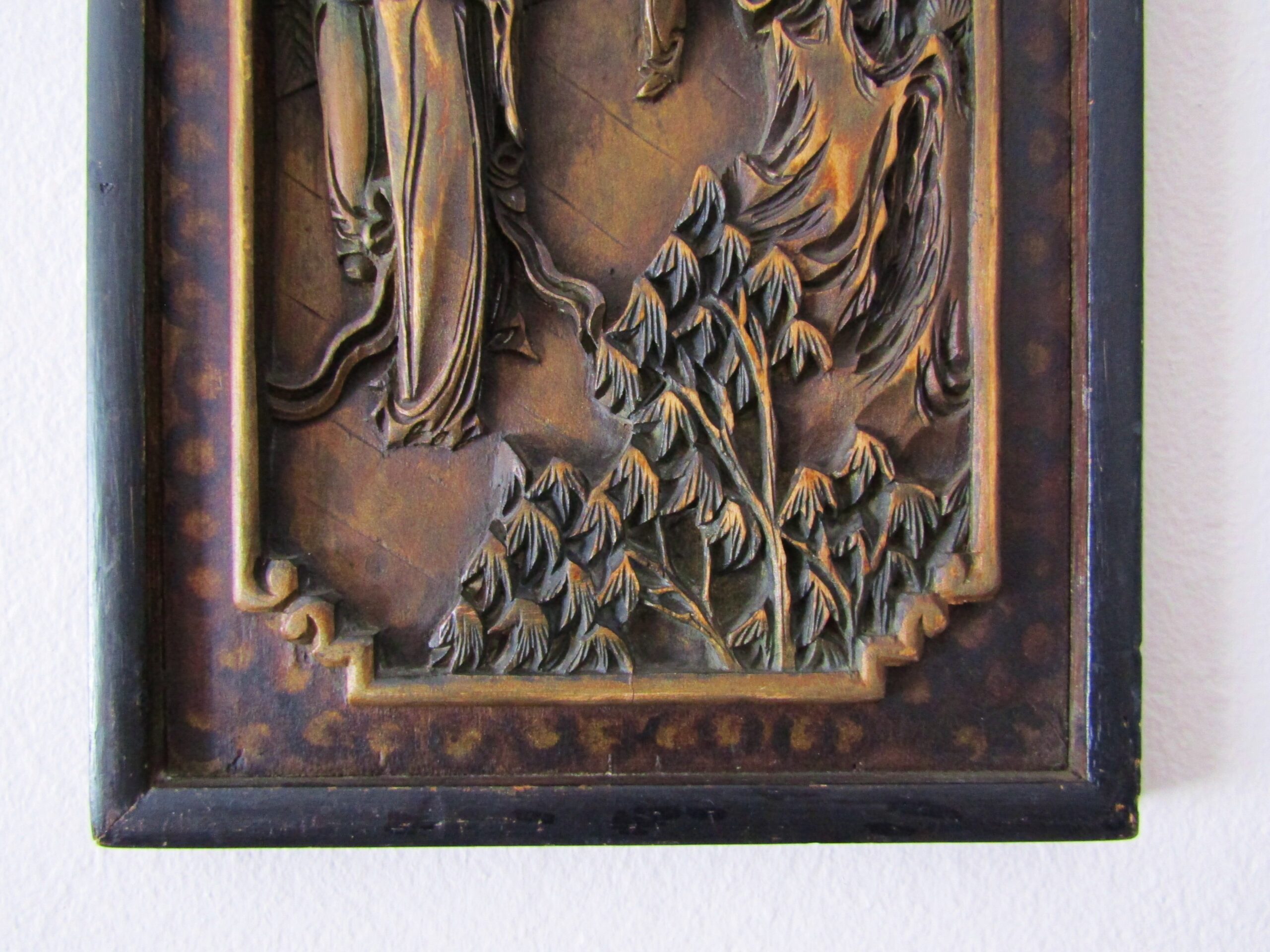 A beautifully carved oriental wooden panel, with a gold gilt oval centrepiece. See photos for details.