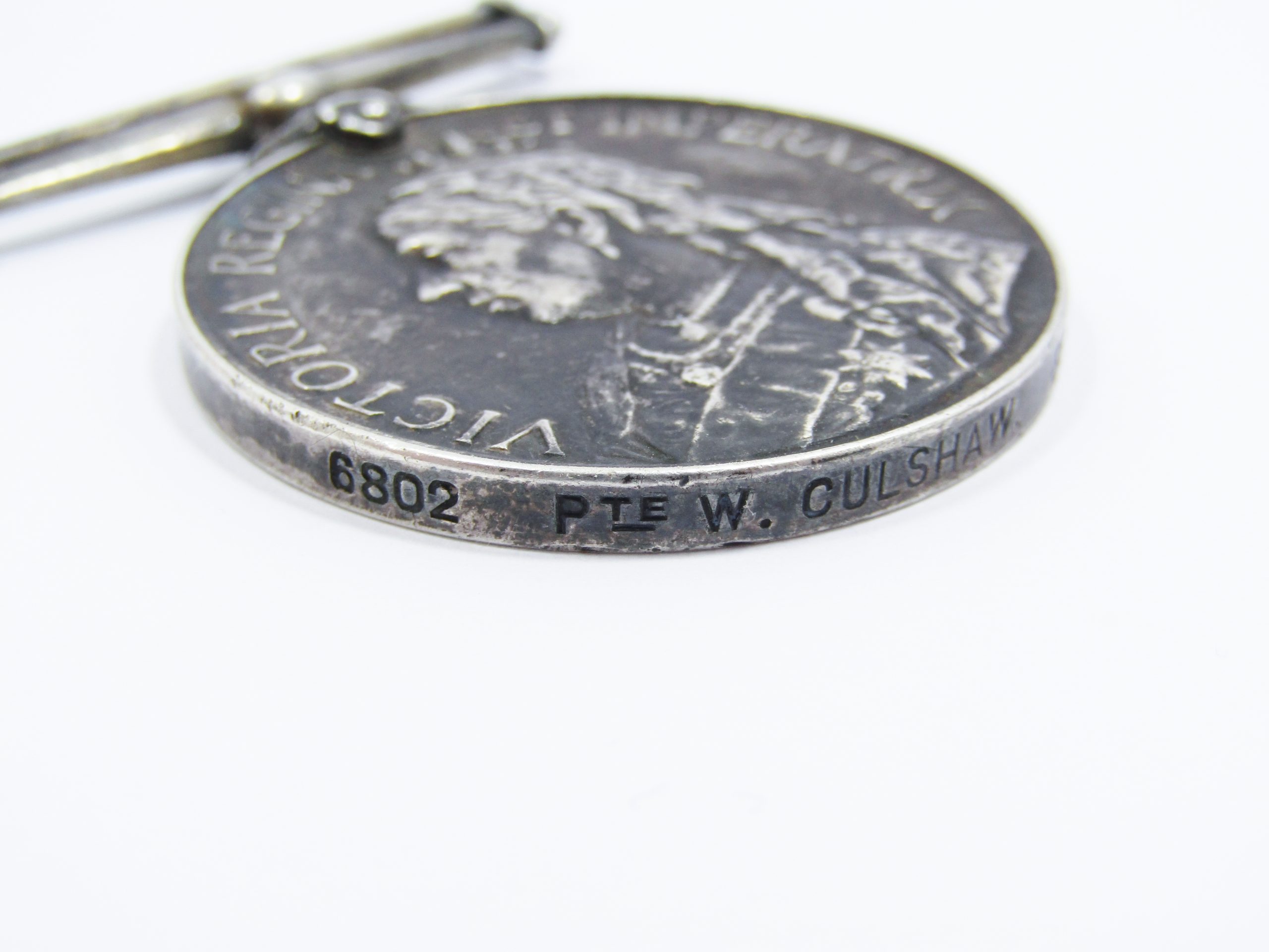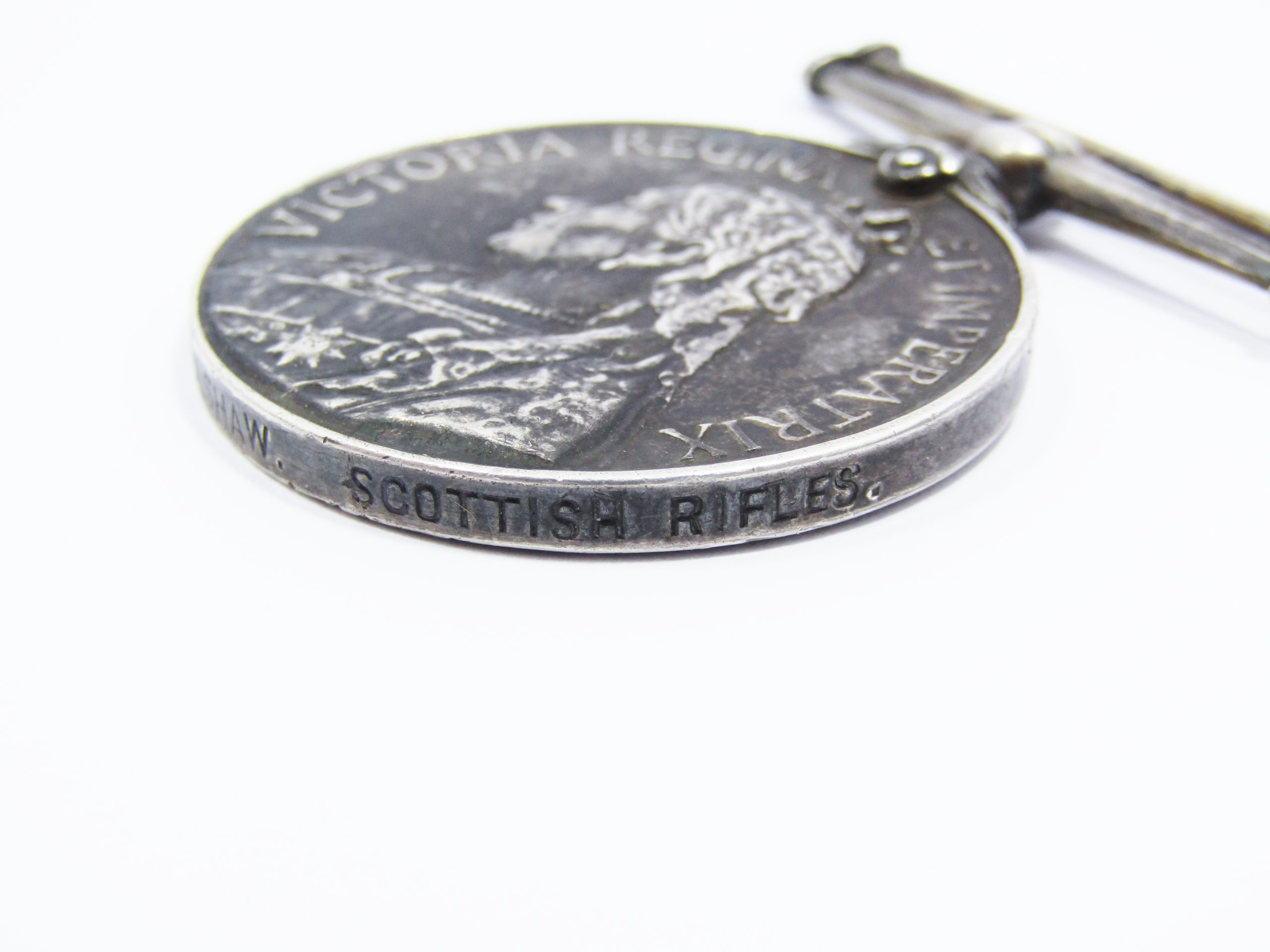 A Queen's South Africa Medal, awarded to British and Colonial military personell and other serving in the Second Boer War ending in 1902. Made of solid sterling silver, awarded to Pte W. Culshaw in the Scottish Rifles.