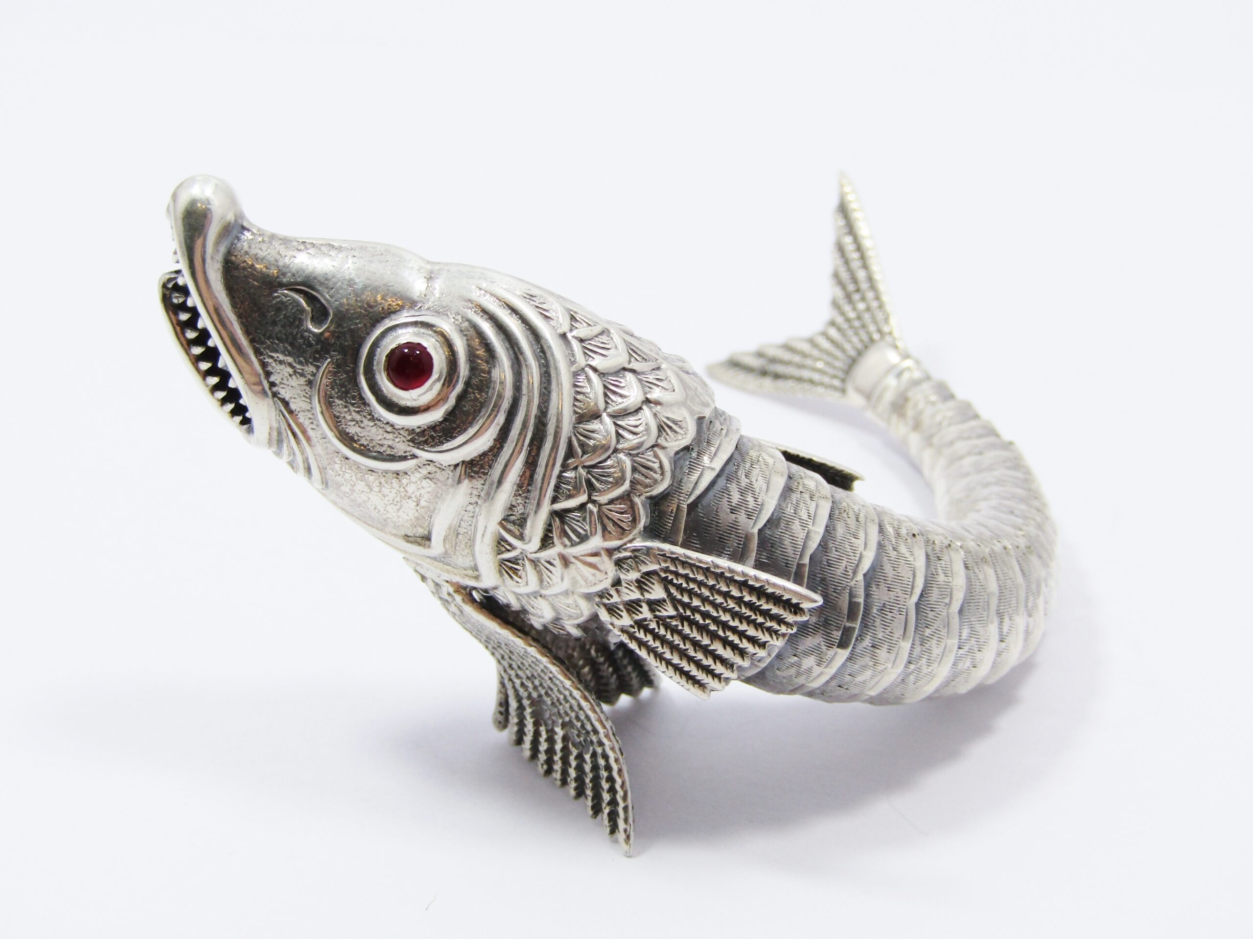 A beautiful, vintage articulated silver fish ornament, with Spanish silver hallmarks (915 silver purity, the Spanish standard of the period). Each piece of the body's scales are articulated, with lovely detail and glass cabochon eyes. See photos for details, in excellent condition. Please also see the other two variations available.