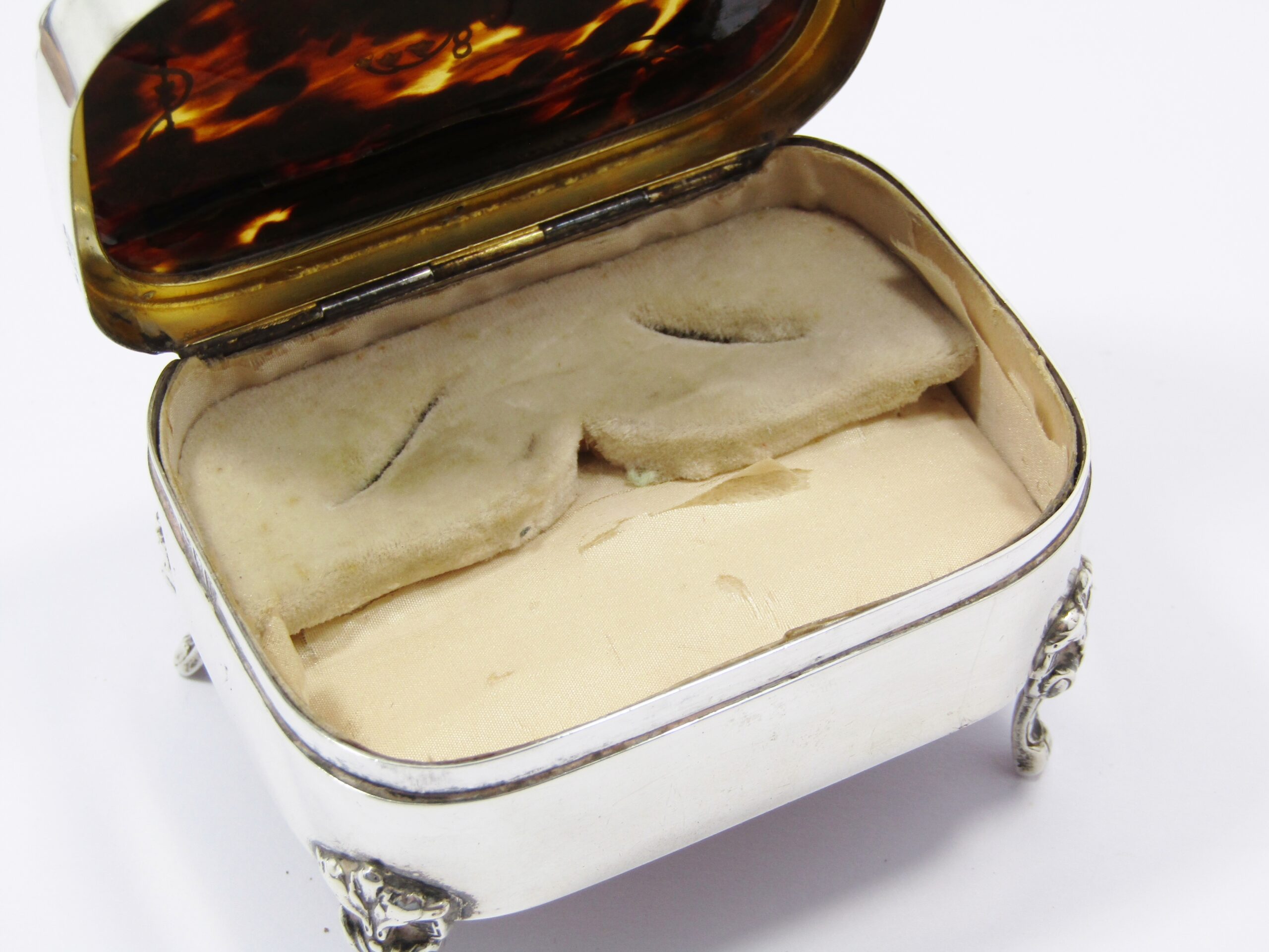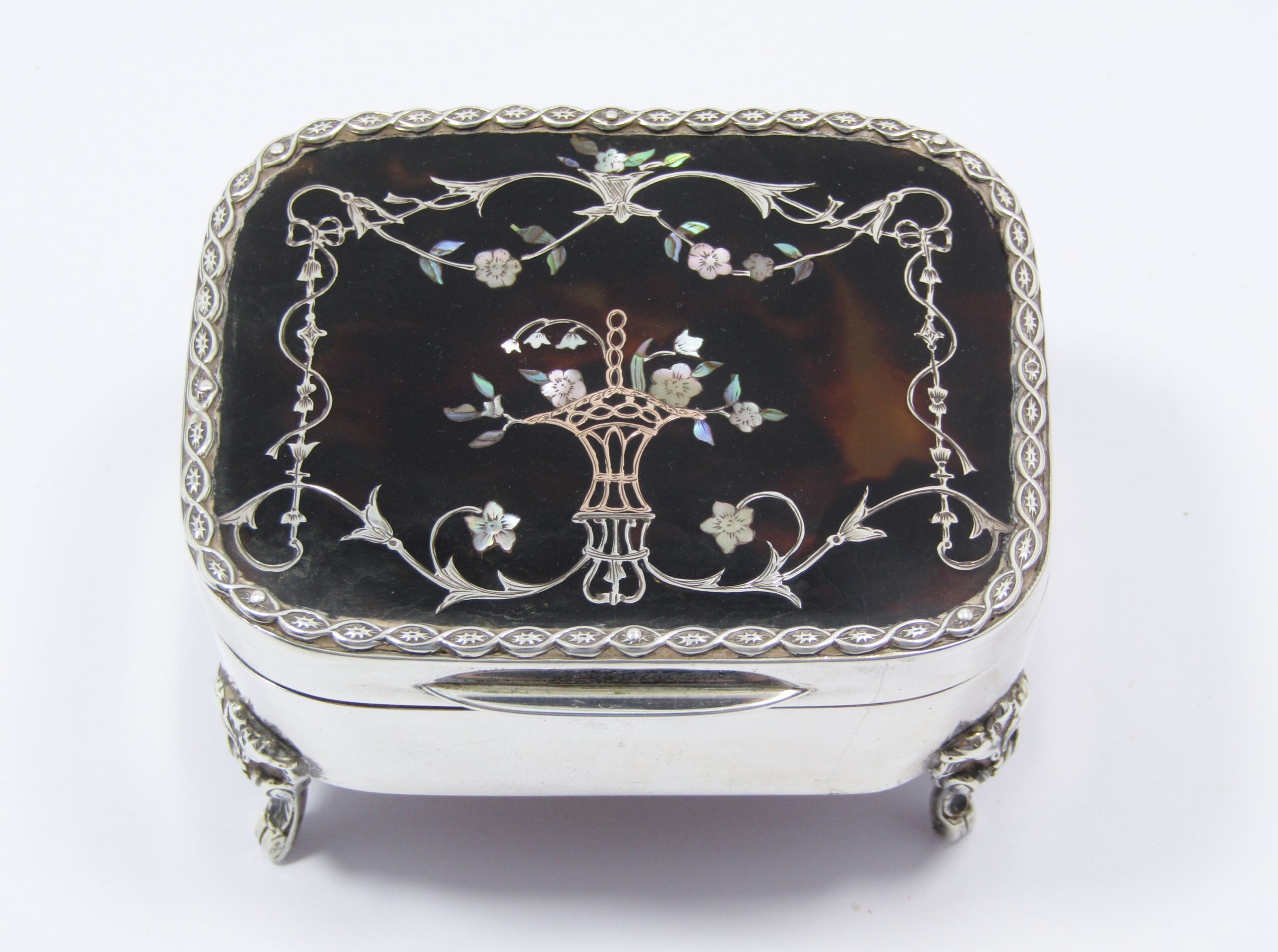 A rare find, this beautiful antique sterling silver box with tortoise shell lid is beautifully inlaid with mother of pearl, paui shell, silver, and gold. The piece is hallmarked for London England with date letter for 1907. See photos for details.