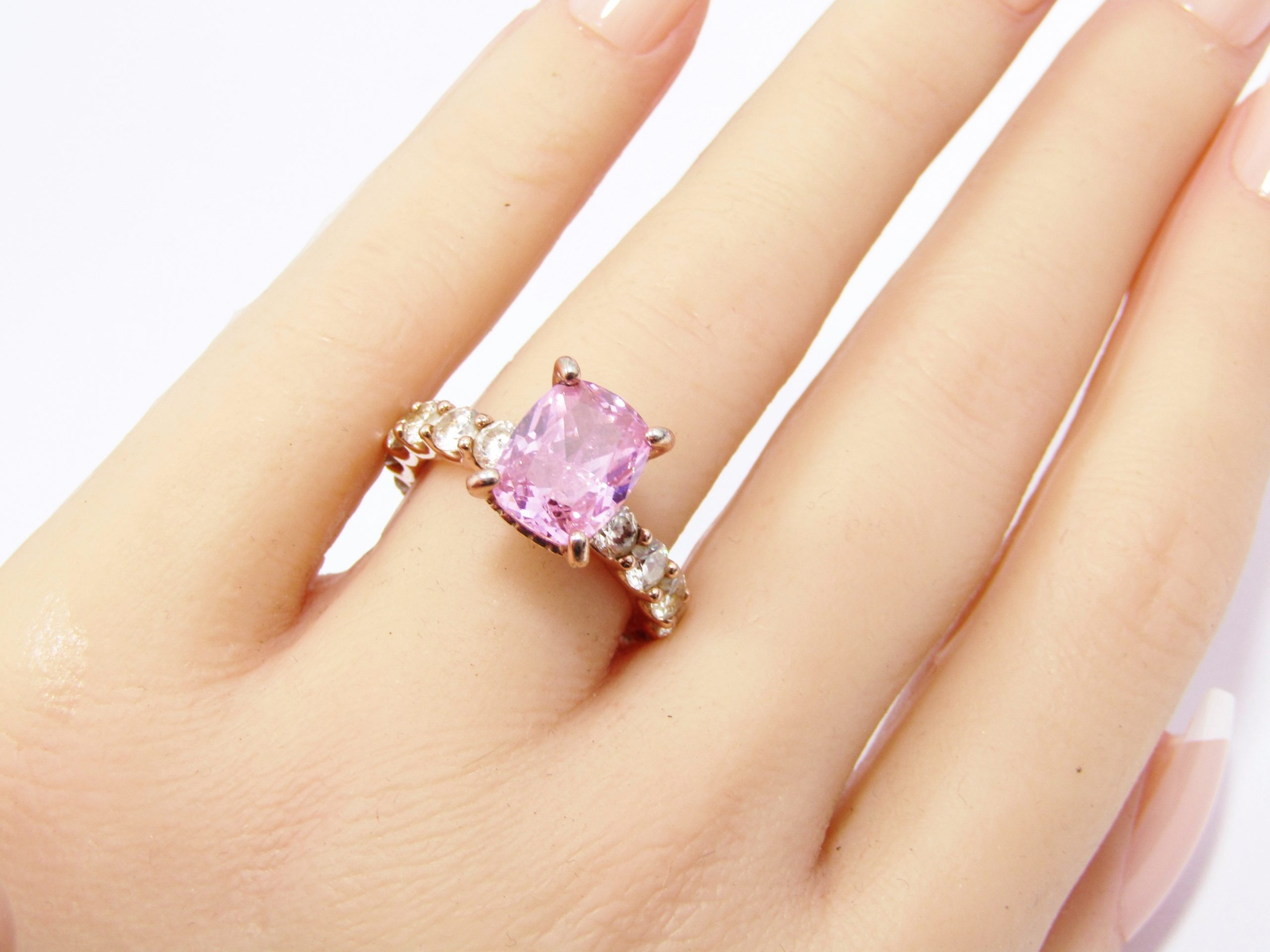A stunning, over-the-top ring in sterling silver with rose gold plating, made by jewellery company GNOCE, marked "GNOCE 925" accordingly. The ring features a large rectangular cushion cut sparkling zirconia with tiny sparkling crystals set around its mounting as well as more sparkling stones down the sides of the band. See photos for details, in excellent condition.