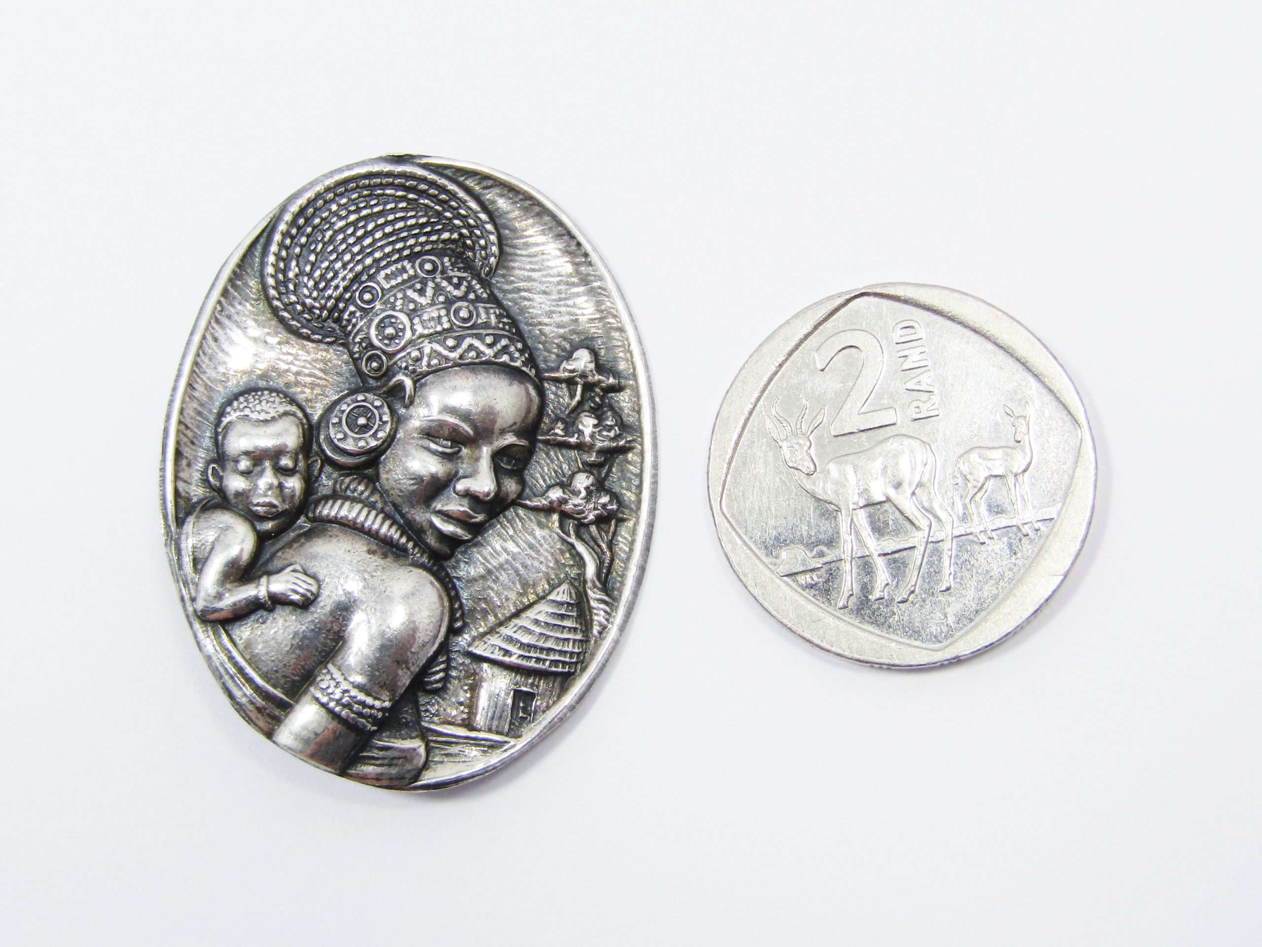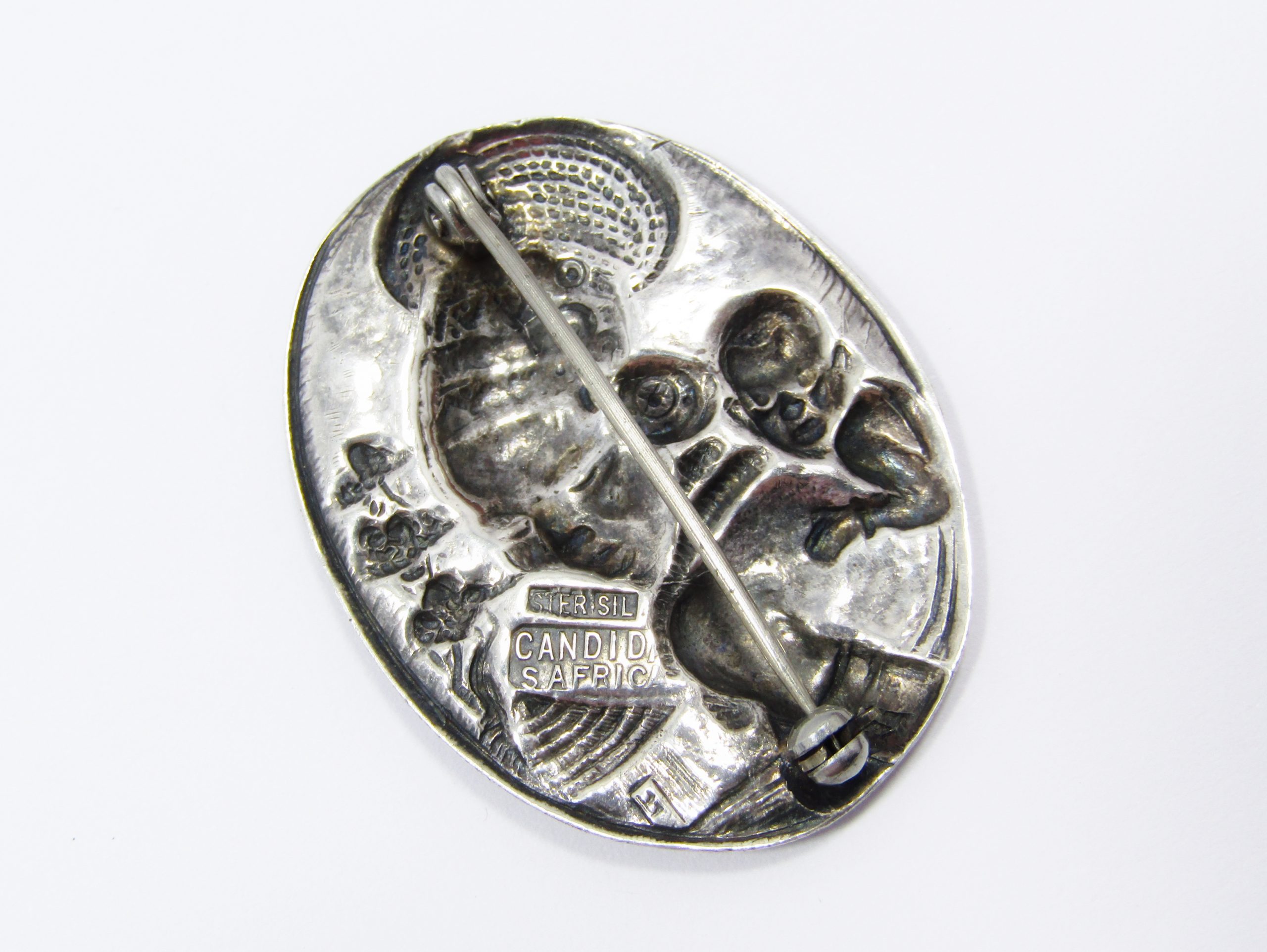 A rare, vintage Candida sterling silver brooch, with African theme of a lady in traditional headdress with baby. Marked accordingly, see photos for details.