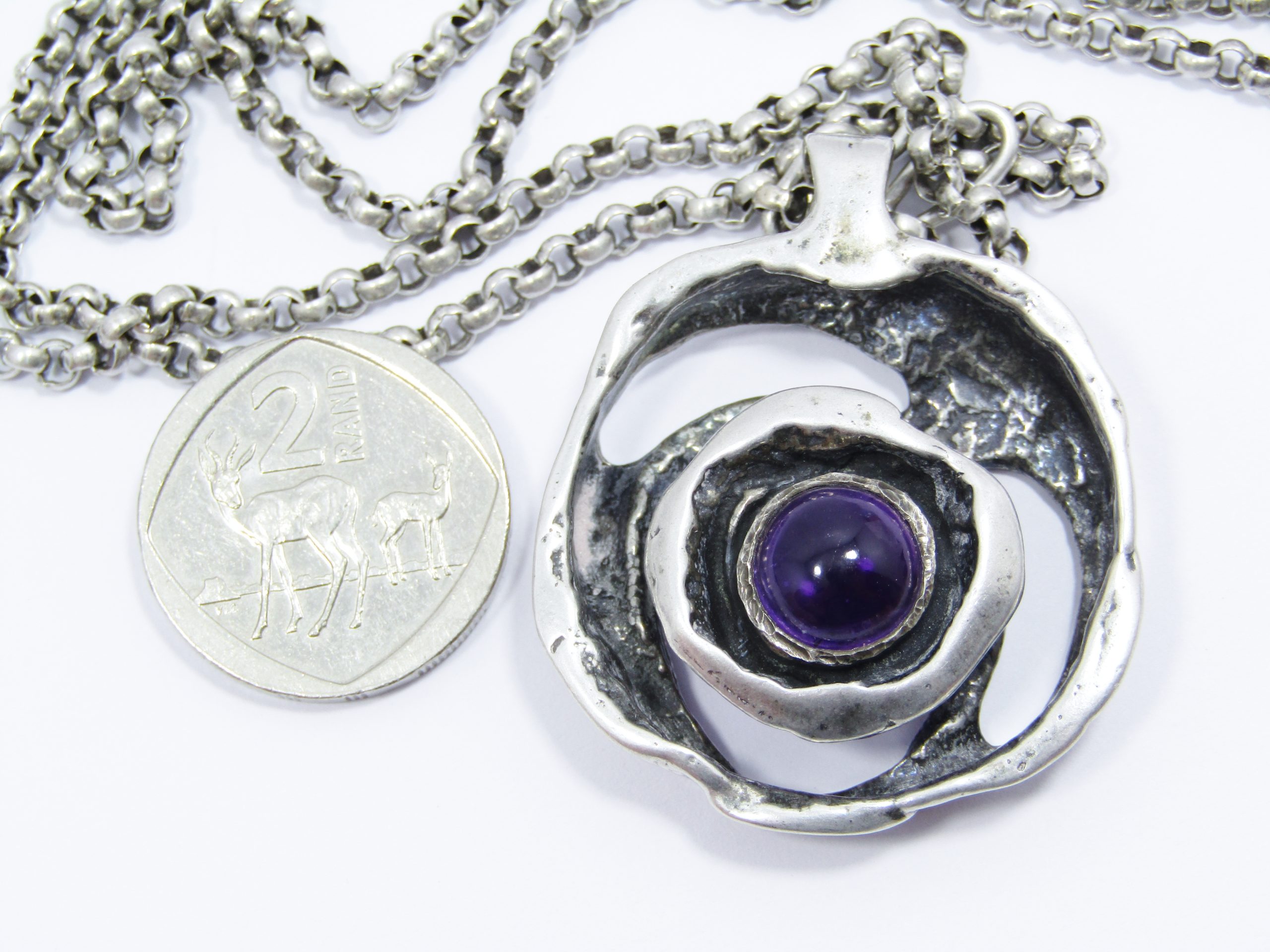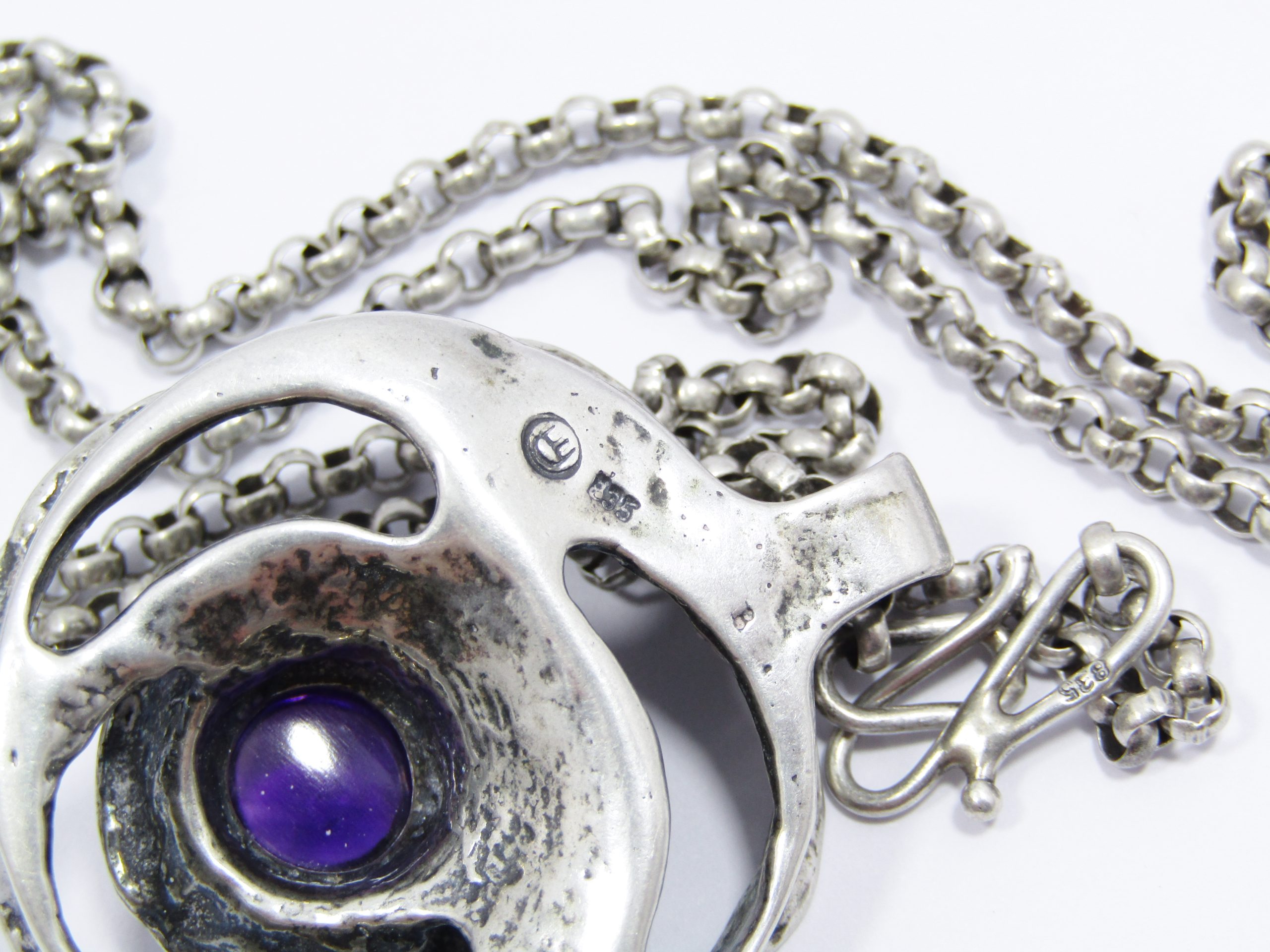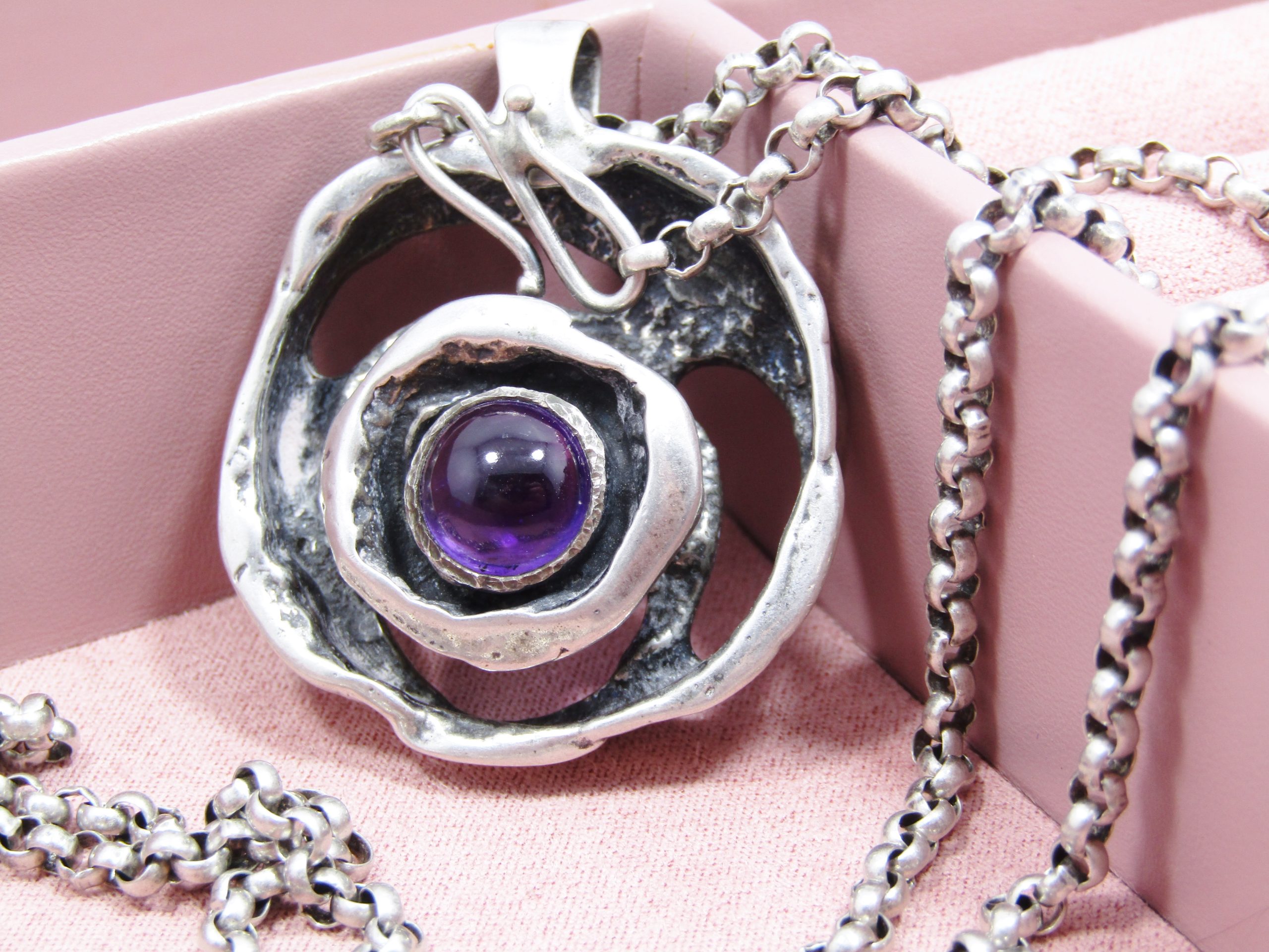 A beautiful, weighty and vintage circa 1960s Brutalist Studio Jewellery pendant and original chain by Burkhard & Monika Oly of Germany, with round amethyst cabochon. The piece is marked for 835 silver with the Oly monogram accordingly, see photos for lovely details and design.